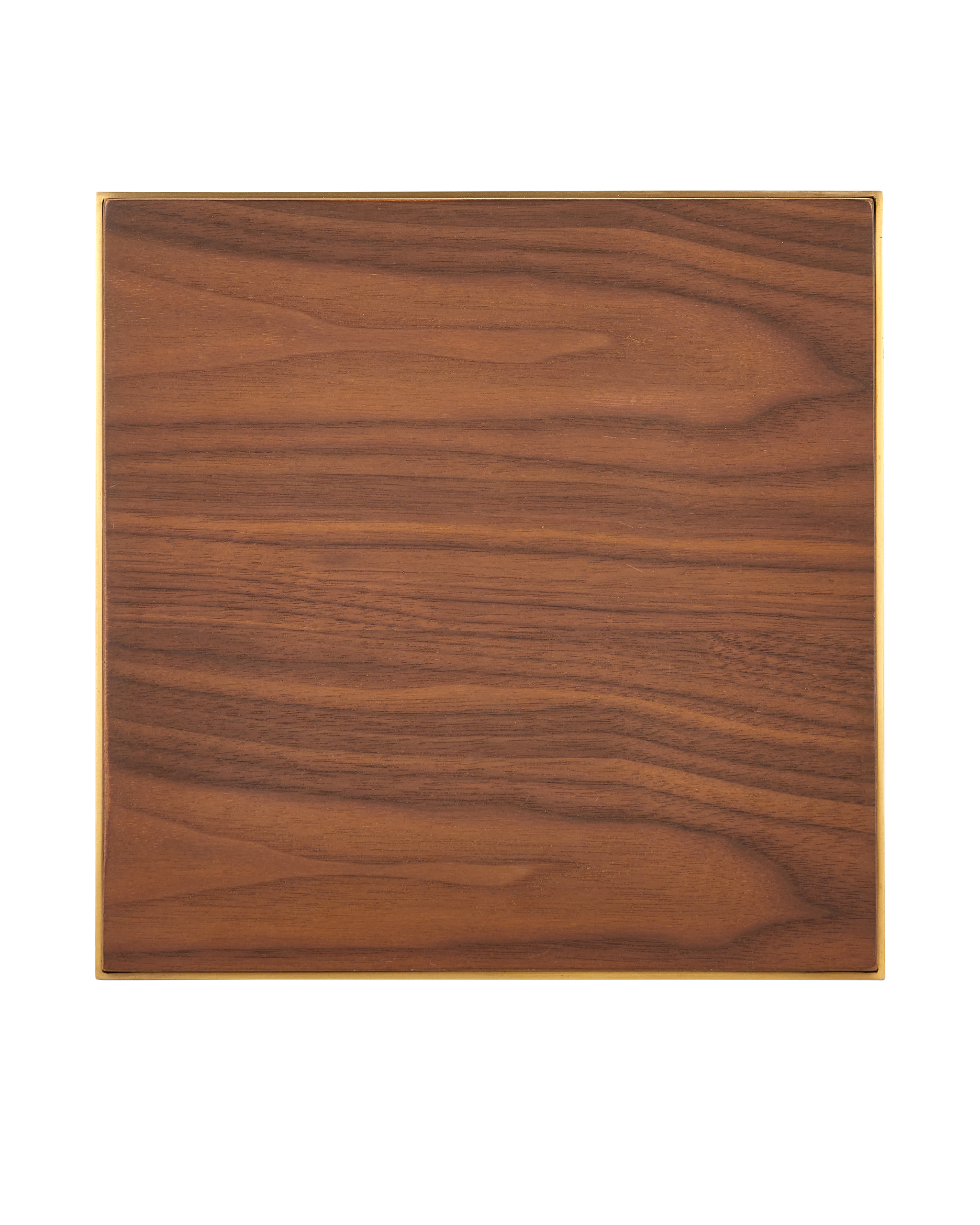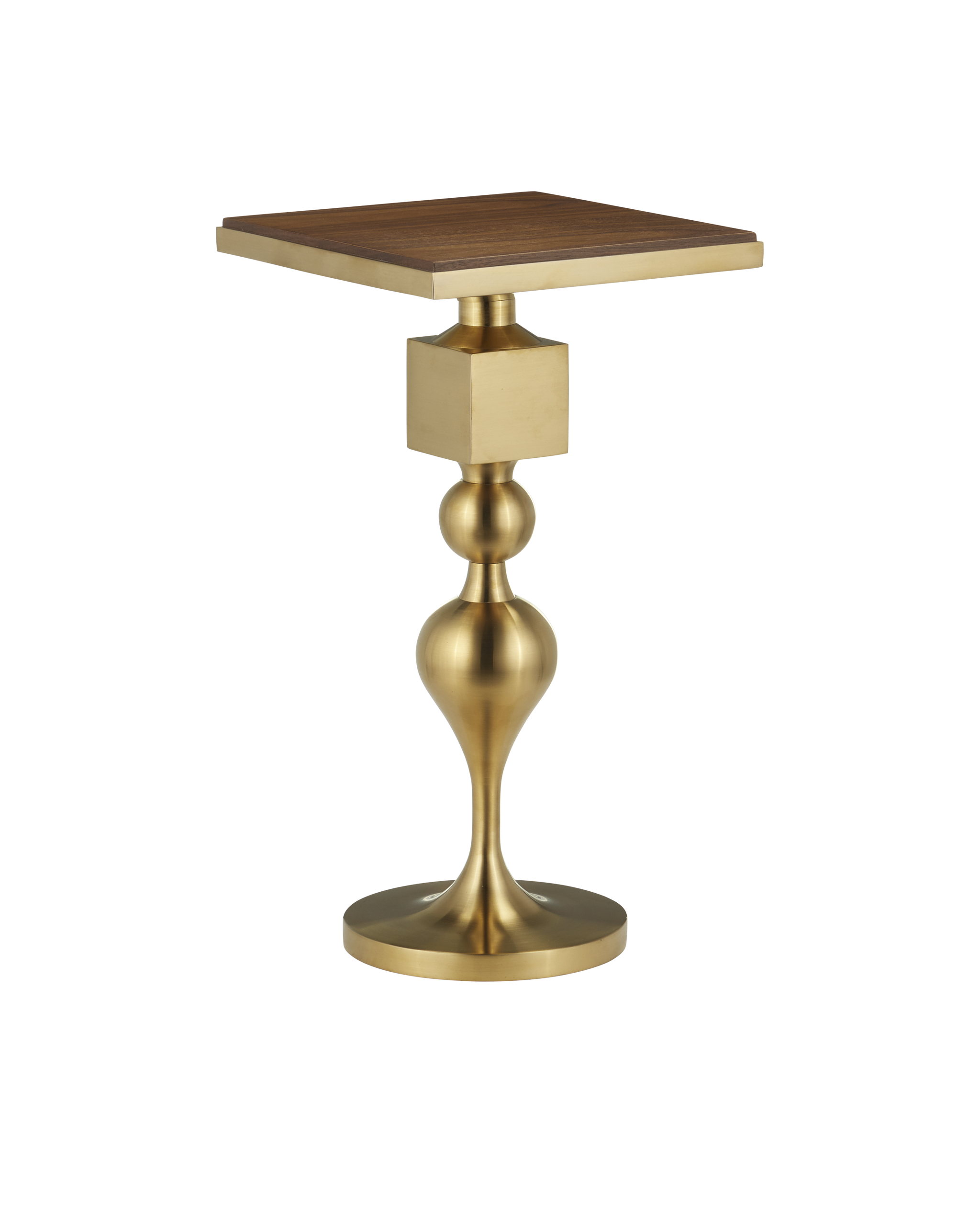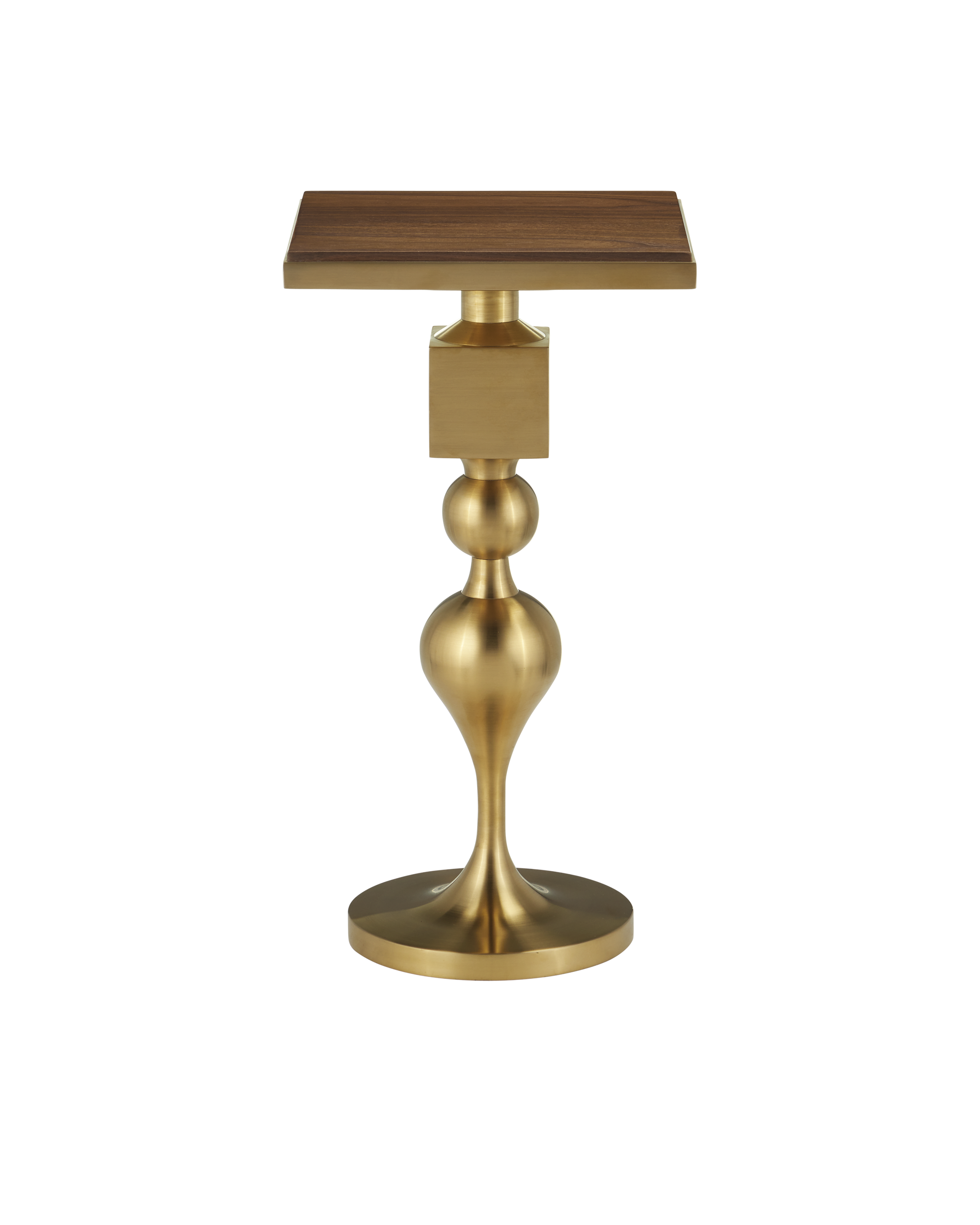 • Geometric and gorgeous, the Maeve Accent Table is made of stainless steel in a brushed brass finish with an inset walnut top. The gold accent table gets its punch from its series of stacked shapes that rise toward its top, while the square piece of wood brings an uptick in warmth.