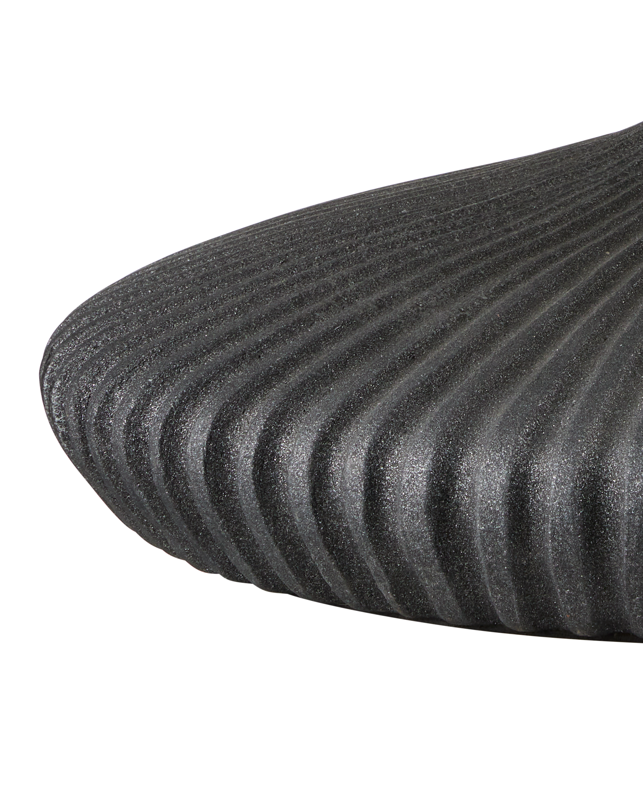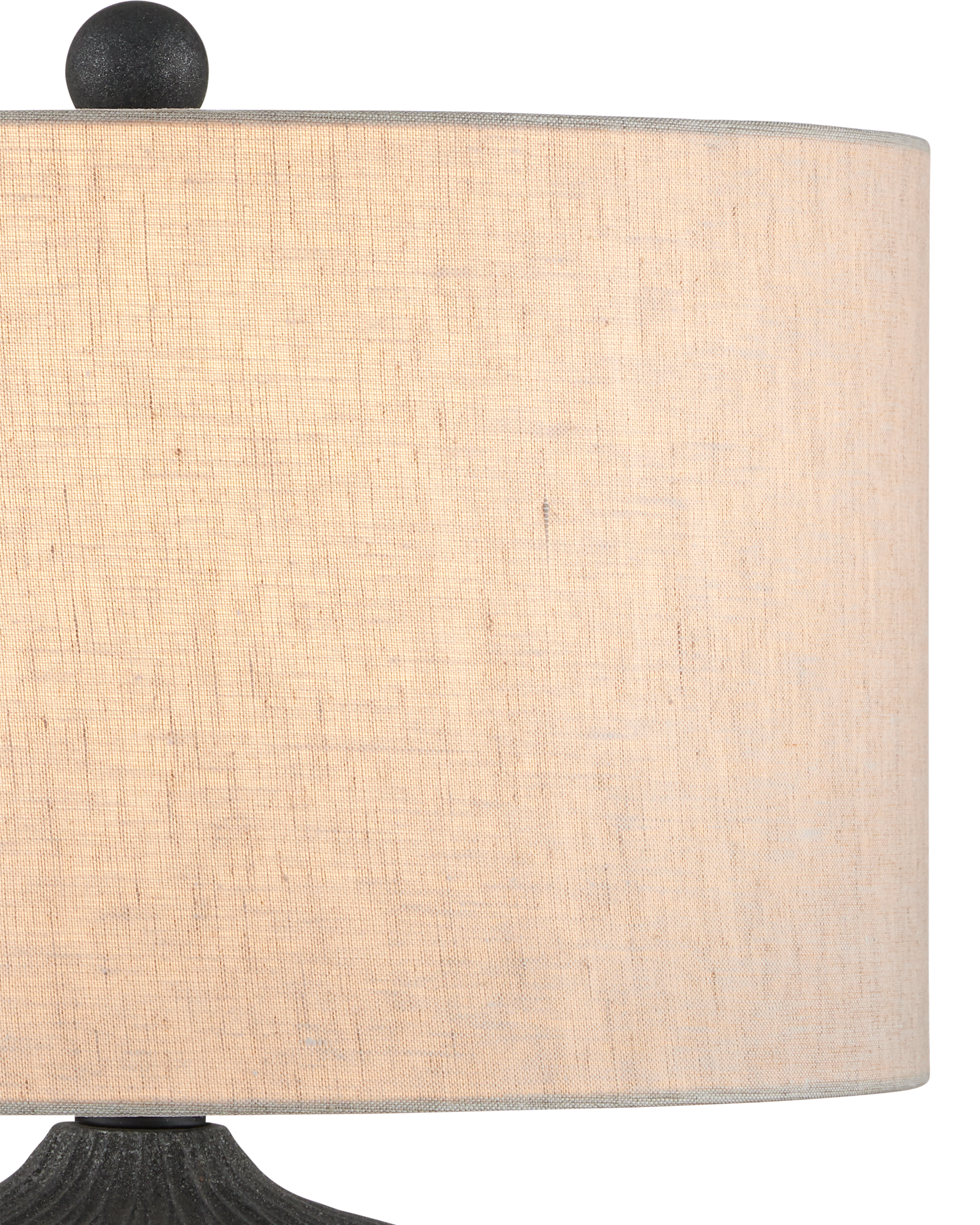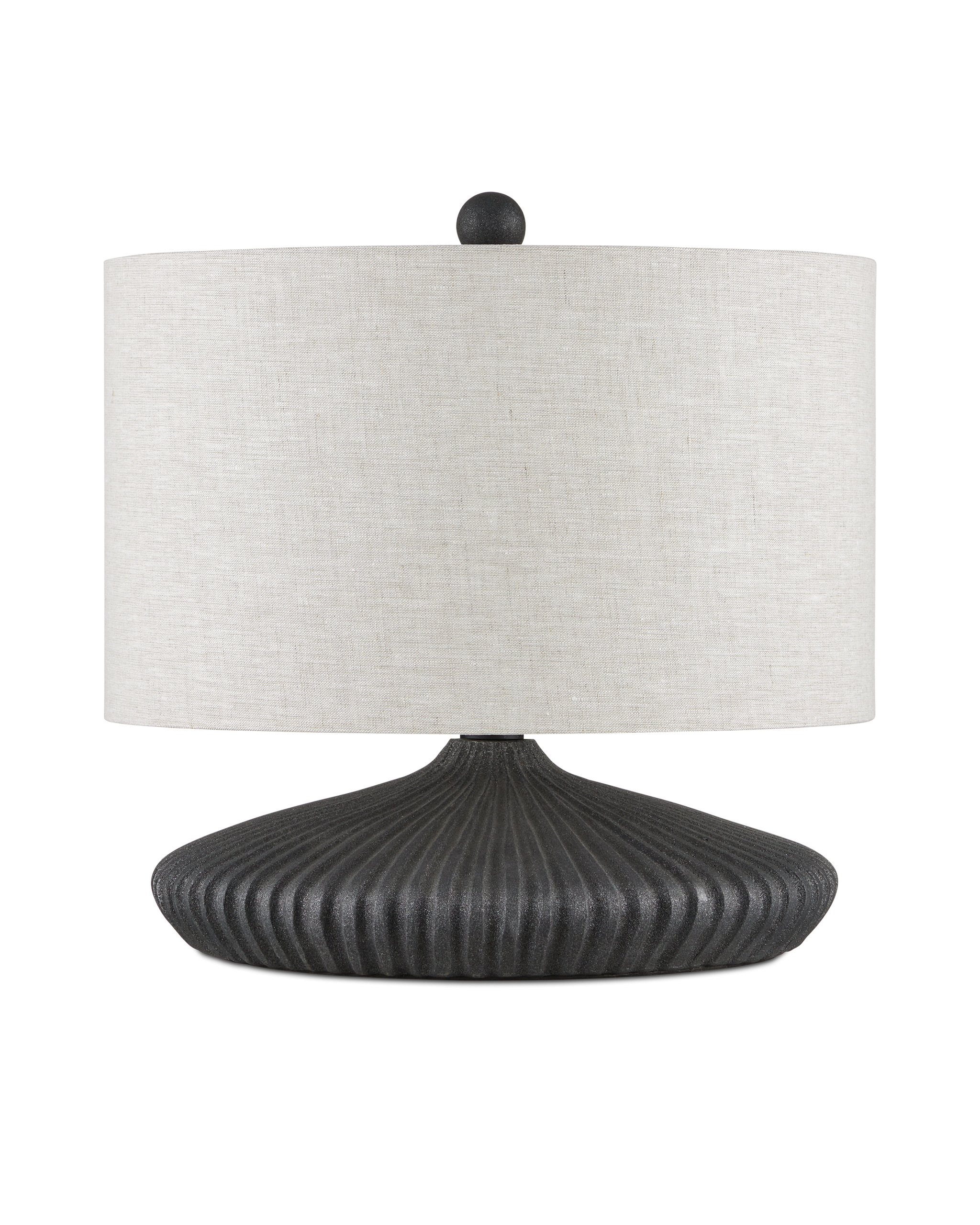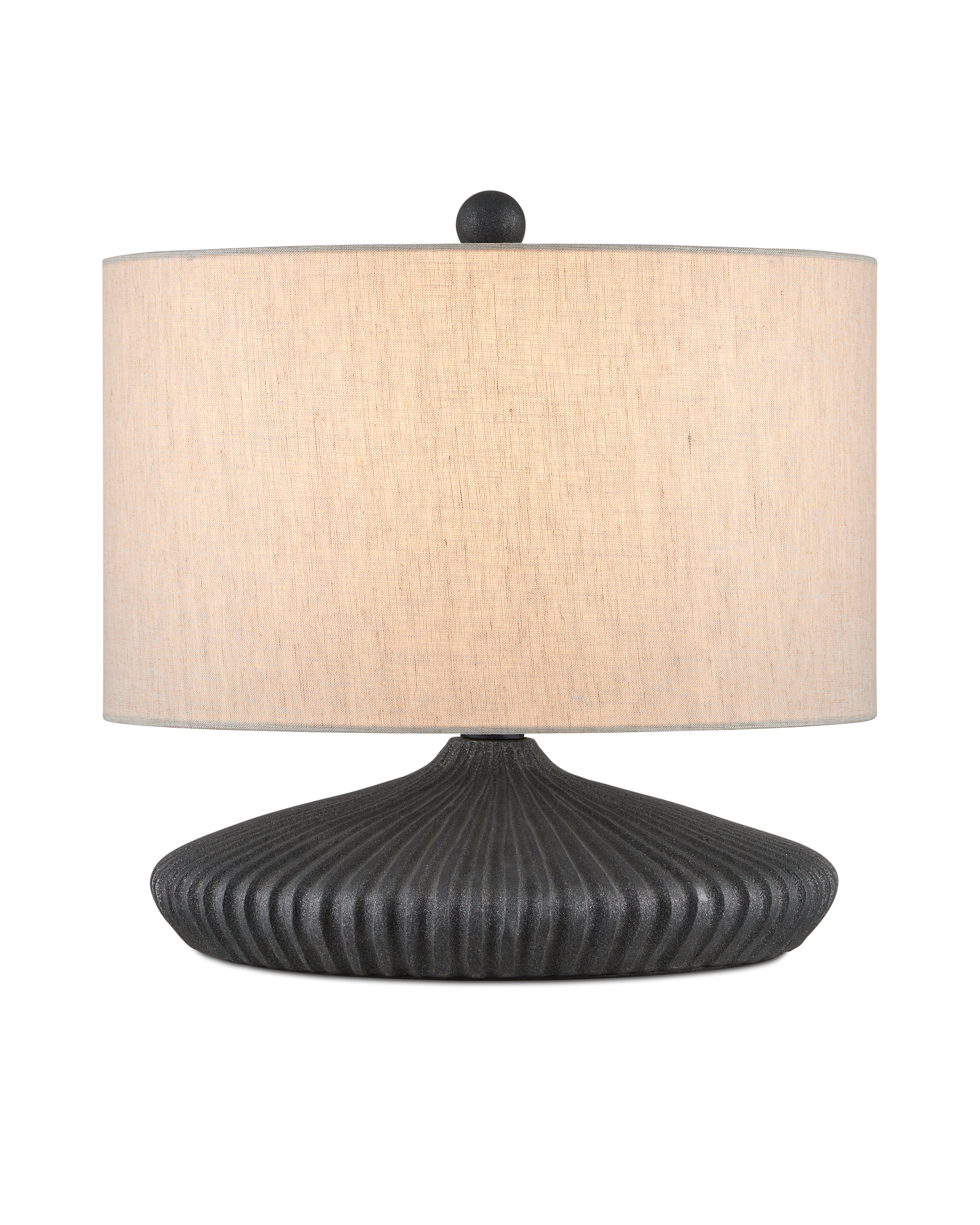 • The Mythmaker Table Lamp lives up to its name, as its squashed circular body is made of terracotta in a mix of satin black and black granite finishes that make it look as if it has been forged of iron. Though there is a slight aged feel that brings the lamp added texture, it is still modern in its lines. The oversized shade paired with the flatness of the body is a stylish design detail, as is the matching finial that fastens the shade to the lamp.
