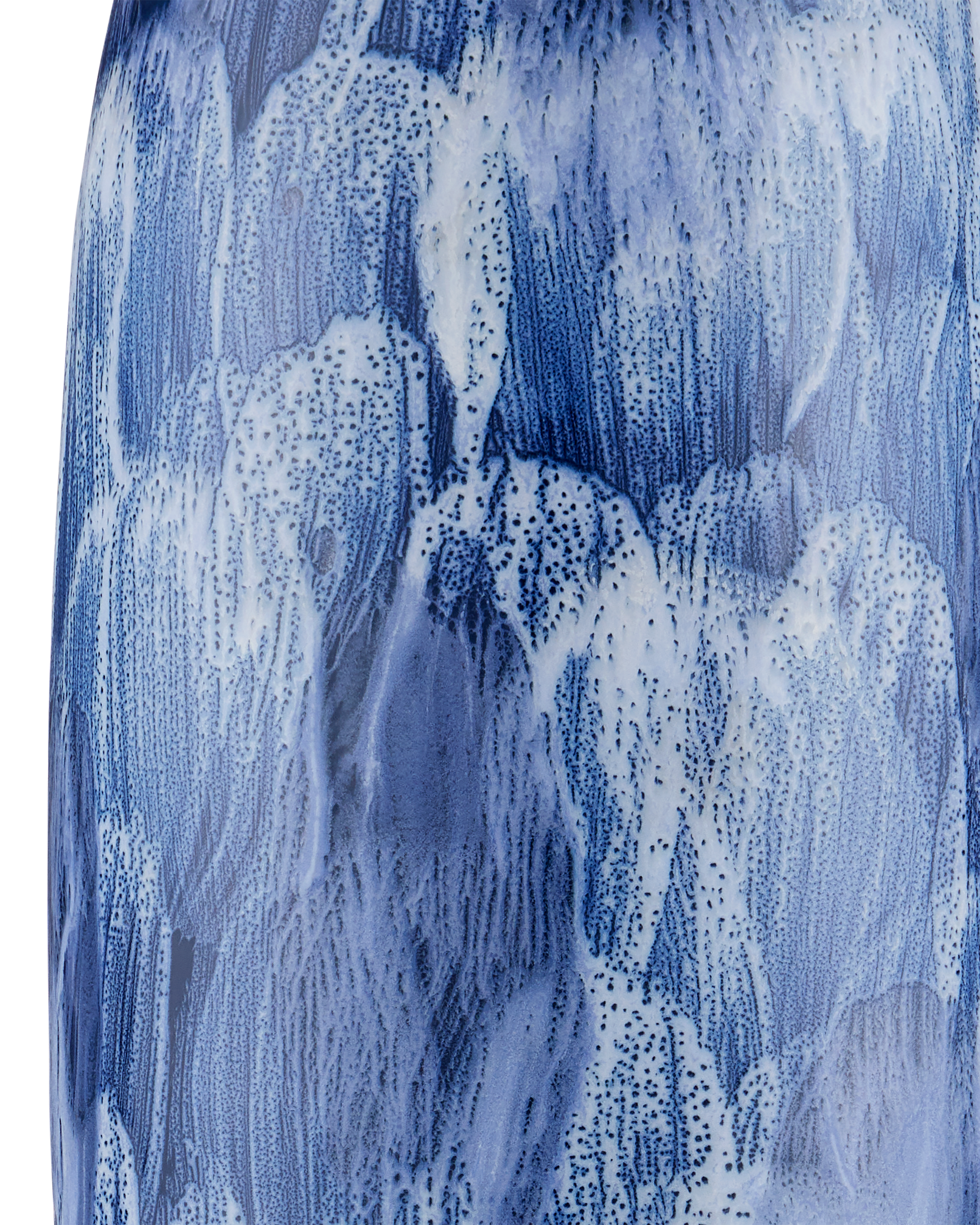 • If the body of the Pallas Table Lamp was a canvas, it would be a true work of art because it has painterly brush strokes in white on blue flowing along its surface. Illustrating the handmade aspect of this particular fixture is the white glaze that bubbles where it is thickest over the luminous blue, giving the lamp greater texture. The intermingled smudges are layered onto the lamp to achieve added artfulness.