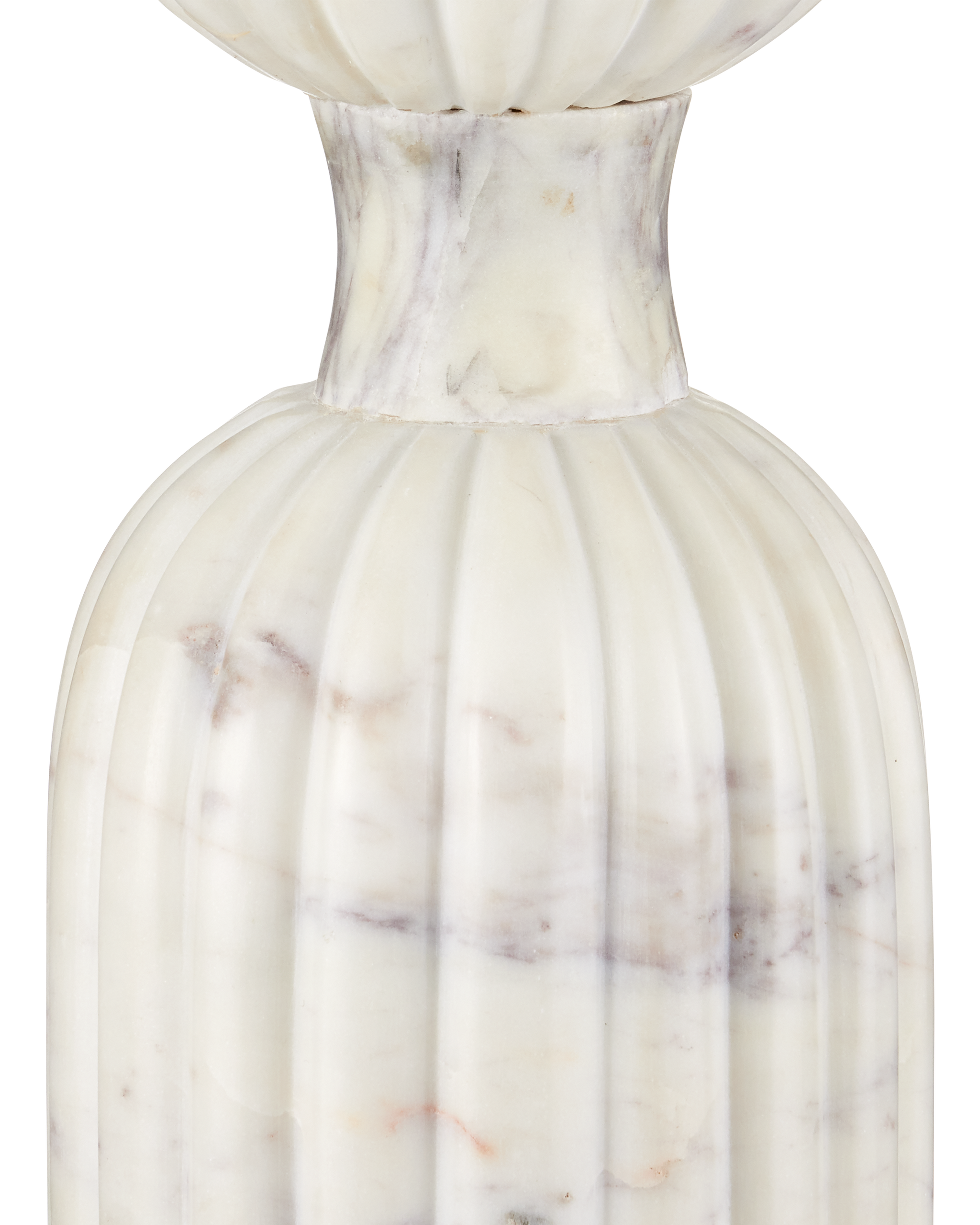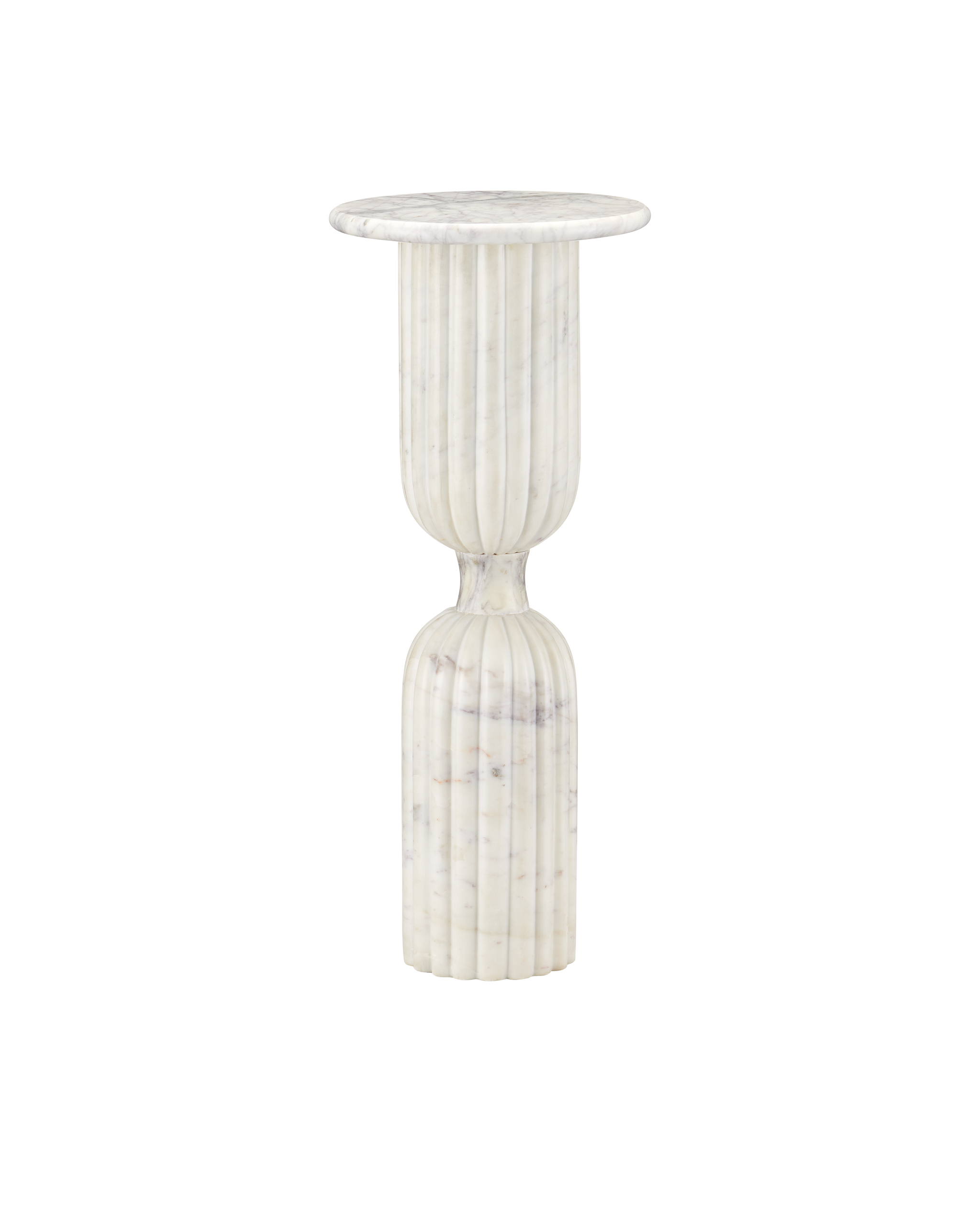 • The Passementerie Drinks Table is a sculptural statement piece crafted from exquisite Banswara marble, known for its striking white surface with subtle purple veining. The tall, slender pedestal is carved to mimic two interconnected tassels—one rising toward the tabletop and the other descending toward the floor, the two cinched in the middle to create a captivating silhouette. The white table measures just over 27 inches tall while the top is 11 inches in diameter.