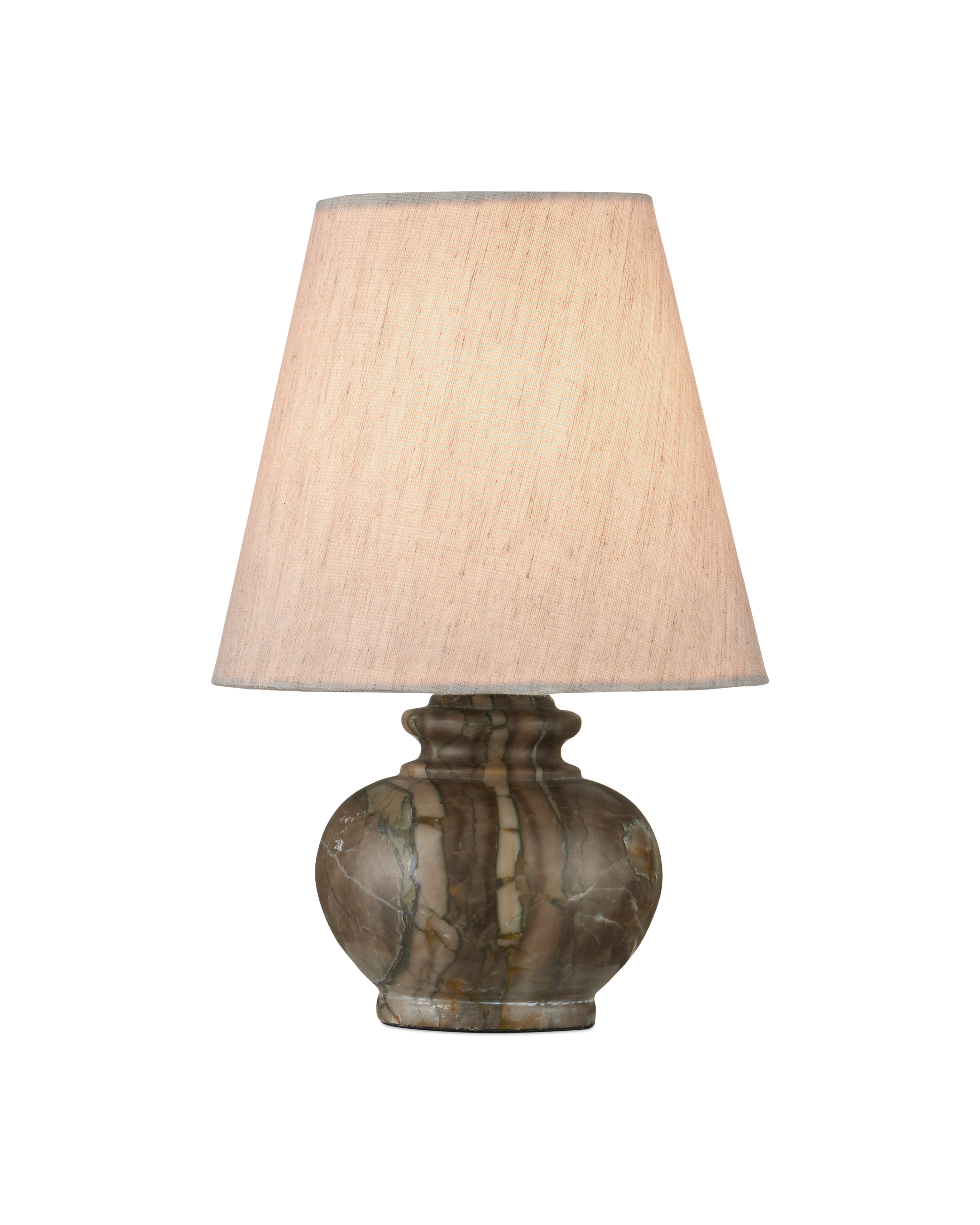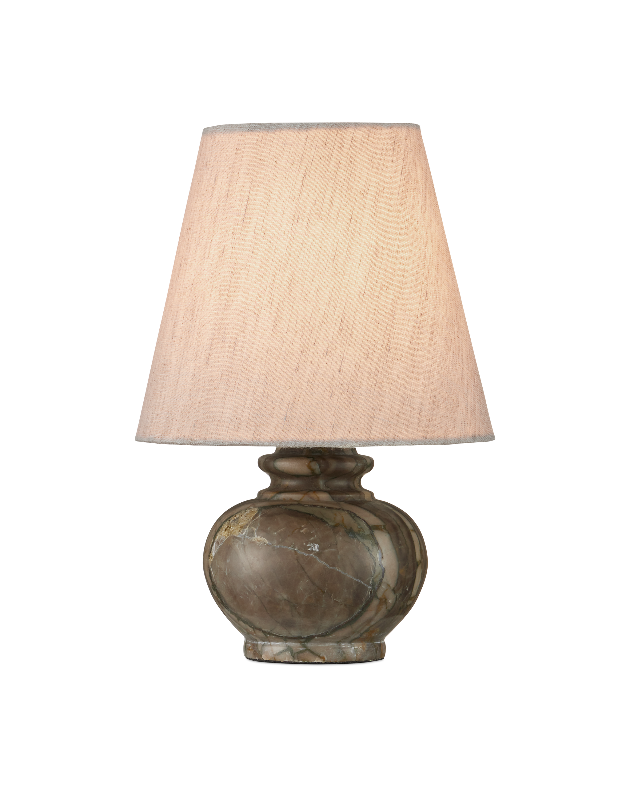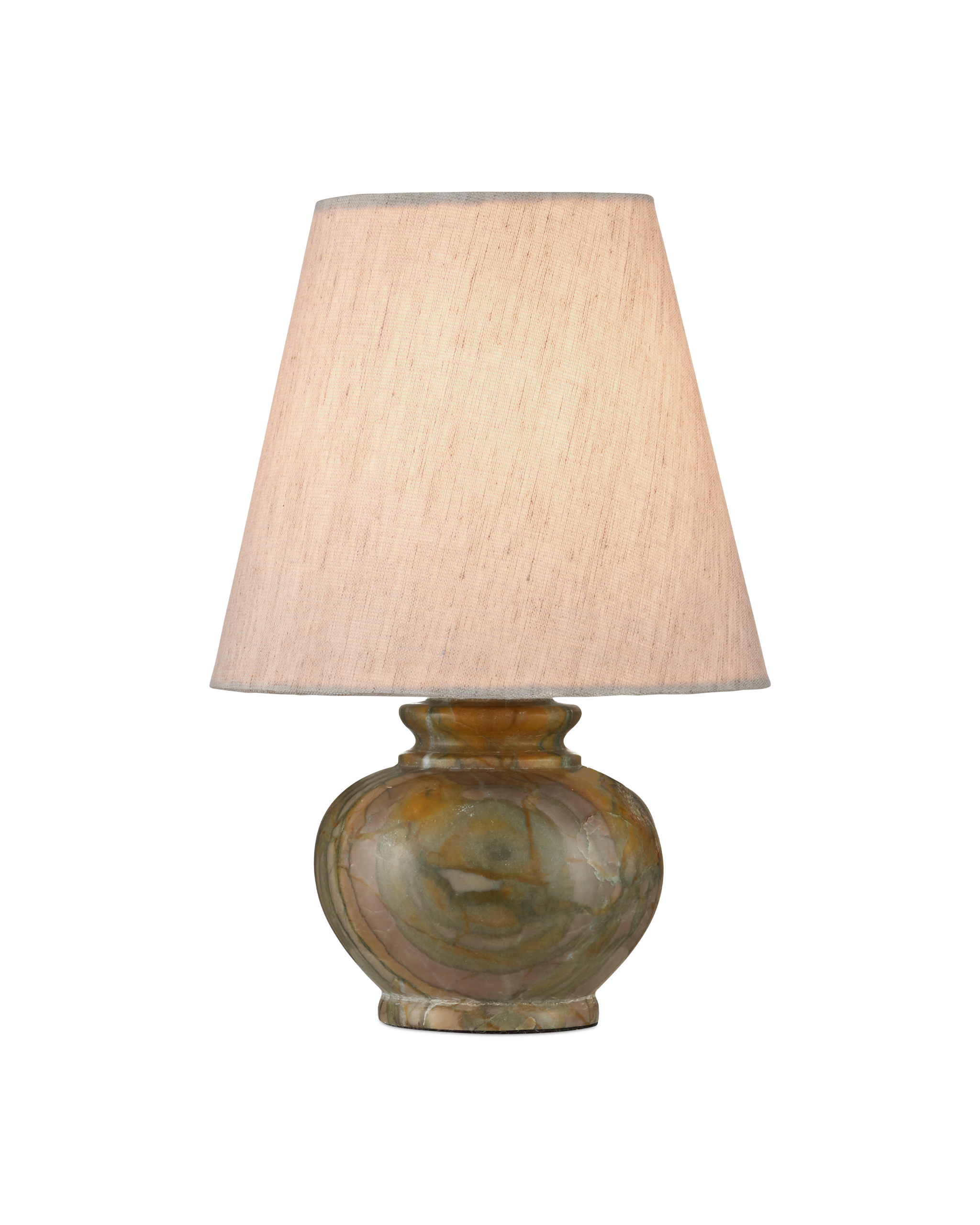 • The Piccolo Pistachio Mini Table Lamp is a very petite lamp made of Pistachio Green marble that was modeled after a vintage design. At only 4.5 inches high to the bottom of the shade, it fits into most tight spots like bookcases, though the beauty of the natural material will make it a standout in more commanding decorative arrangements. Because the marble is a stone, no two lamps will be exactly alike. The Piccolo is fitted with an off-white linen shade.