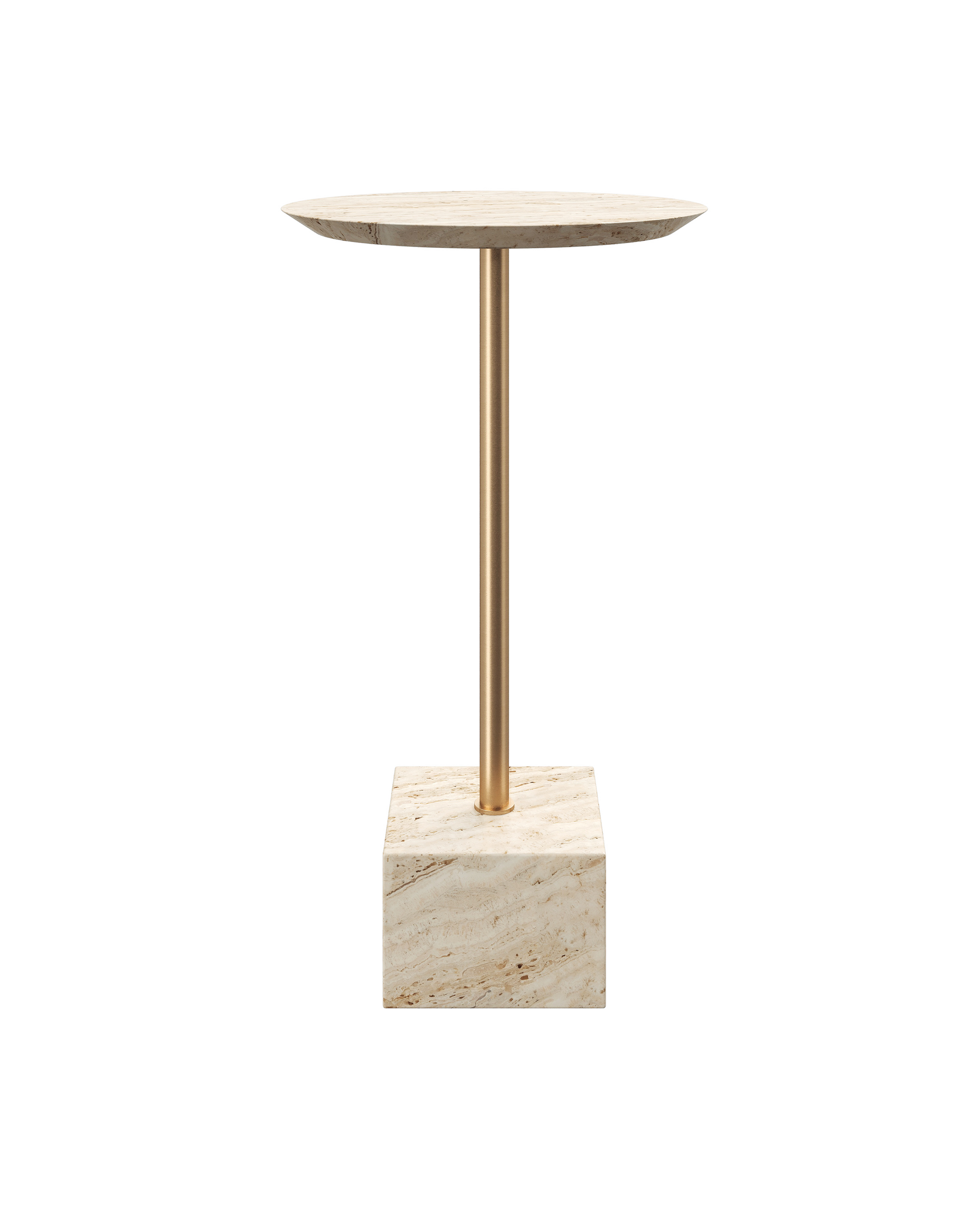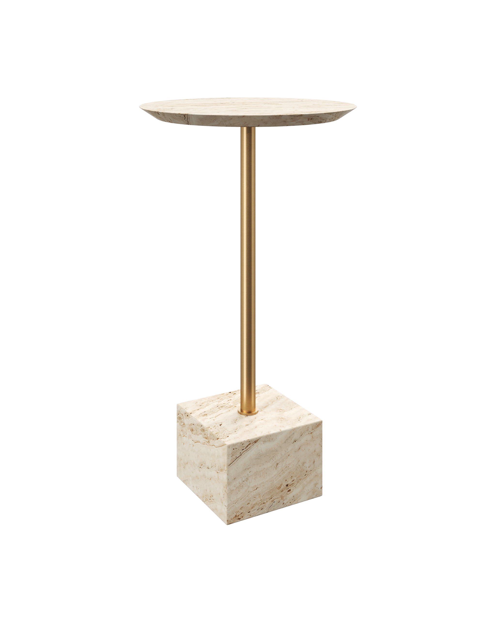 • The Miles Travertine Drinks Table is made from alternating layers of bisque-colored travertine and gleaming metal in a polished brass finish. The design creates a dynamic visual rhythm as it rises from the floor in the interplay of materials and the variation of thickness and thinness. The rich brass tones enhance the darker veining in the travertine, which is a natural stone so surfaces will vary from table to table.