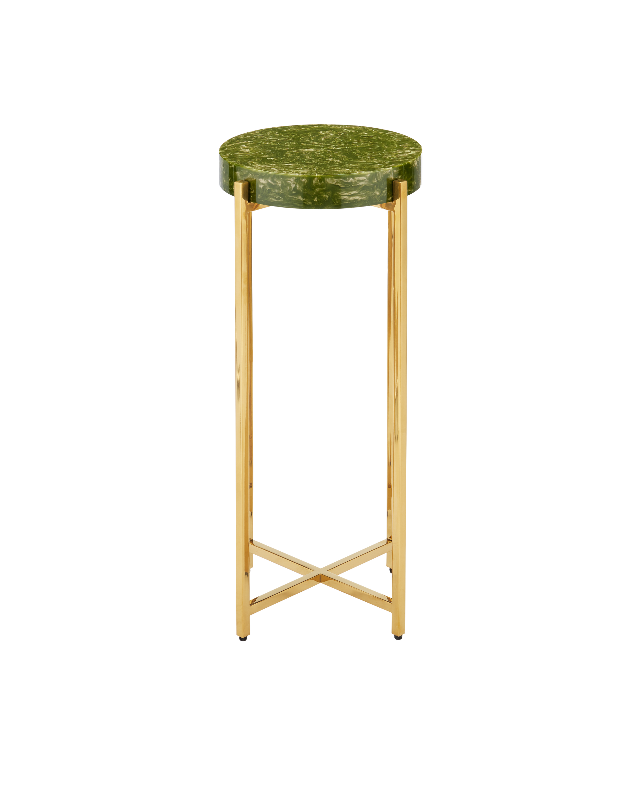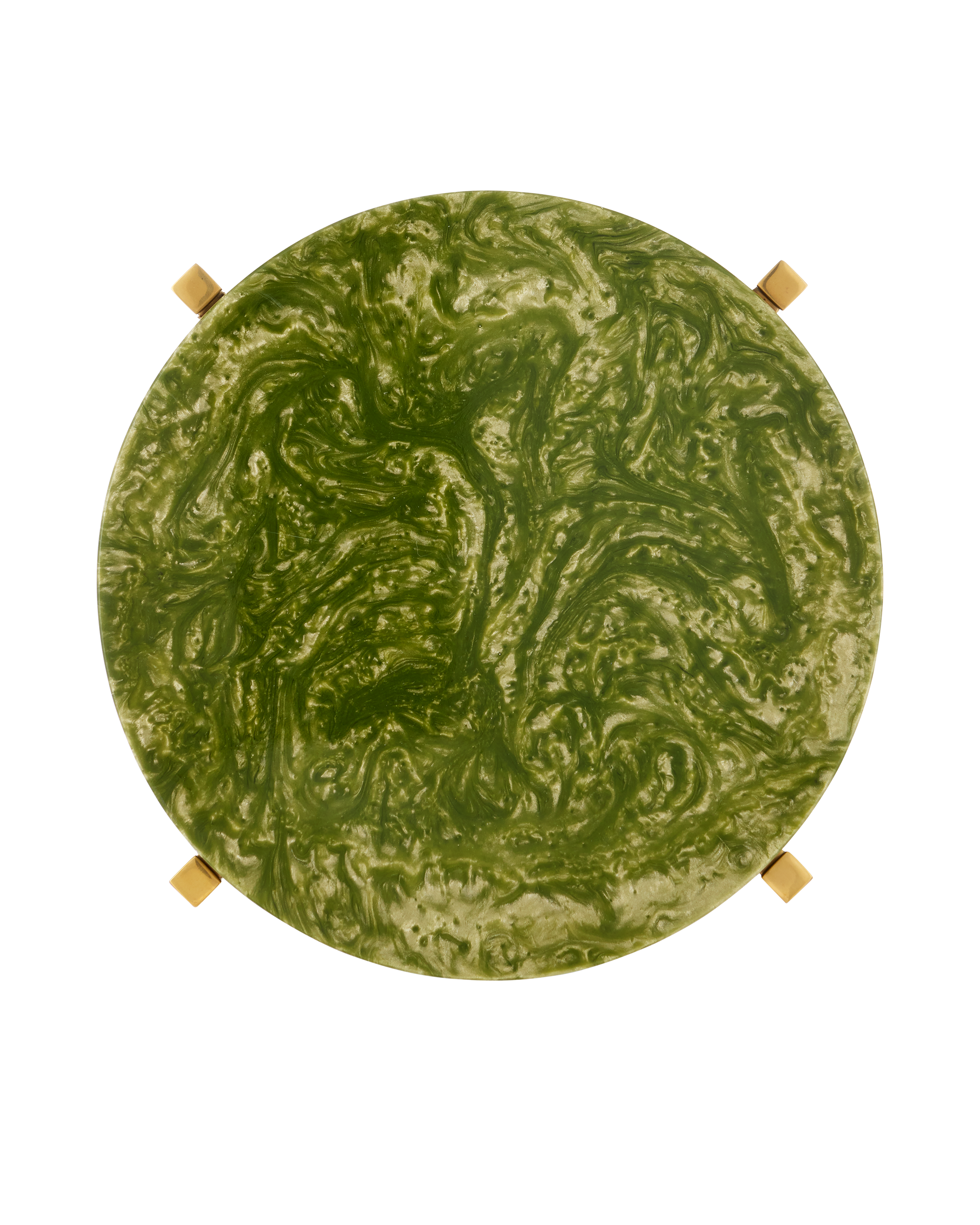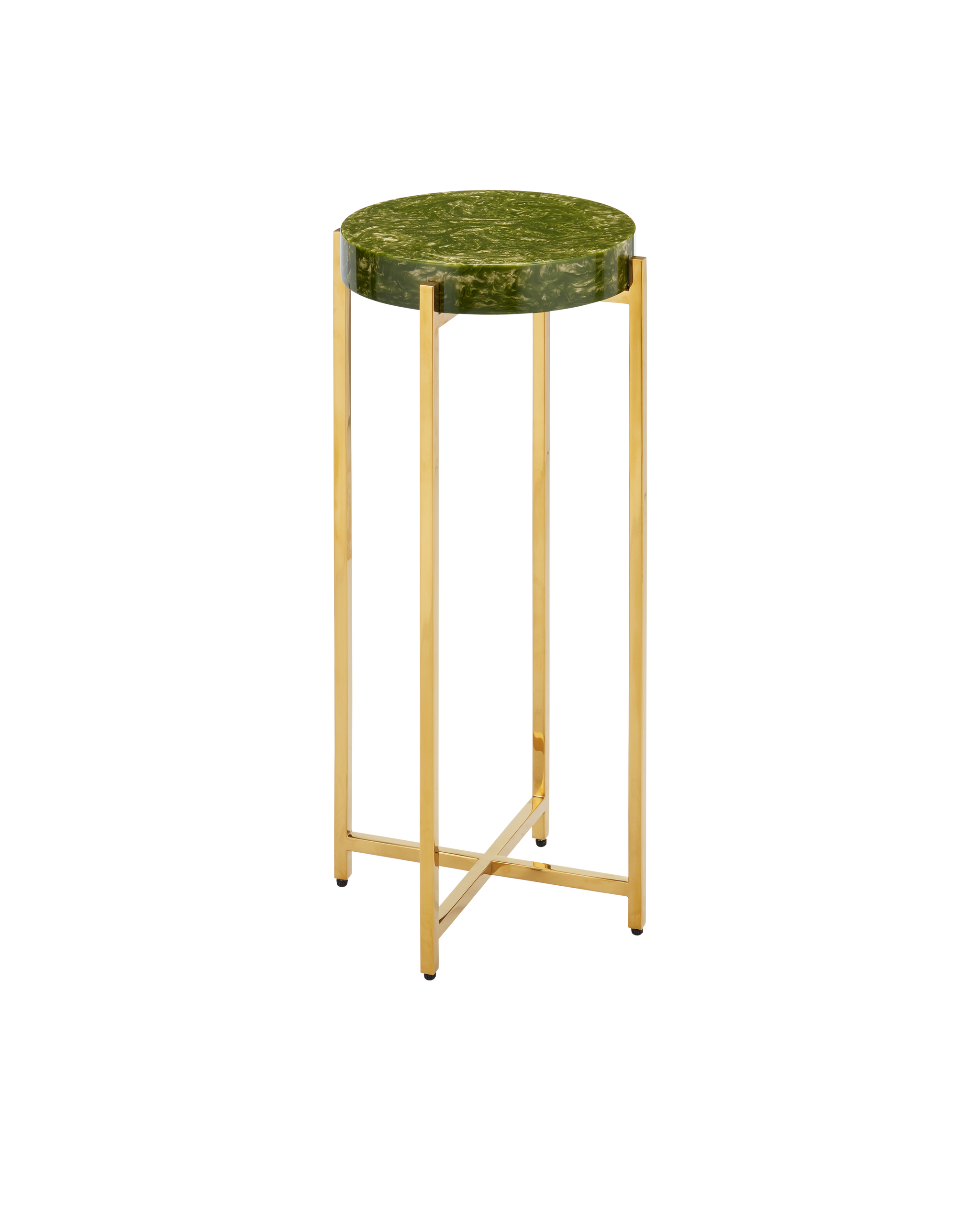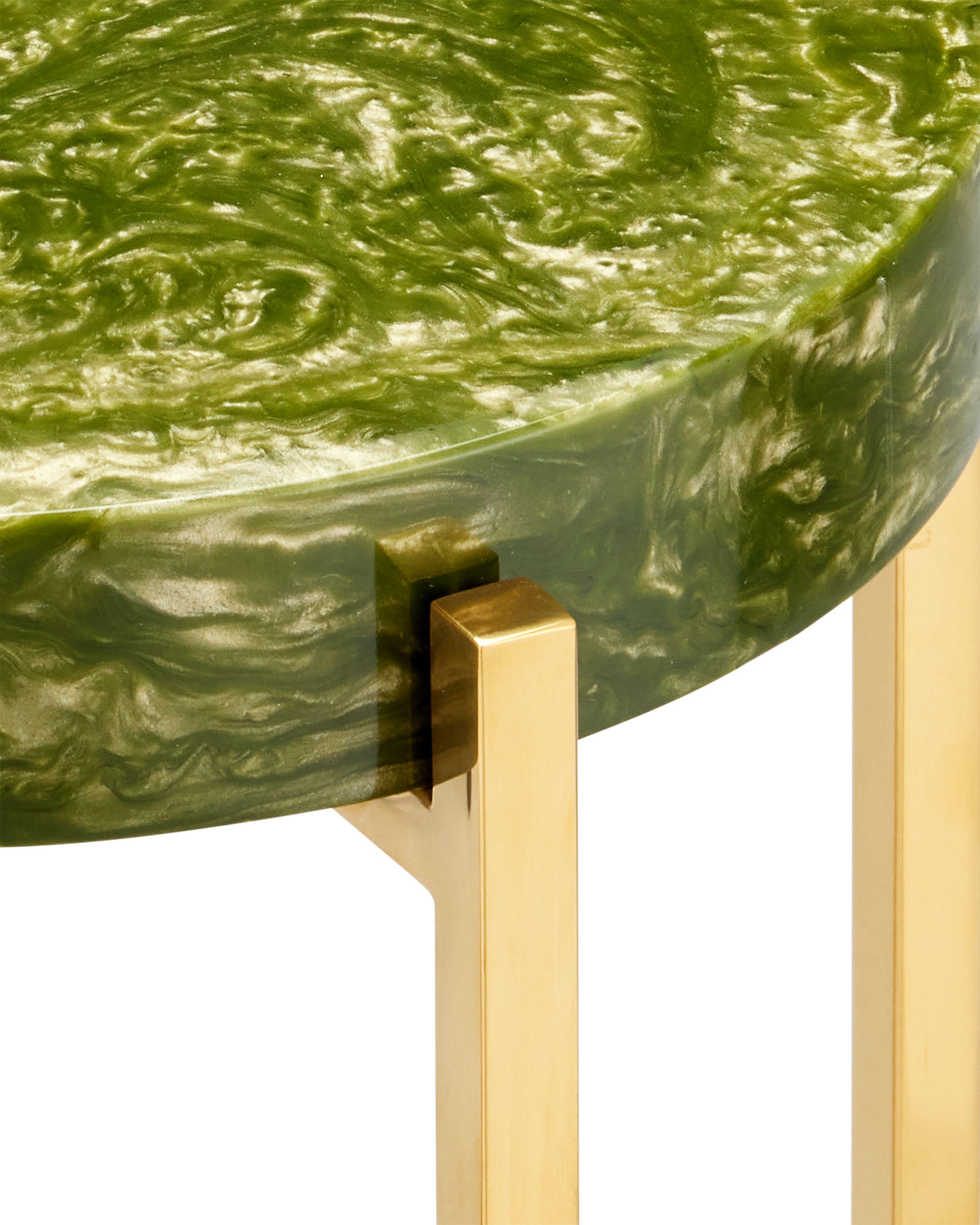 • The Rina Green Drinks Table has a top with a swirling surface created when pearlescent powder was mixed with composite to create the organic patterning. The round disc is inset into the metal frame like a gem. Four legs made of stainless steel in a warm brass finish are connected by an ex-shaped stretcher. The gold and green drinks table stands just over 23e inches tall and is 11 inches in diameter, which makes it ideal for rooms where space is limited.