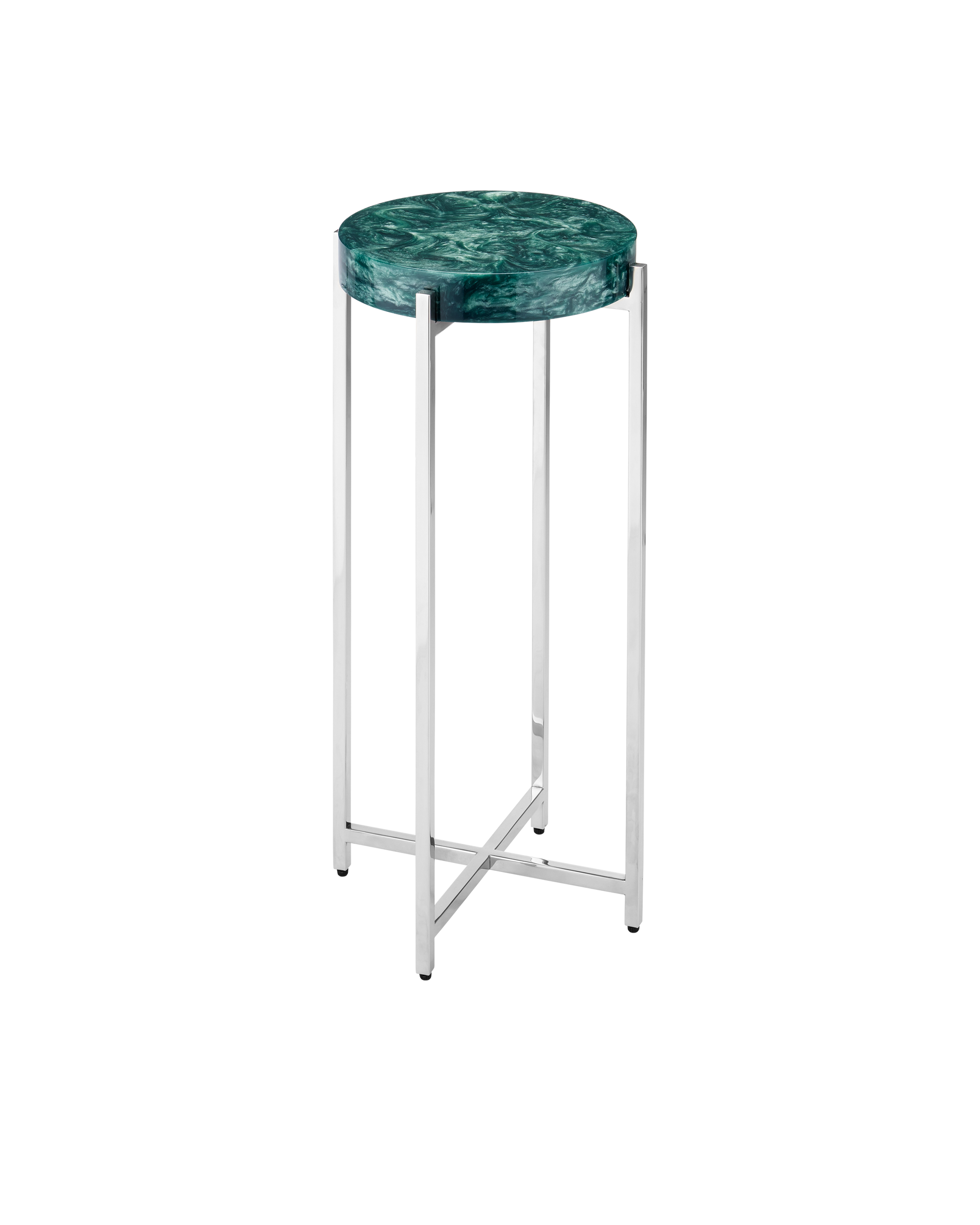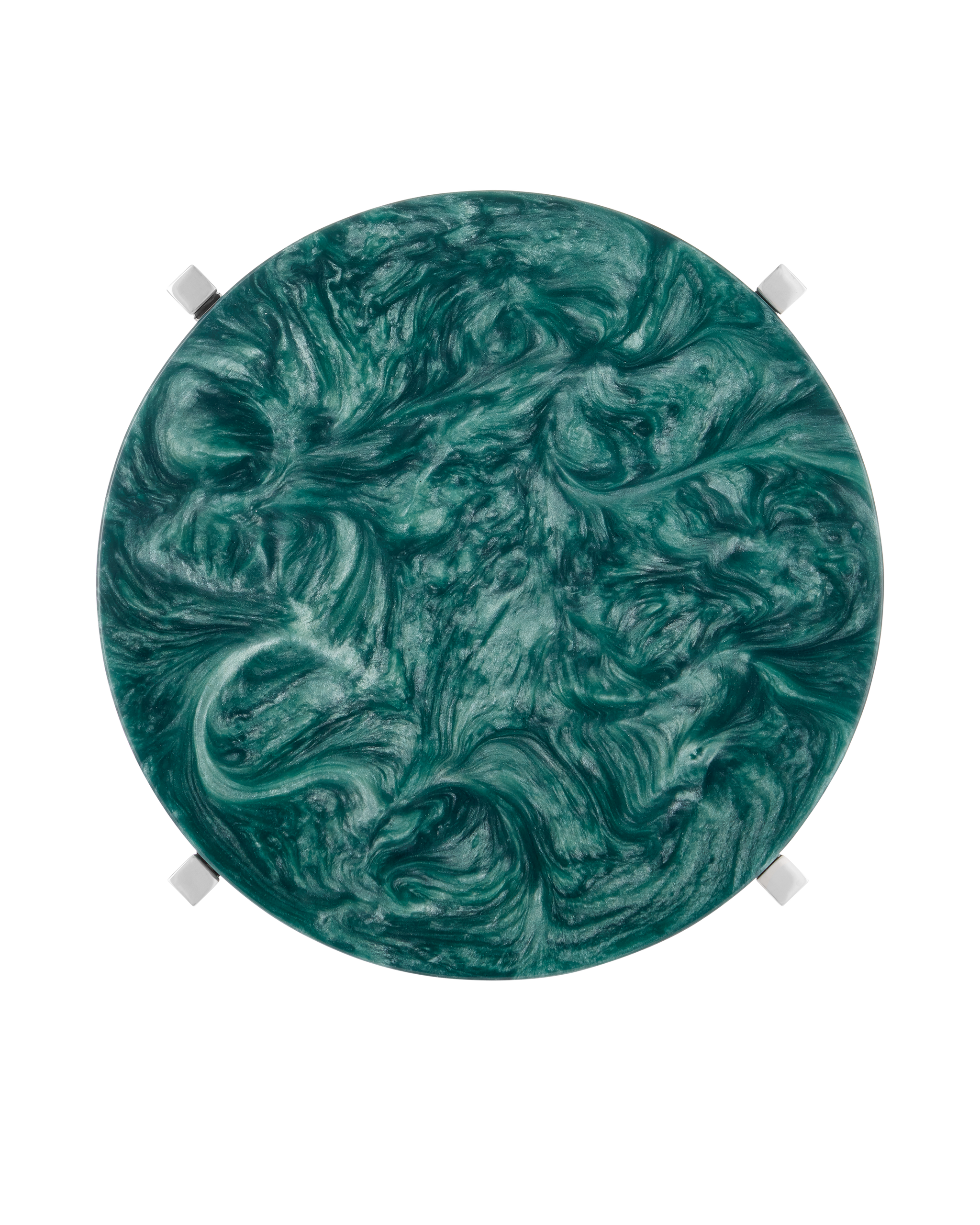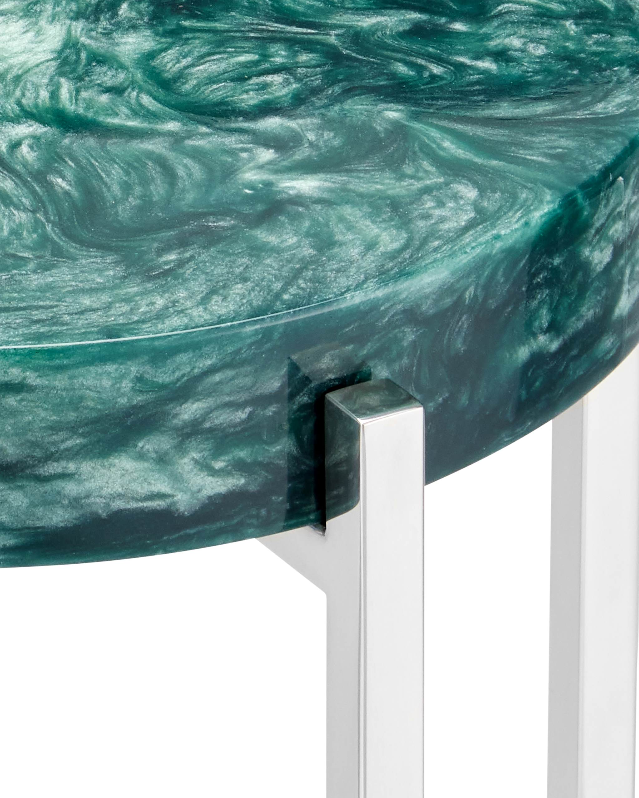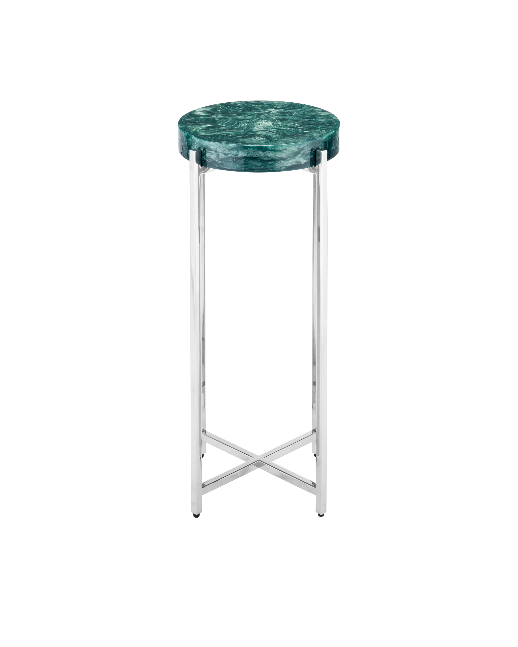 • The Rina Teal Drinks Table has a top with a swirling surface created when pearlescent powder was mixed with composite to create the organic patterning. The round disc is inset into the metal frame like a gem. Four legs made of stainless steel in a polished nickel finish are connected by an ex-shaped stretcher. The silver and teal drinks table stands just over 23 inches tall and is 11 inches in diameter, which makes it ideal for rooms where space is limited.
