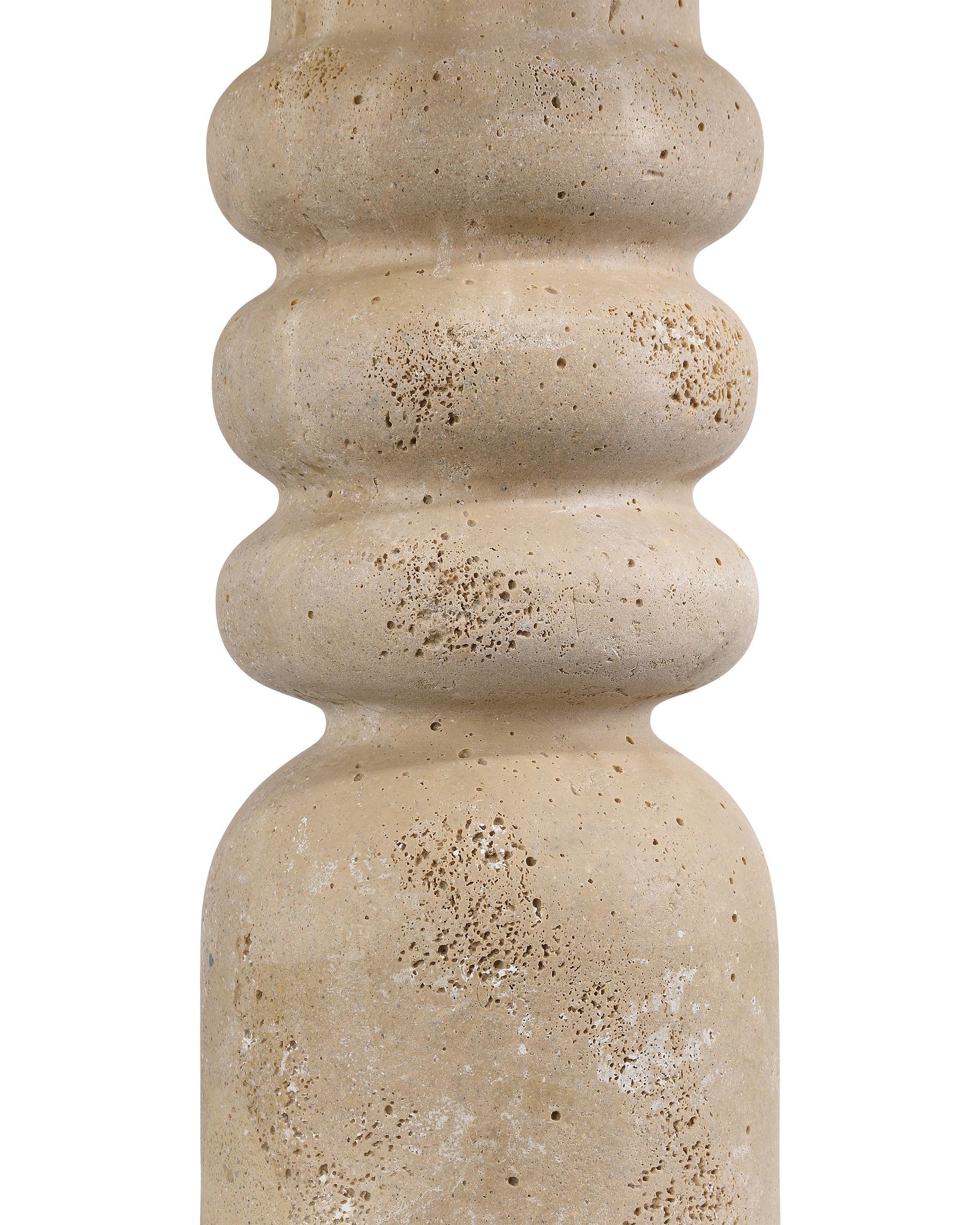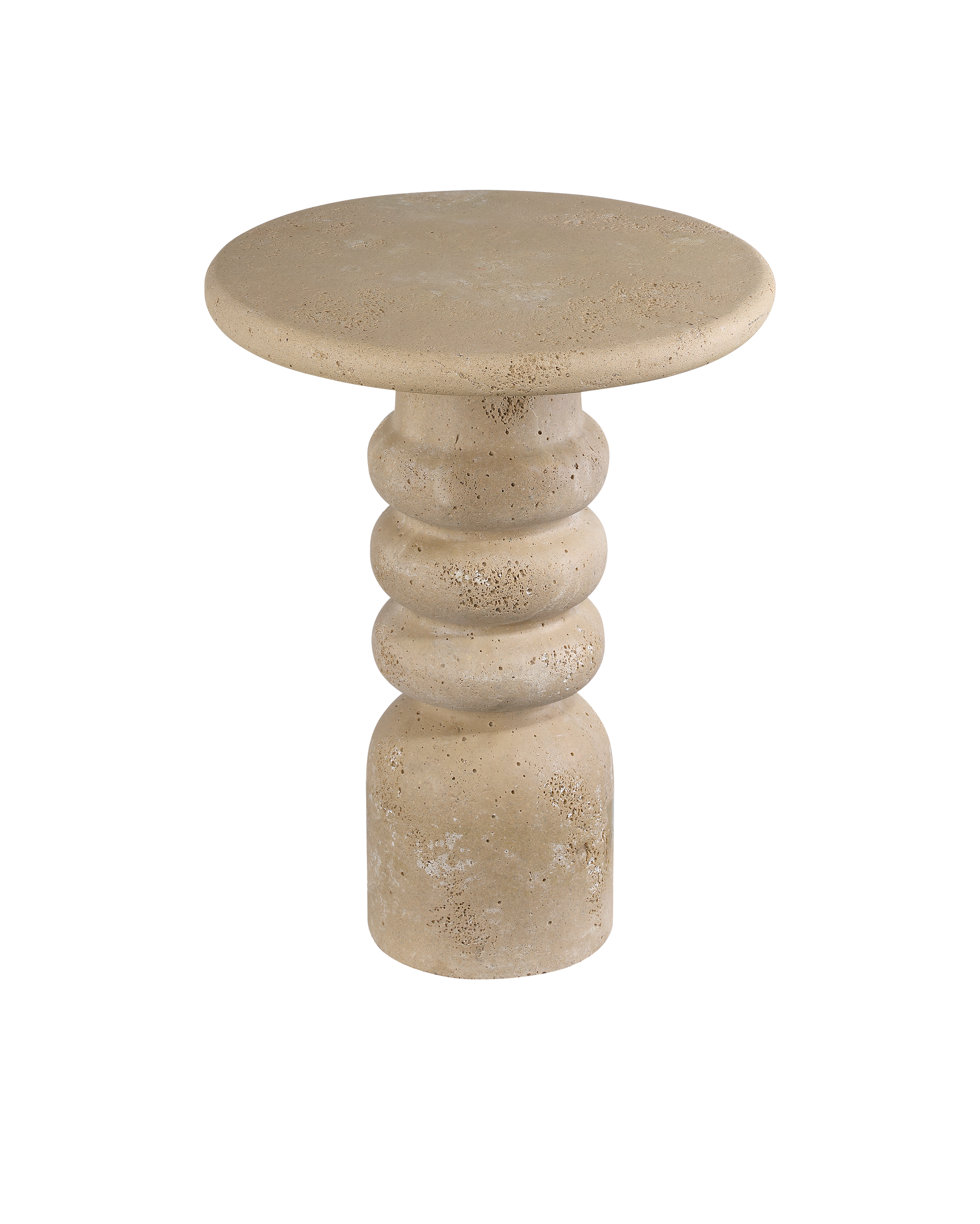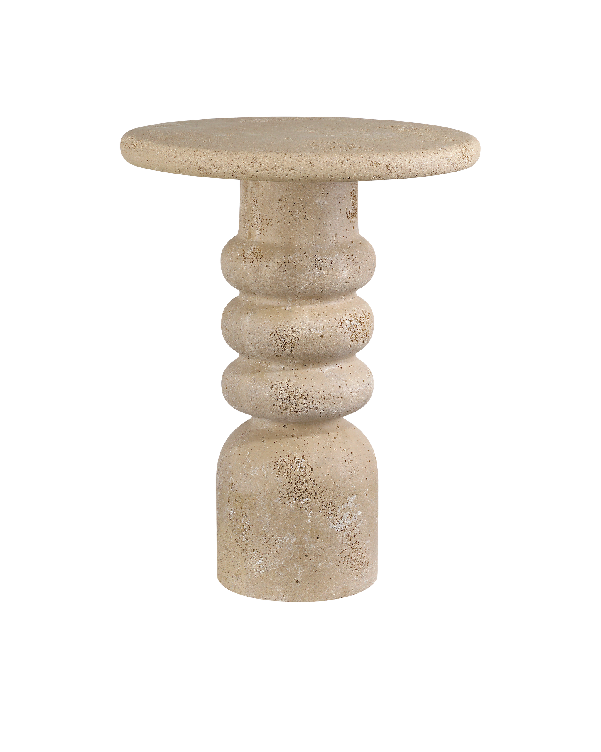 • The Rocco Accent Table is made of faux travertine, a blend of stone powder and composite that is expertly finished to mimic the warm, natural beauty of of the stone. The tan table has a gracefully turned pedestal that makes it fitting for an array of styles, from contemporary interiors to traditional rooms. The Rocco rises to nearly 20 inches tall.