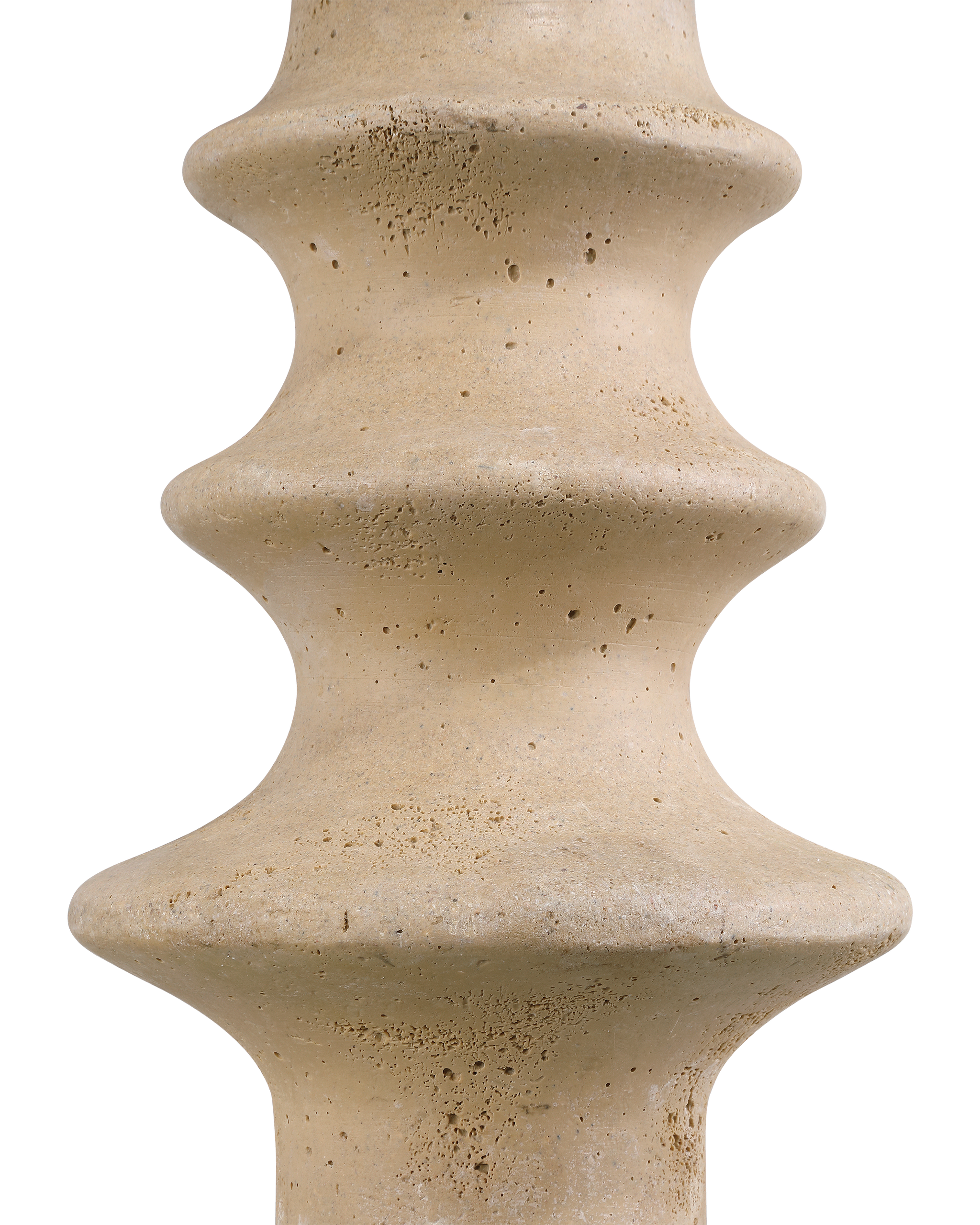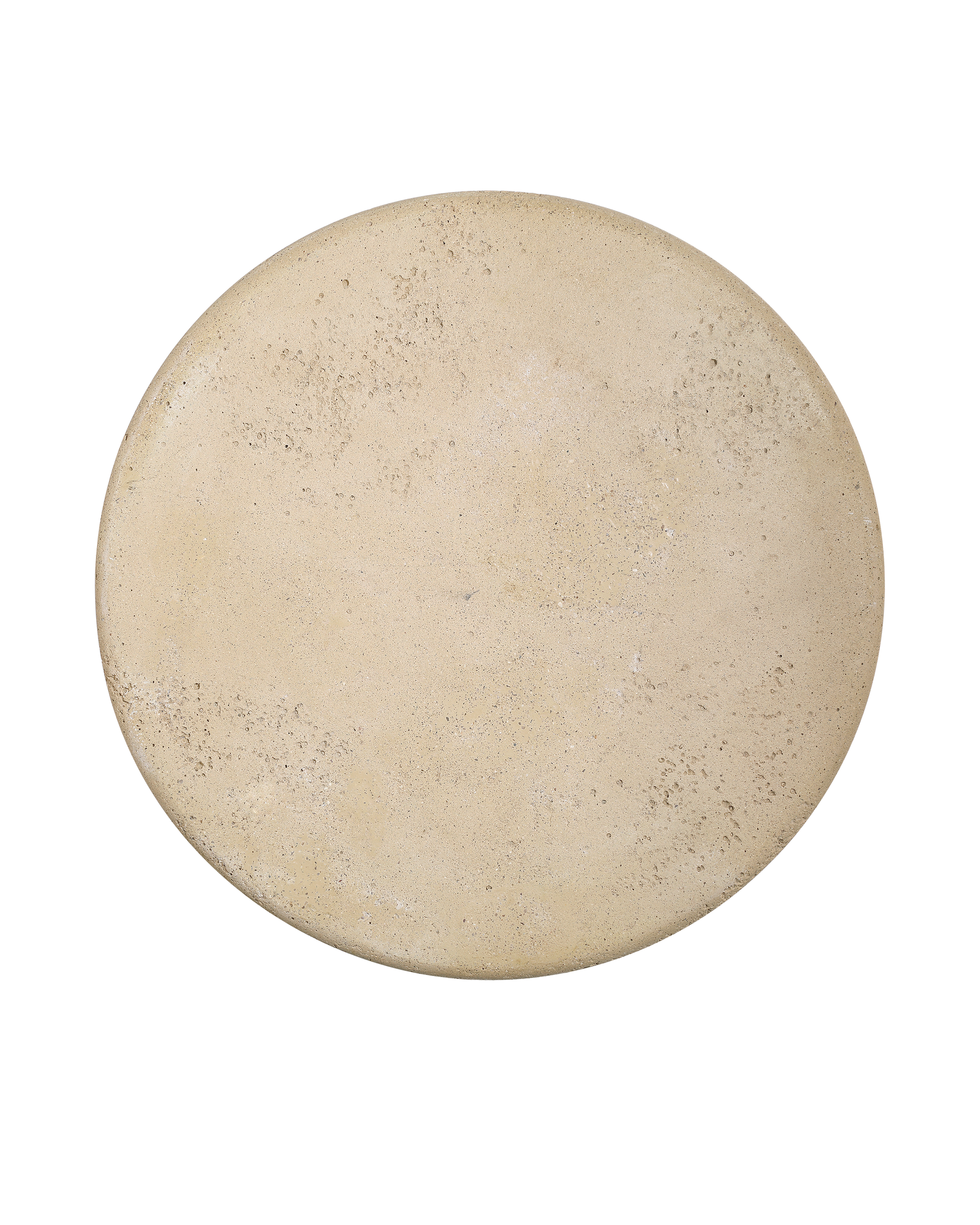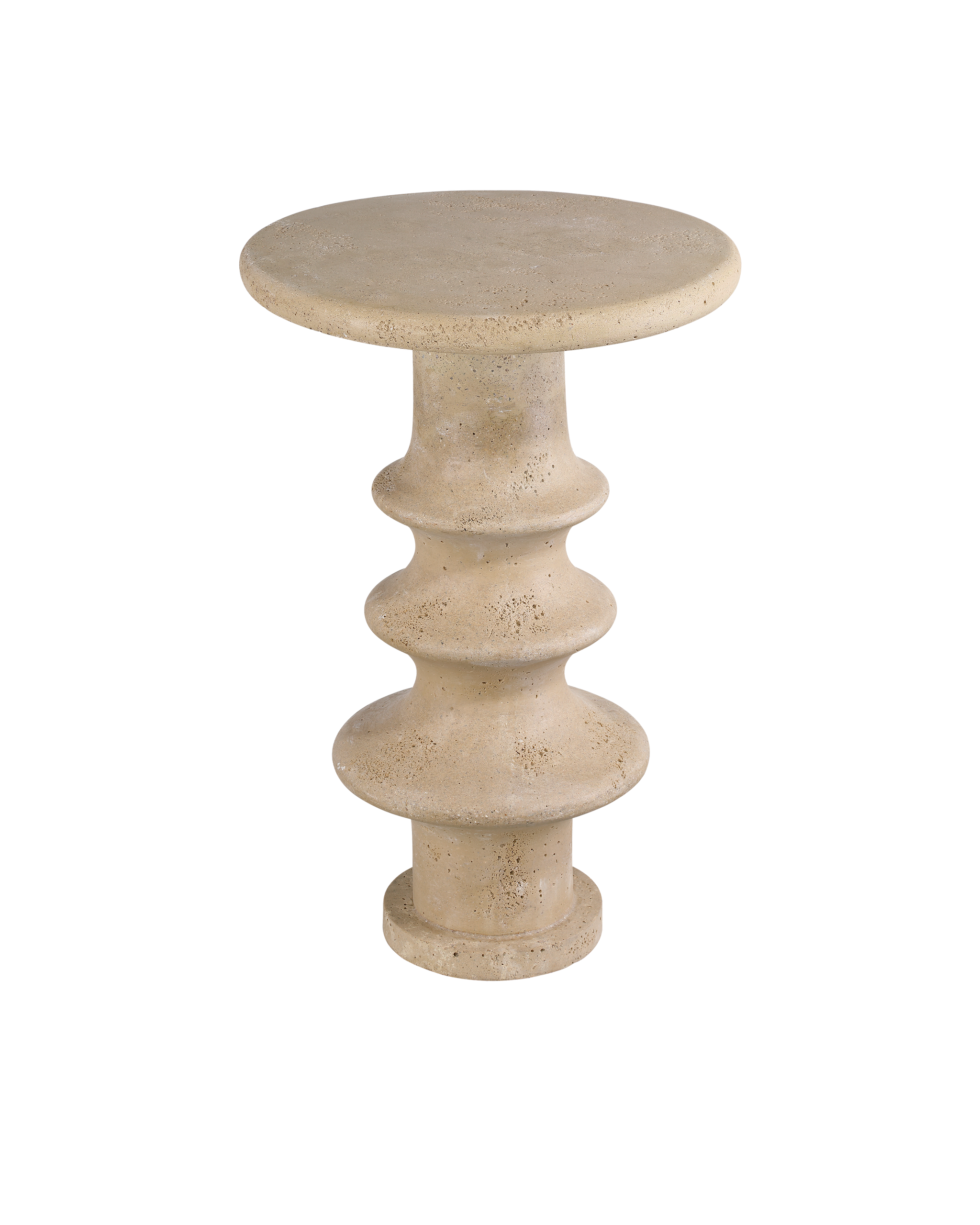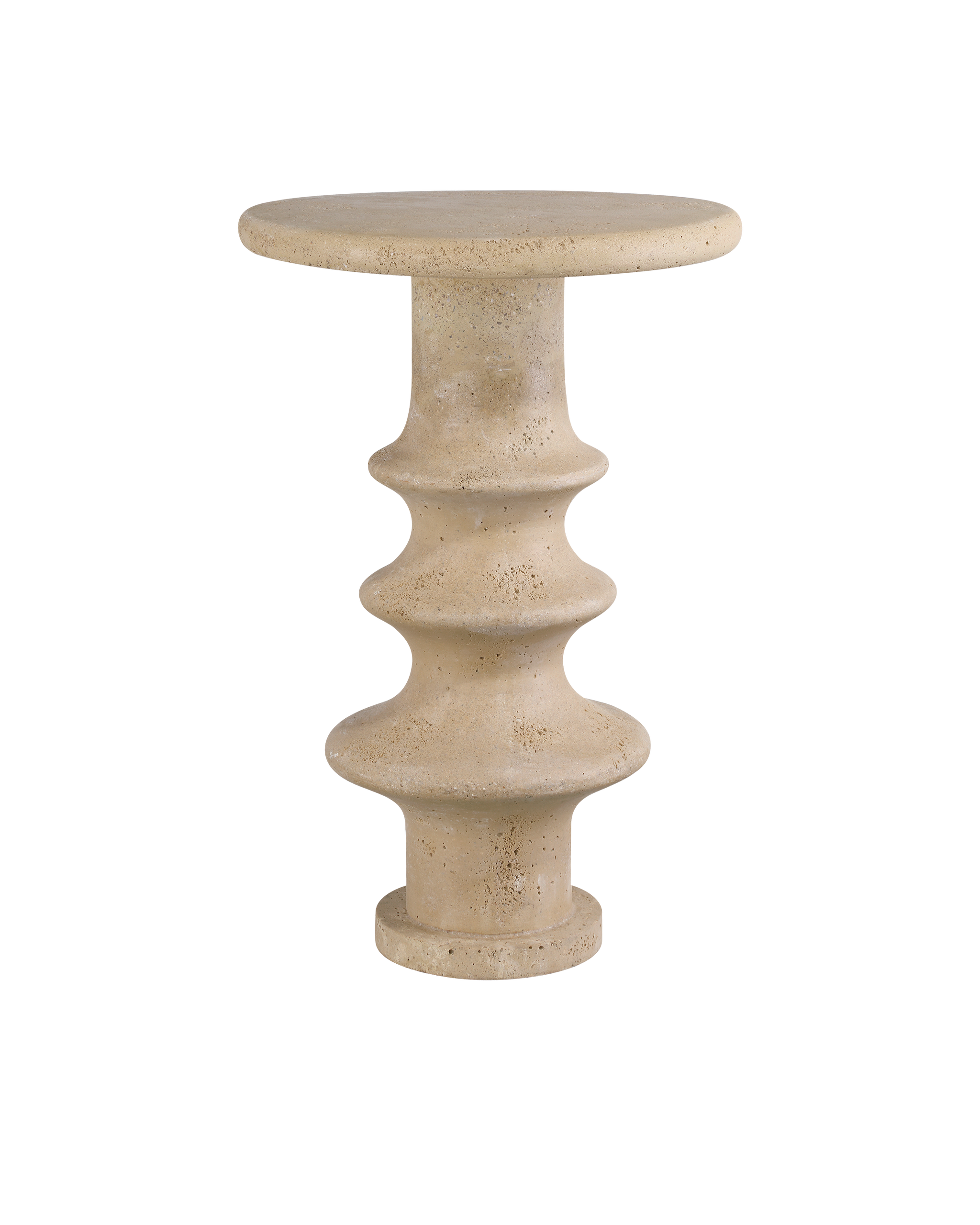 • The Rollins Accent Table is made of faux travertine, a blend of stone powder and composite that is expertly finished to mimic the warm, natural beauty of the stone. The tan table has a gracefully fluted pedestal that makes it fitting for an array of styles, from contemporary interiors to traditional rooms. The Rollins rises from an understated base to culminate at nearly 2 feet tall.