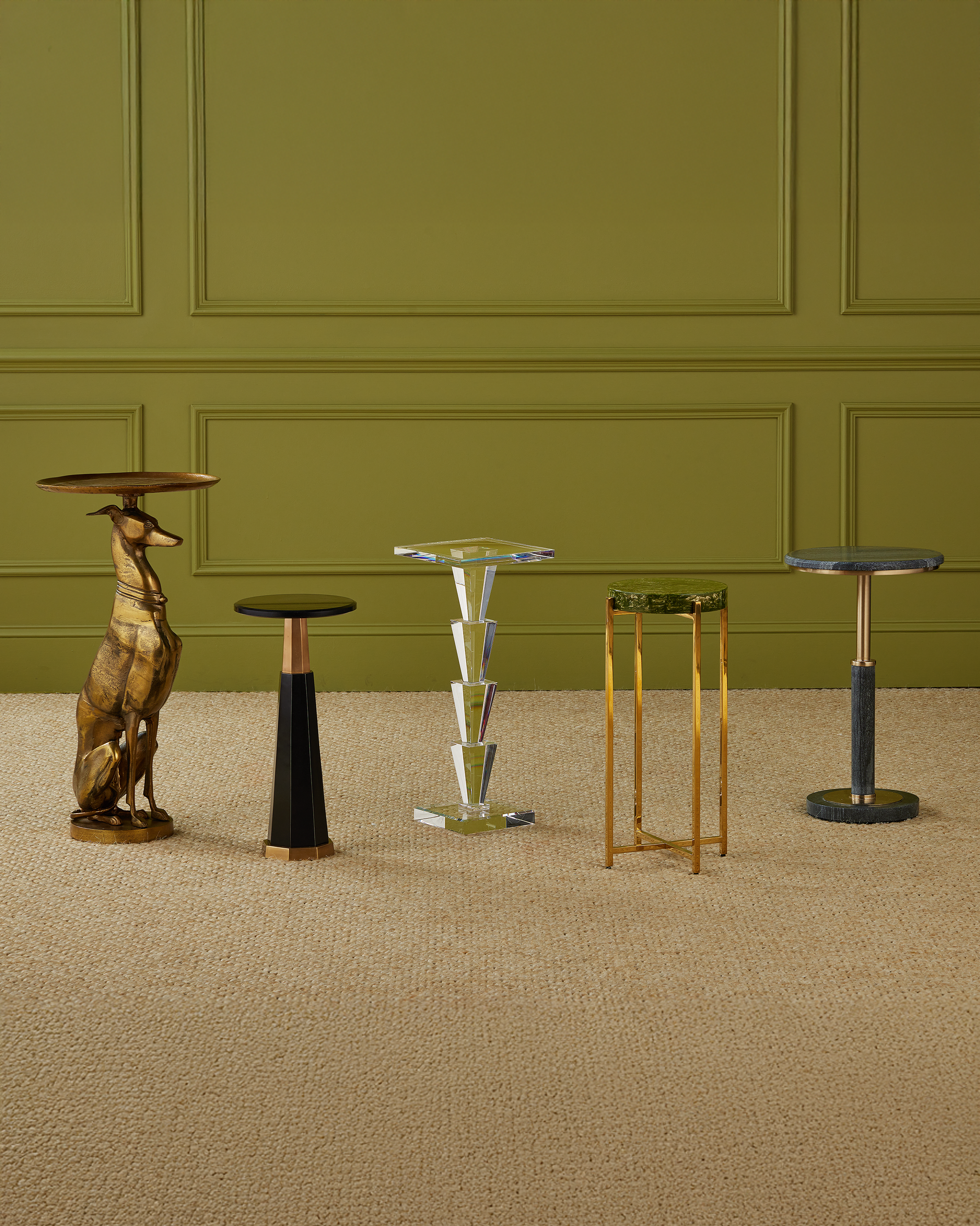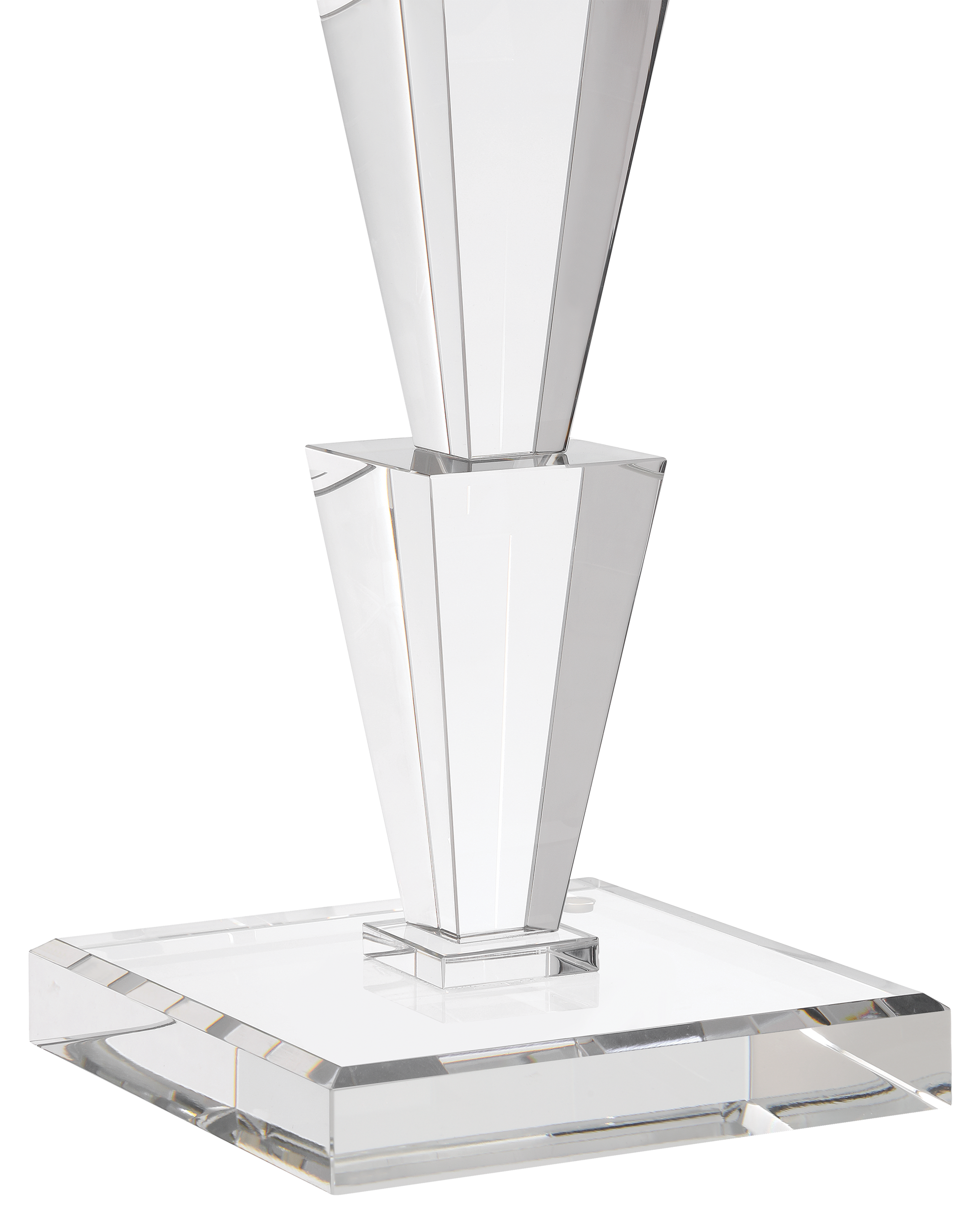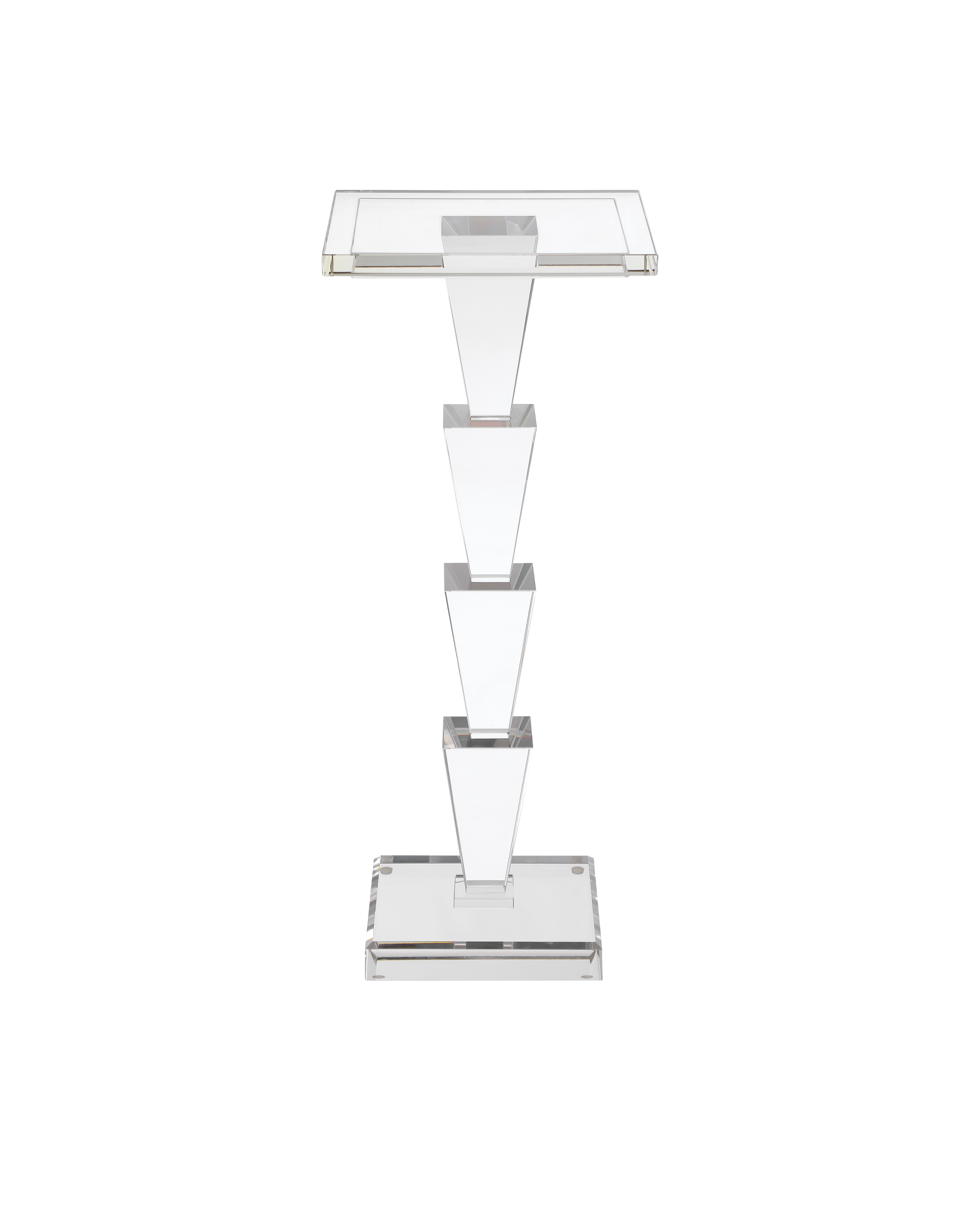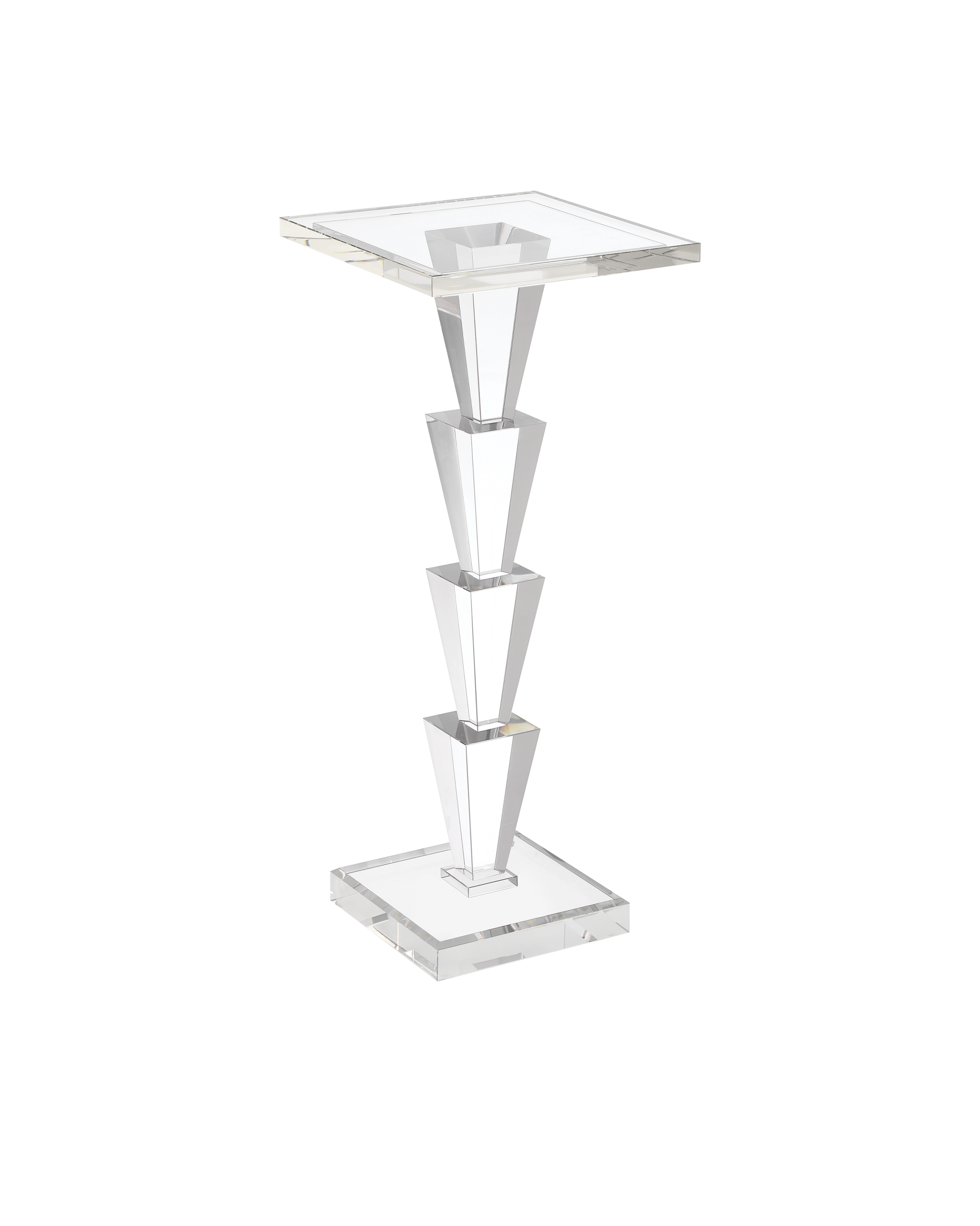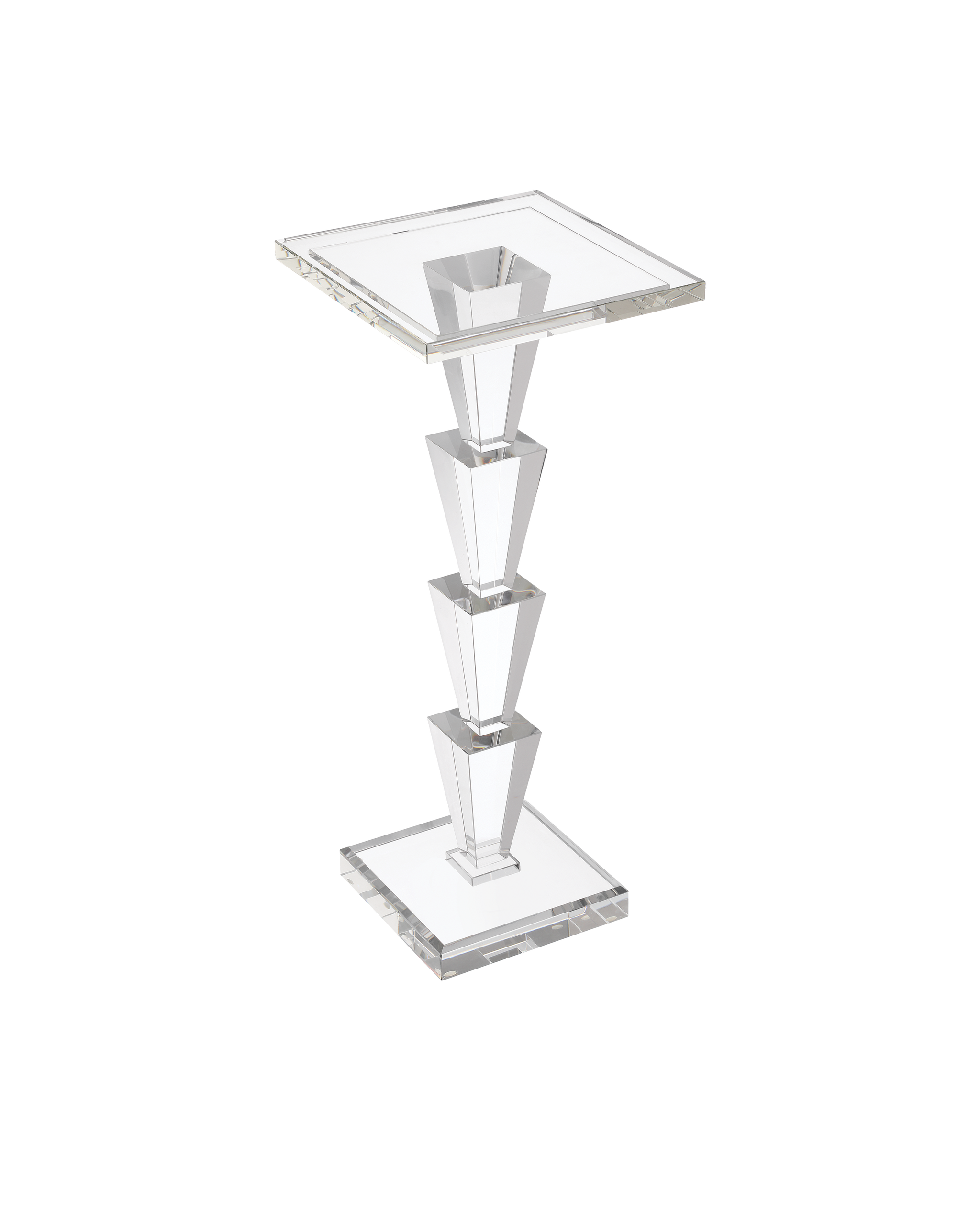 • The Tiana Drinks Table features six stacked optic crystal forms that telescope toward the top. The clear accent table has chamfered edges on both the stacked base and the tabletop that echo the joinery of the other elements of this design. The table measures 24 inches tall and the top is 10 by 10 inches, making it an excellent choice when a small, moveable surface is desired.