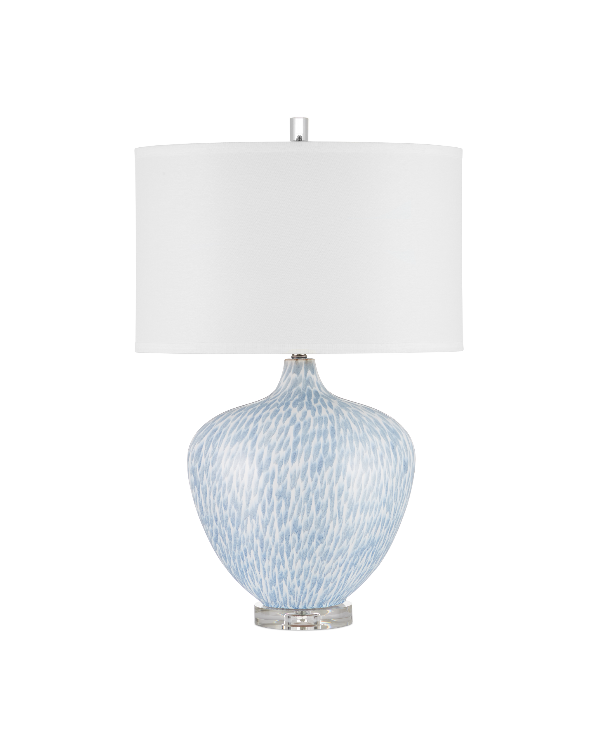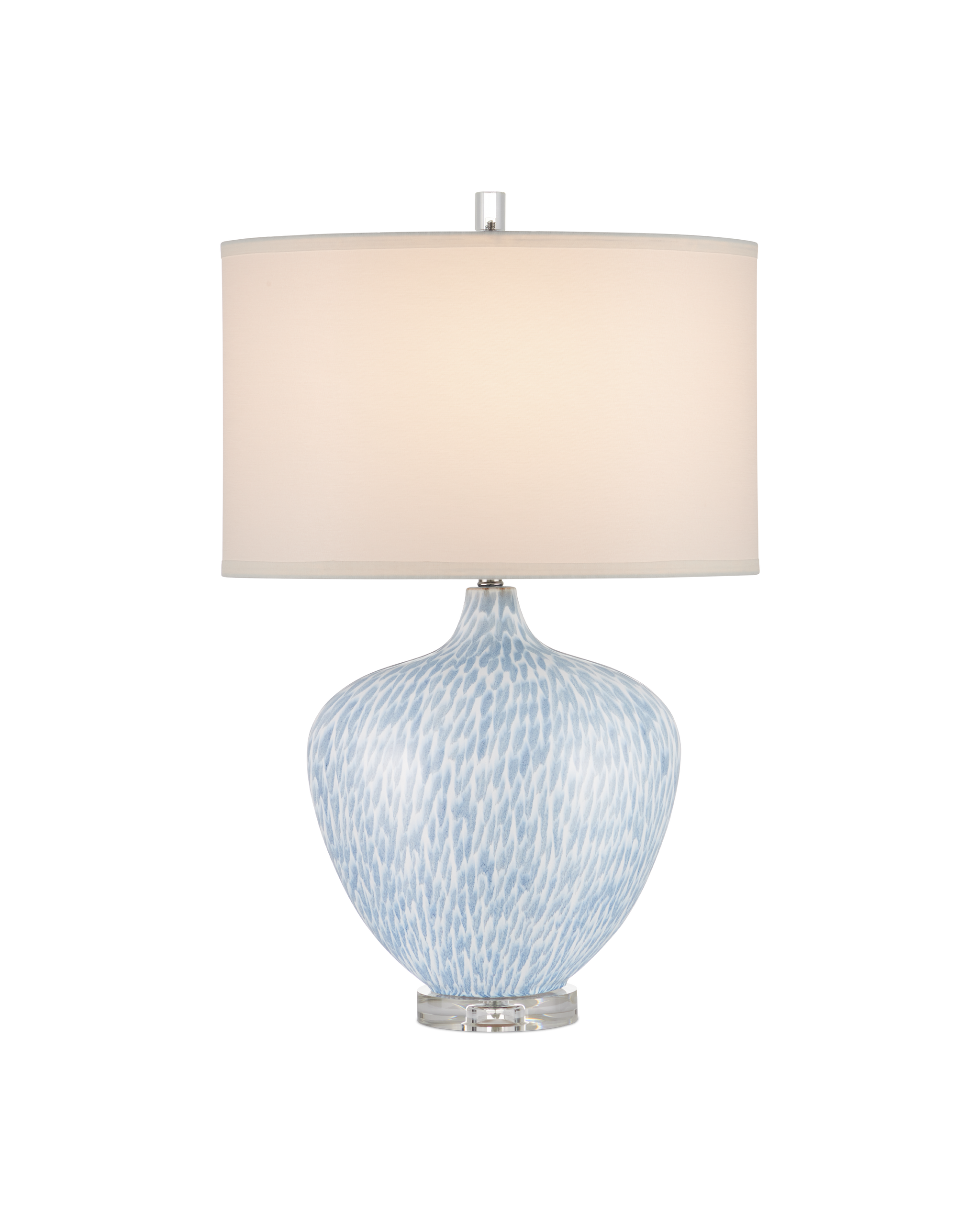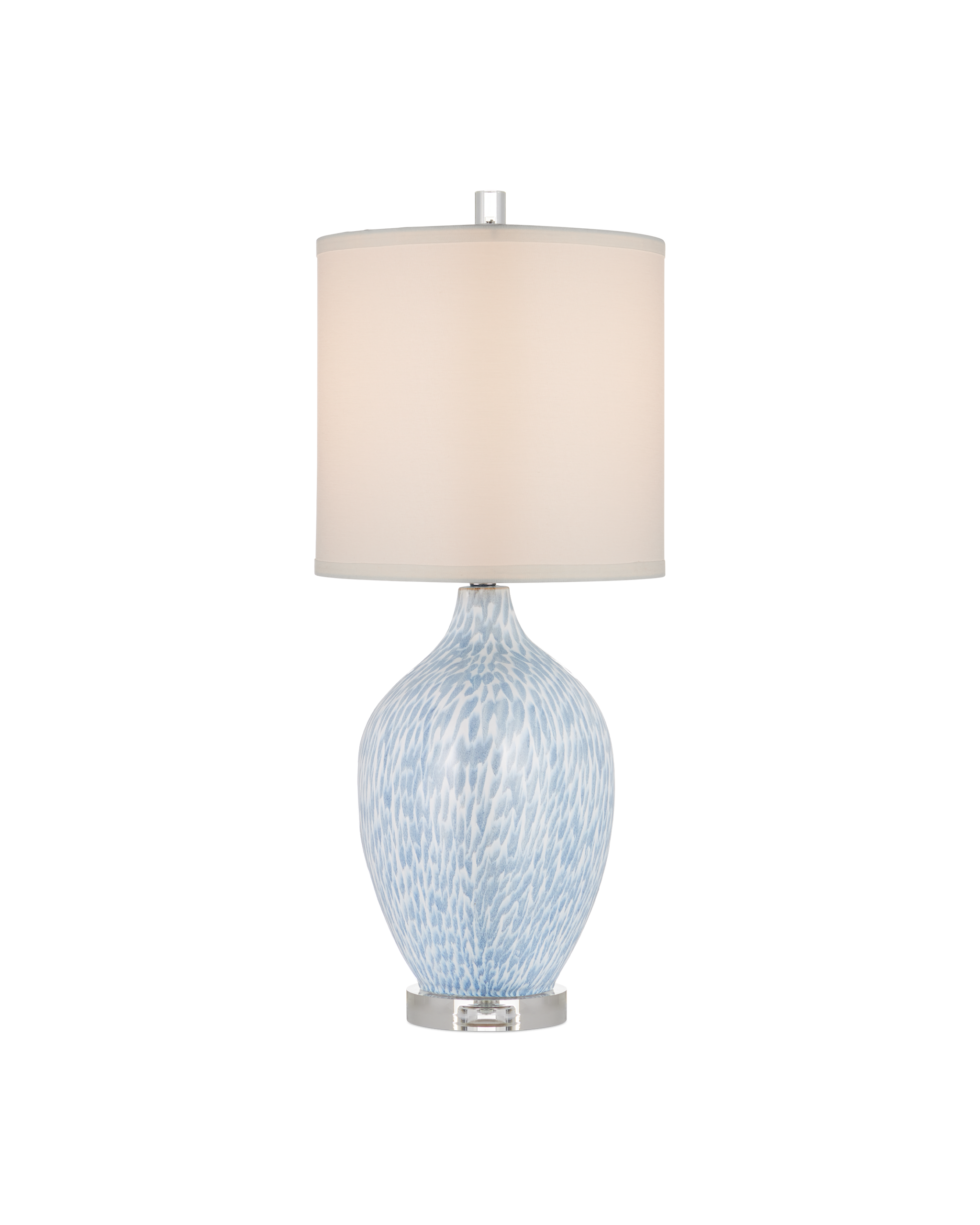 • The Tinney Blue Table Lamp is a heart-shaped oval lamp with a feminine profile made of ceramic with a white ground on which pale blue shapes have been brushed to resemble flowing plumage. The graceful piece is topped with a self-trim drum shade fastened in place by an optic crystal finial that matches the optic crystal base. This is a great choice for a narrow console or side table.