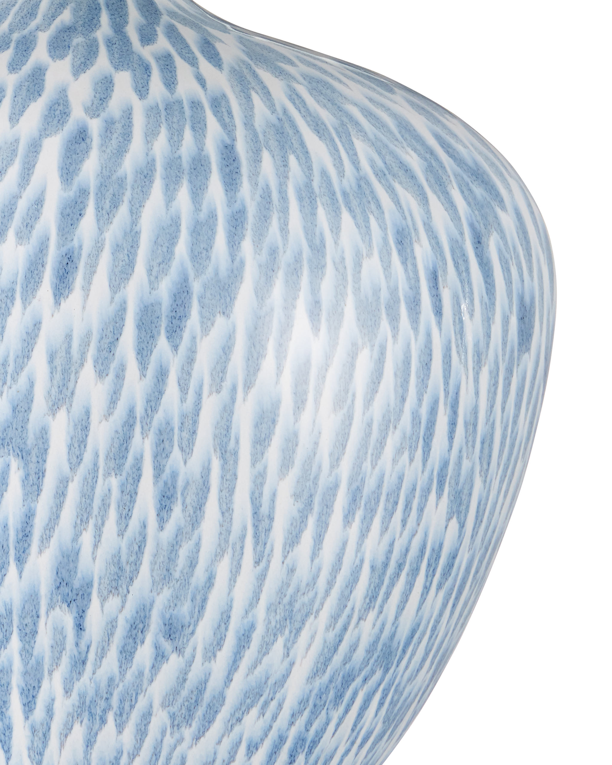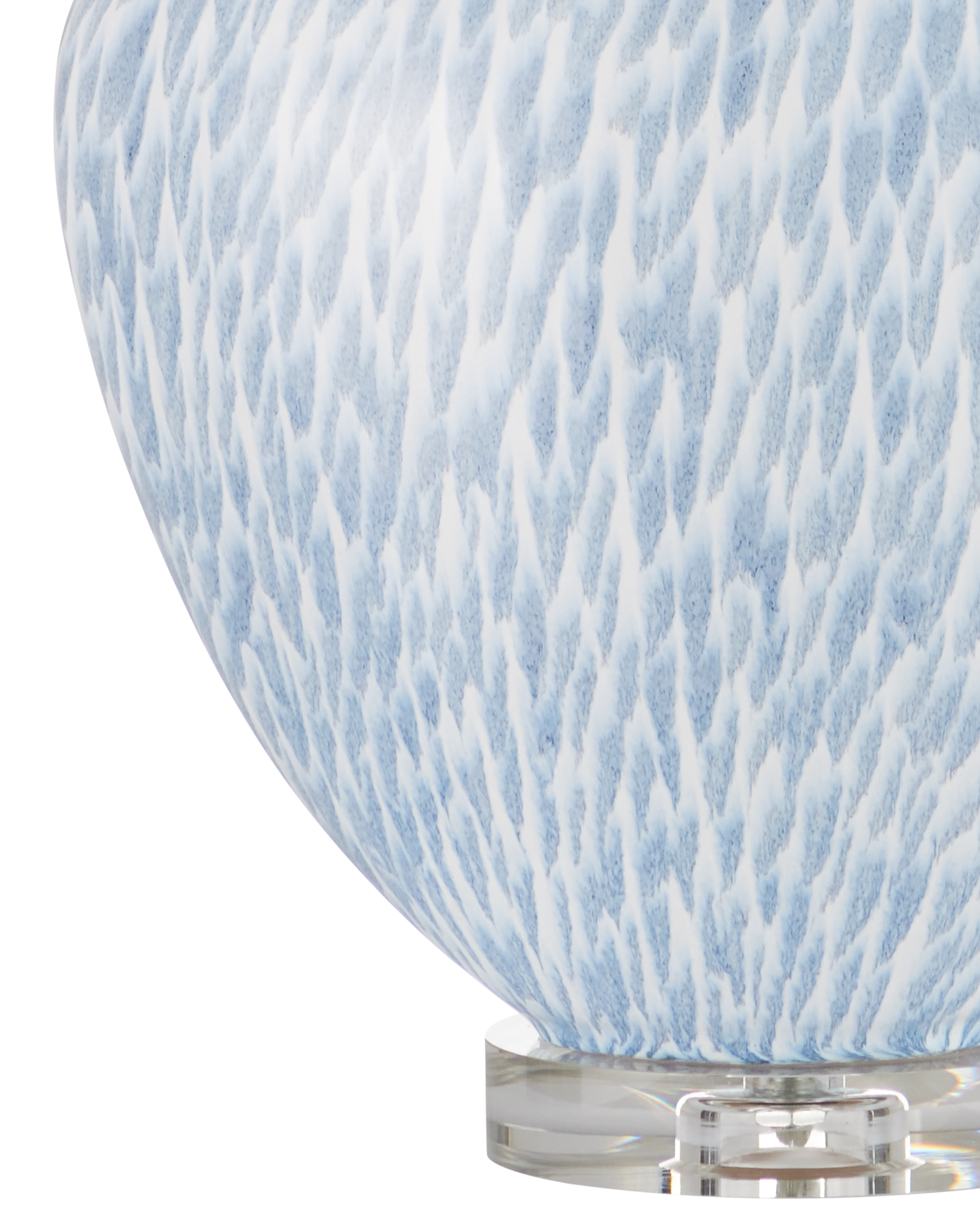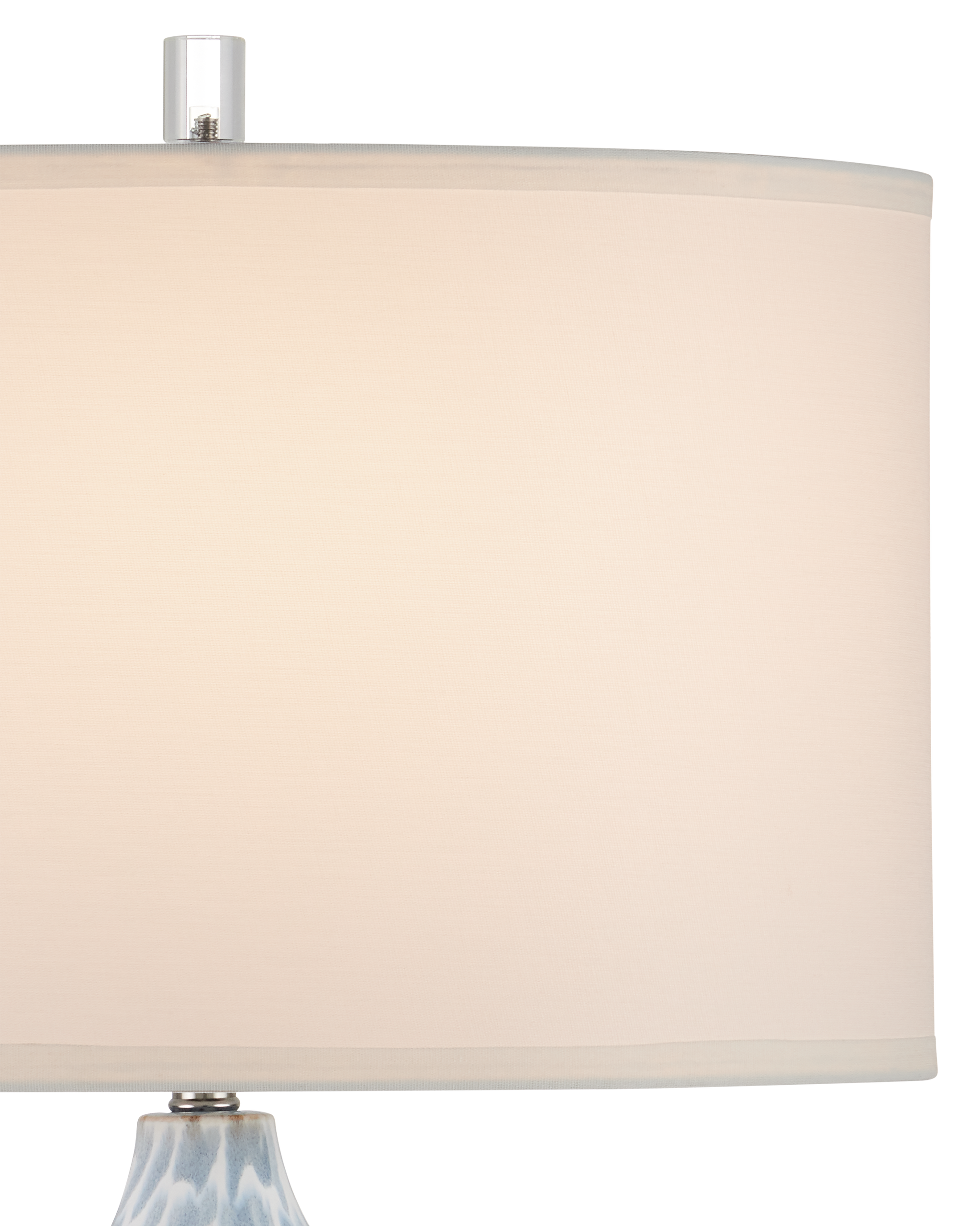 • The Tinney Blue Table Lamp is a heart-shaped oval lamp with a feminine profile made of ceramic with a white ground on which pale blue shapes have been brushed to resemble flowing plumage. The graceful piece is topped with a self-trim drum shade fastened in place by an optic crystal finial that matches the optic crystal base. This is a great choice for a narrow console or side table.