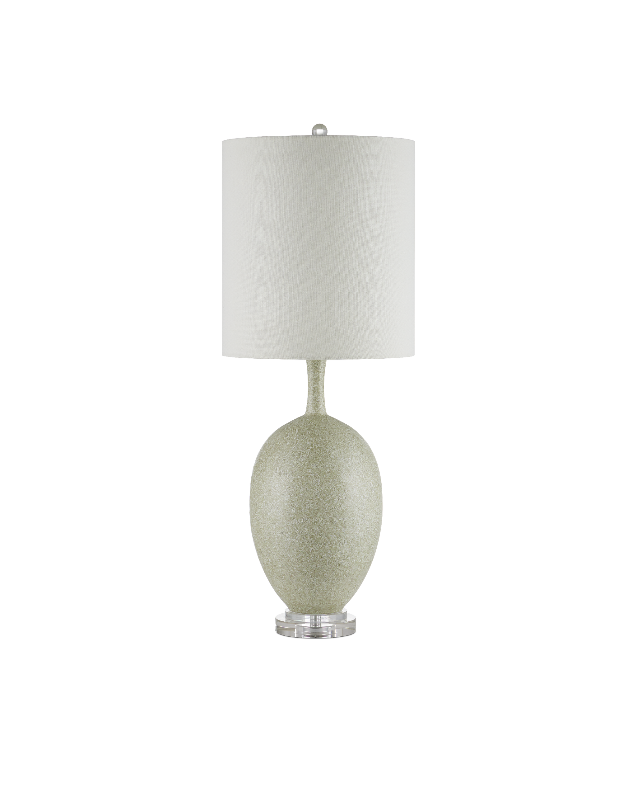 • The Verdure Table Lamp has a sophisticated vase-shaped body with a swirling green and white pattern on its surface, which recedes to a lovely stippled effect when seen from far away. The interlocking amoeba shapes only appear when one draws near the green porcelain table lamp. The thin mouth of the body sitting atop an egg shape disappears under an elongated shade. The base and finial are made of optic crystal.