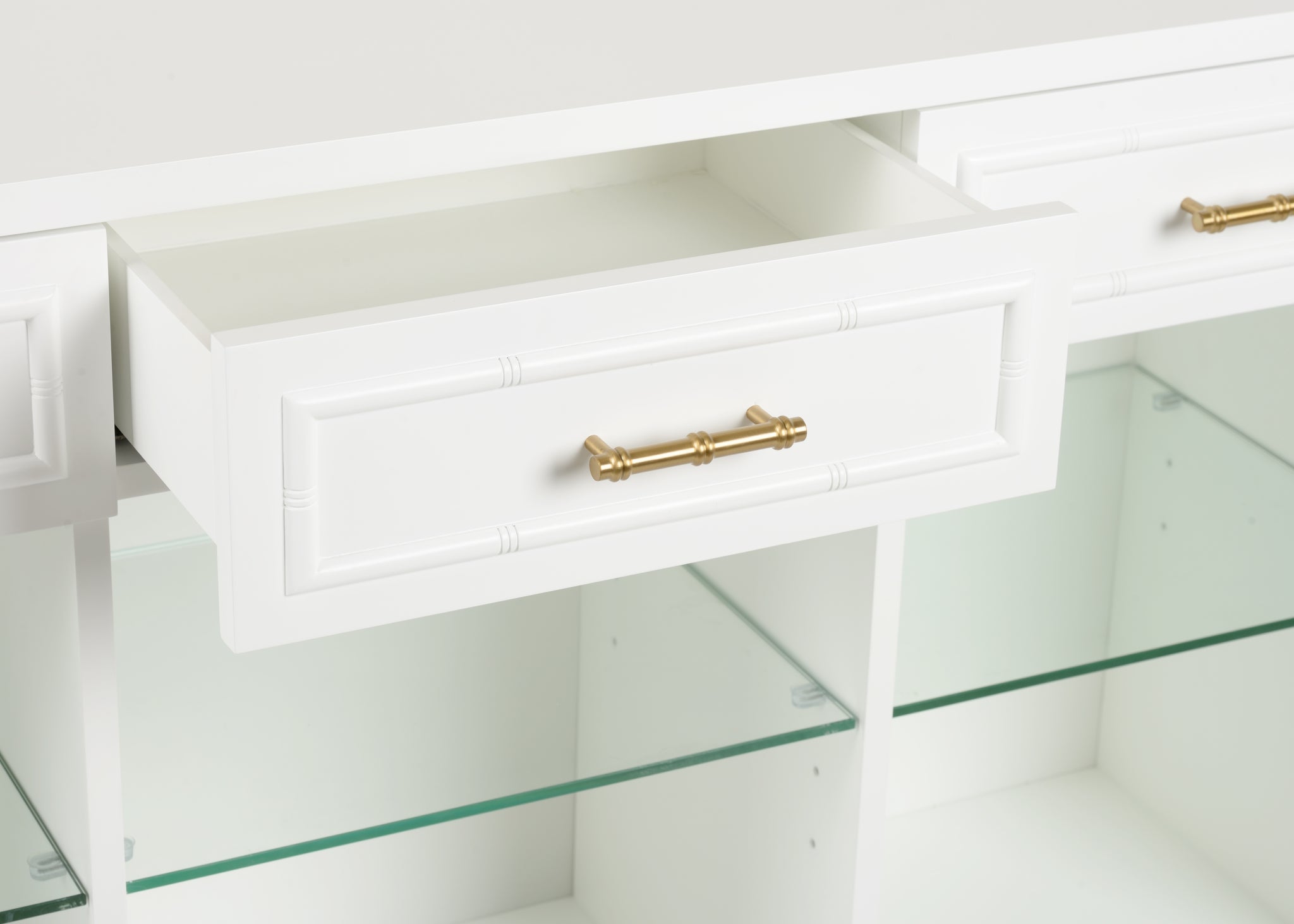 • Elevate the look in your entryway or living area by customizing this bamboo console to match your existing decor. Crafted of acacia wood, this lovely console has a raised bamboo design. The three soft closing drawers with brass finished bamboo handles can hold small personal baubles. Tempered glass shelves have adjustable heights to display your favorite accessories. You become the designer and show your style by selecting any benjamin moore paint color. Please provide paint color name and number.