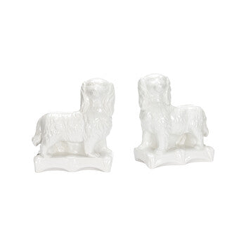 • Standing guard on a mantle or shelf, the Staffordshire Spaniels bring a monochromatic color pallet with its white hand glossy fur. Designed by Bill Cain.