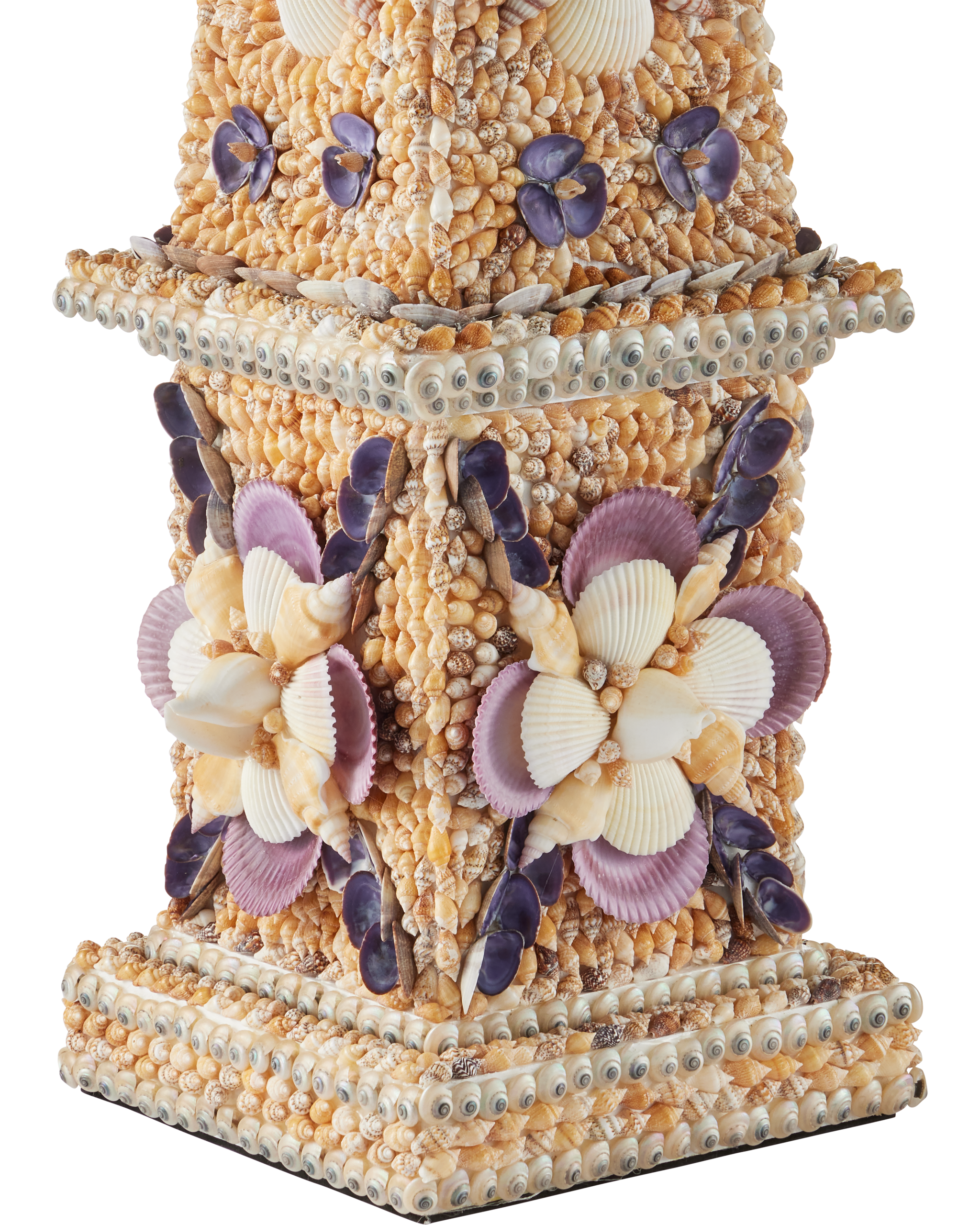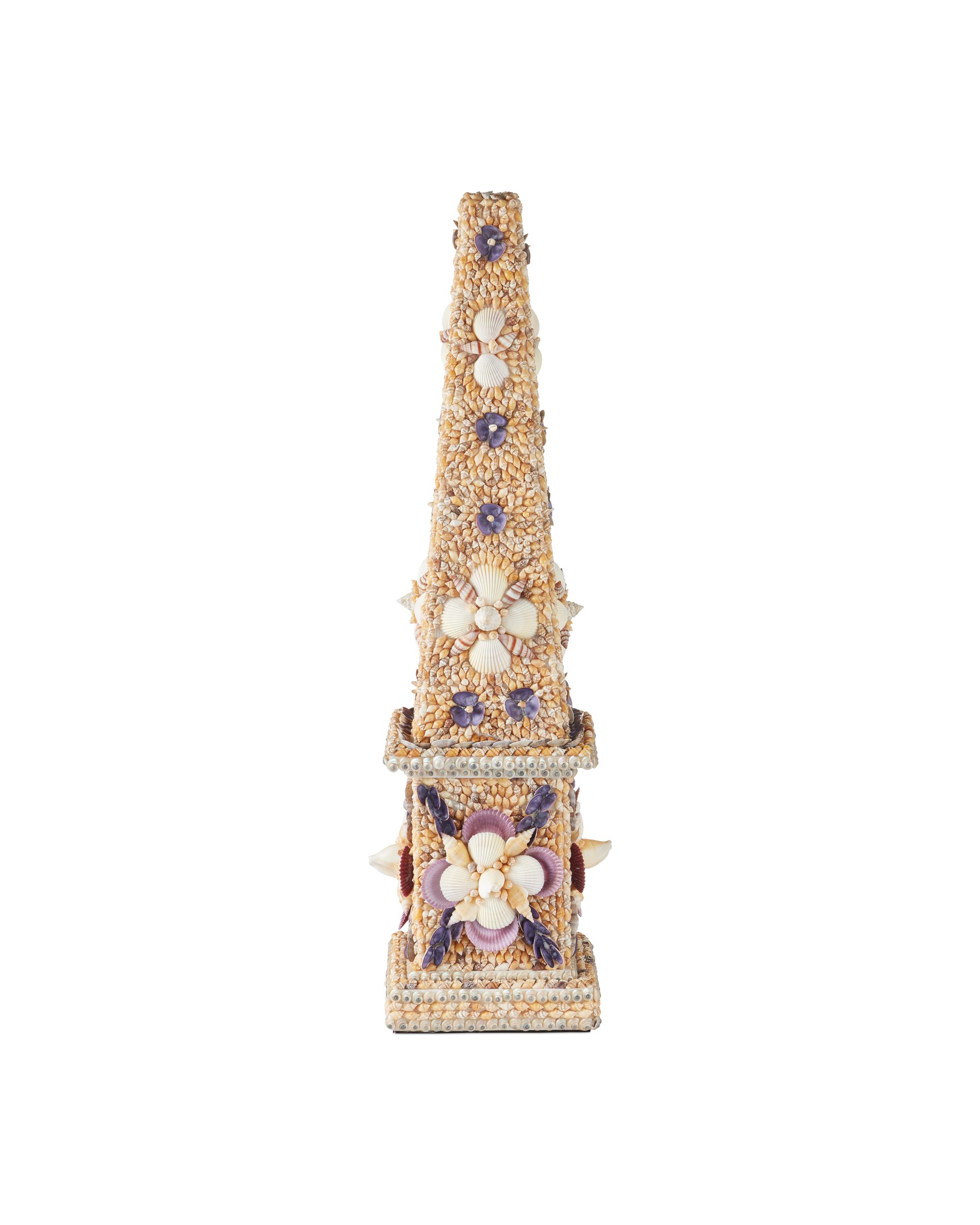 • The Coquillage Tall Obelisk is a shell-encrusted sculpture inspired by a mosaic wall created in coquillage, one of the world’s oldest art forms that utilizes natural shells. The complex pattern, which includes floral motifs in pale peach, white, and purple tones, is affixed to the shape made of wood. Standing 31 inches tall, this shell sculpture will be a commanding decorative accessory.