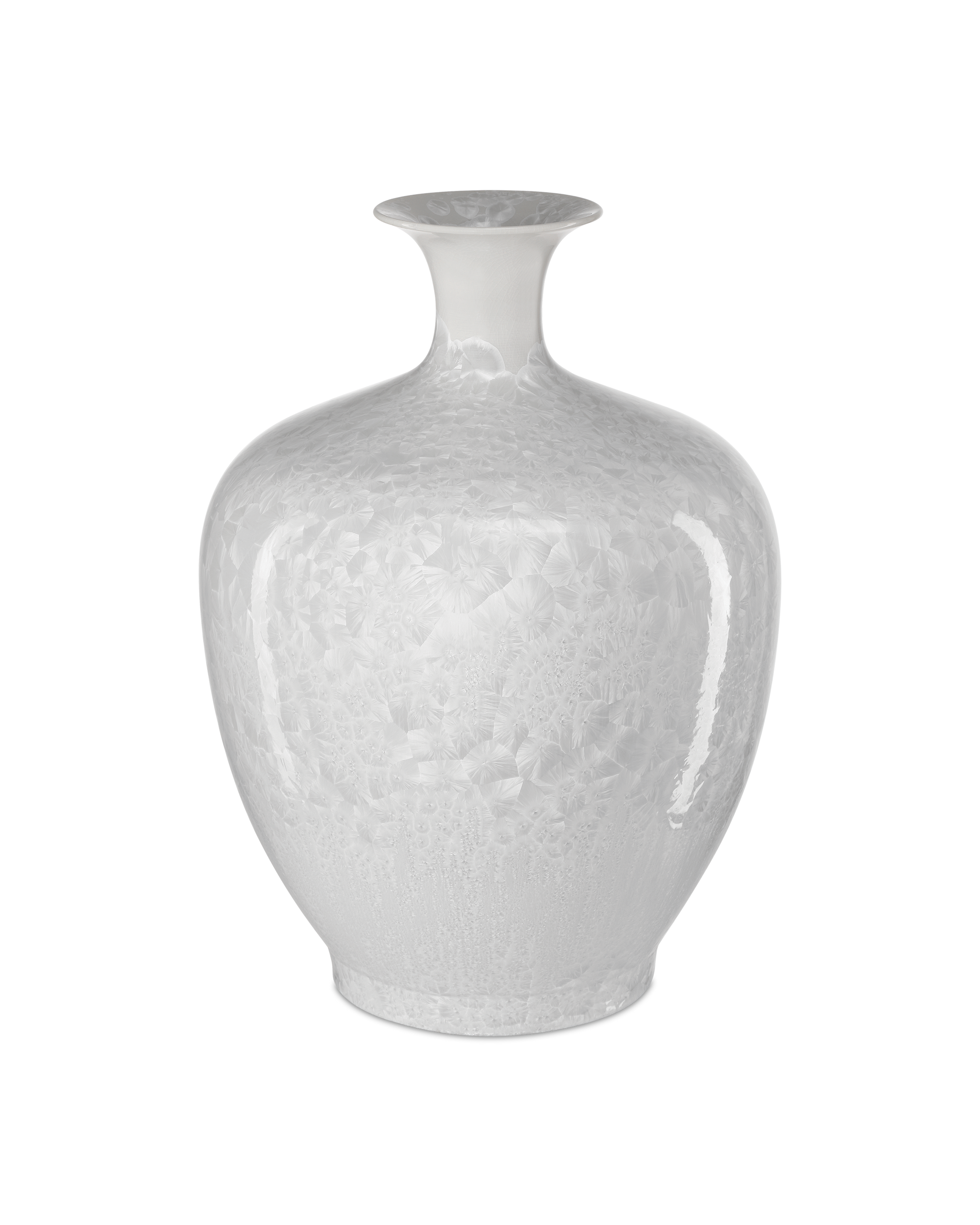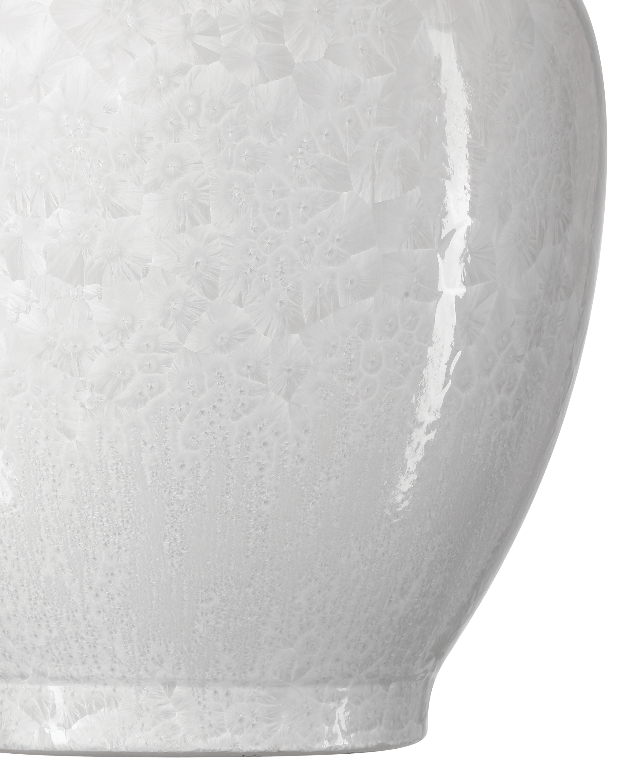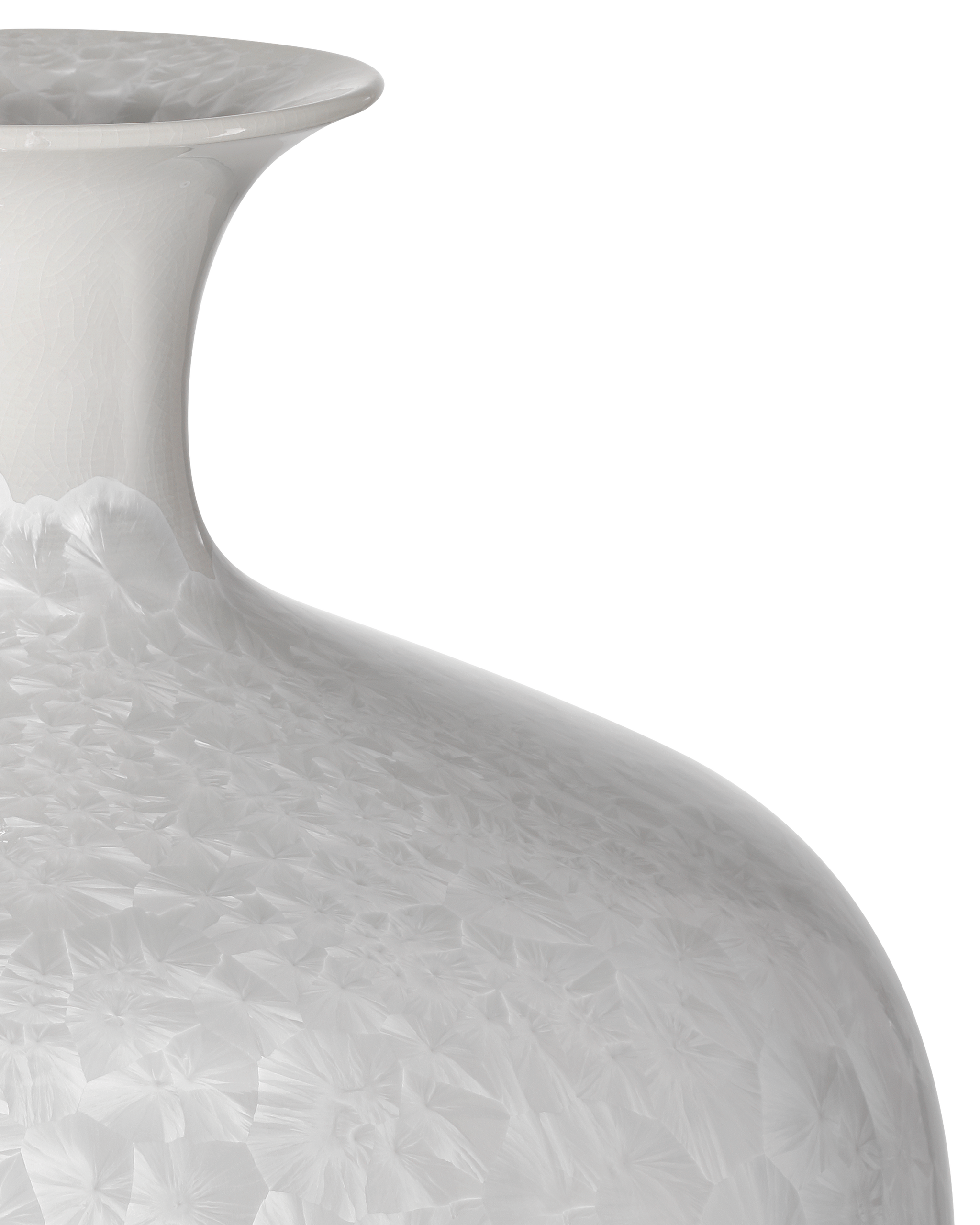 • The Crystalline White Vase is made from mouthblown porcelain with dynamic bursts ornamenting its surface. The crystallization happens when minerals in the glaze react to the heat in the kiln to create randomly placed geometric patterns. These delicate formations vary in placement and abundance to create a shimmering mother-of-pearl effect. At 18 inches high and 12.5 inches in diameter, this is a large vase. The organic nature of the crystalline glaze means no two vases are exactly alike.
