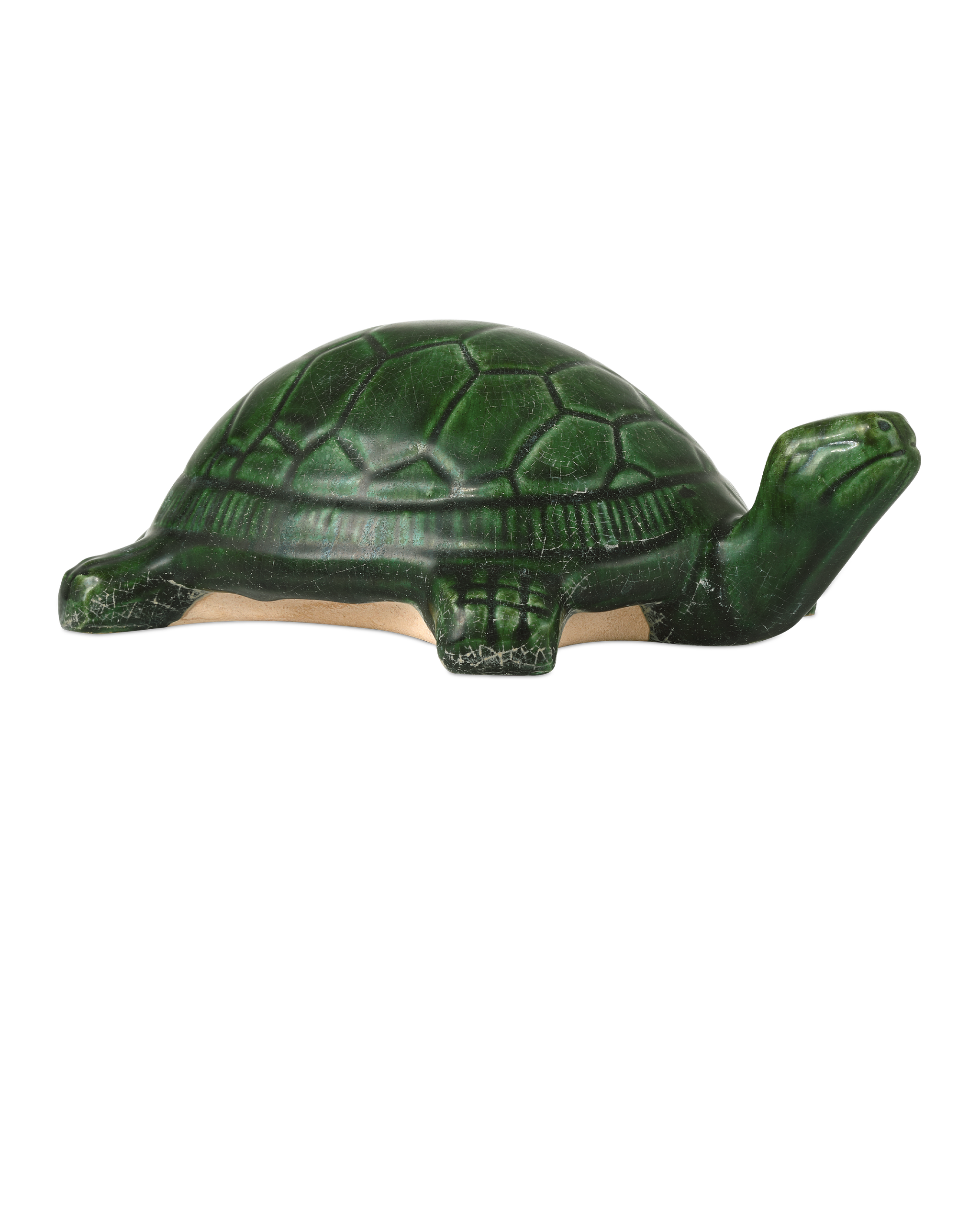 • The Tang Dynasty Green Turtle is an endearing decorative accessory that blends historical inspiration with artisanal charm. Finished in a brilliant green glaze with a subtle crackle effect, this piece evokes the look of a treasured antique with a timeless character. The turtle was a sacred animal in Tang Dynasty culture and likenesses of it were often placed in tombs as symbols of protection and longevity.