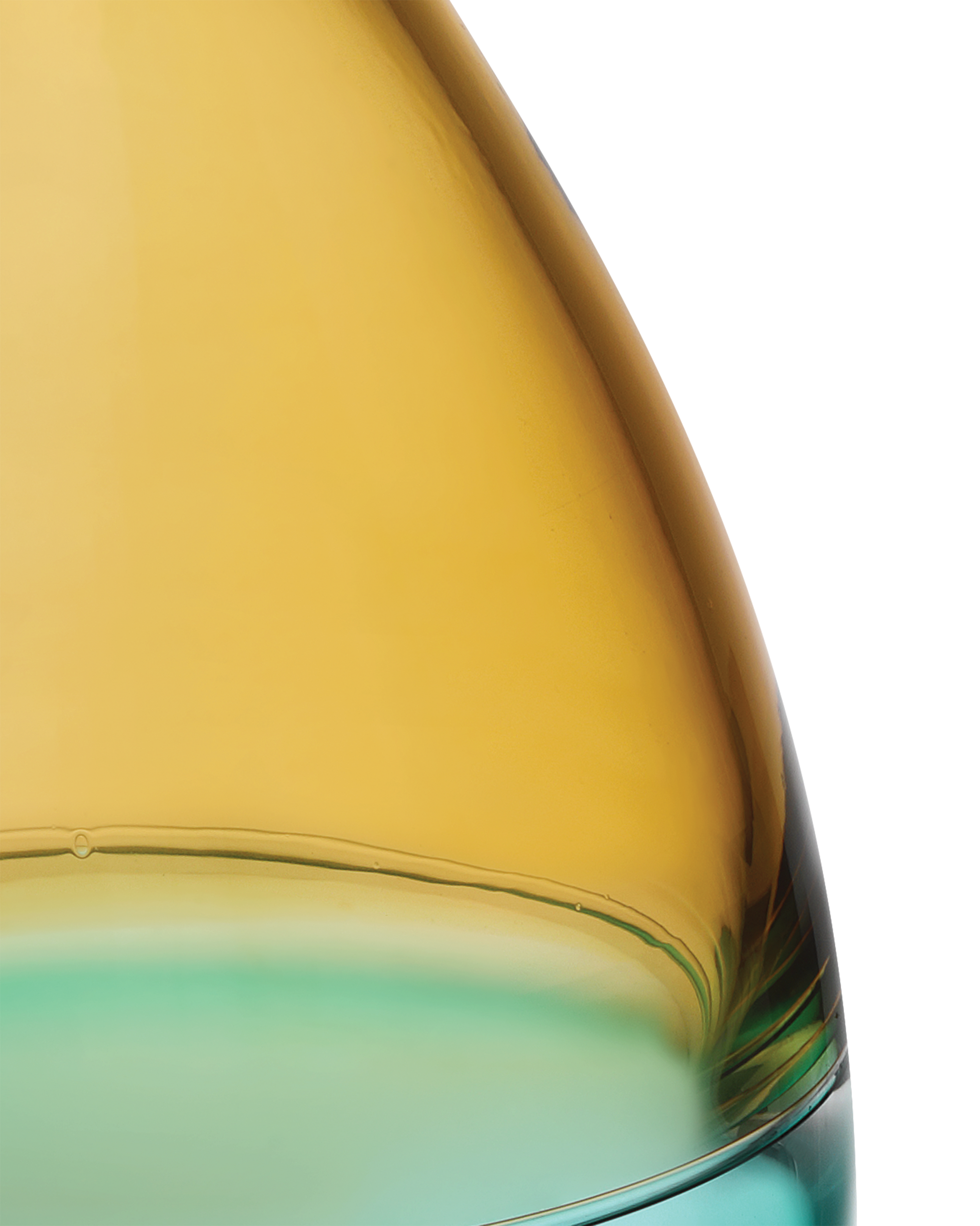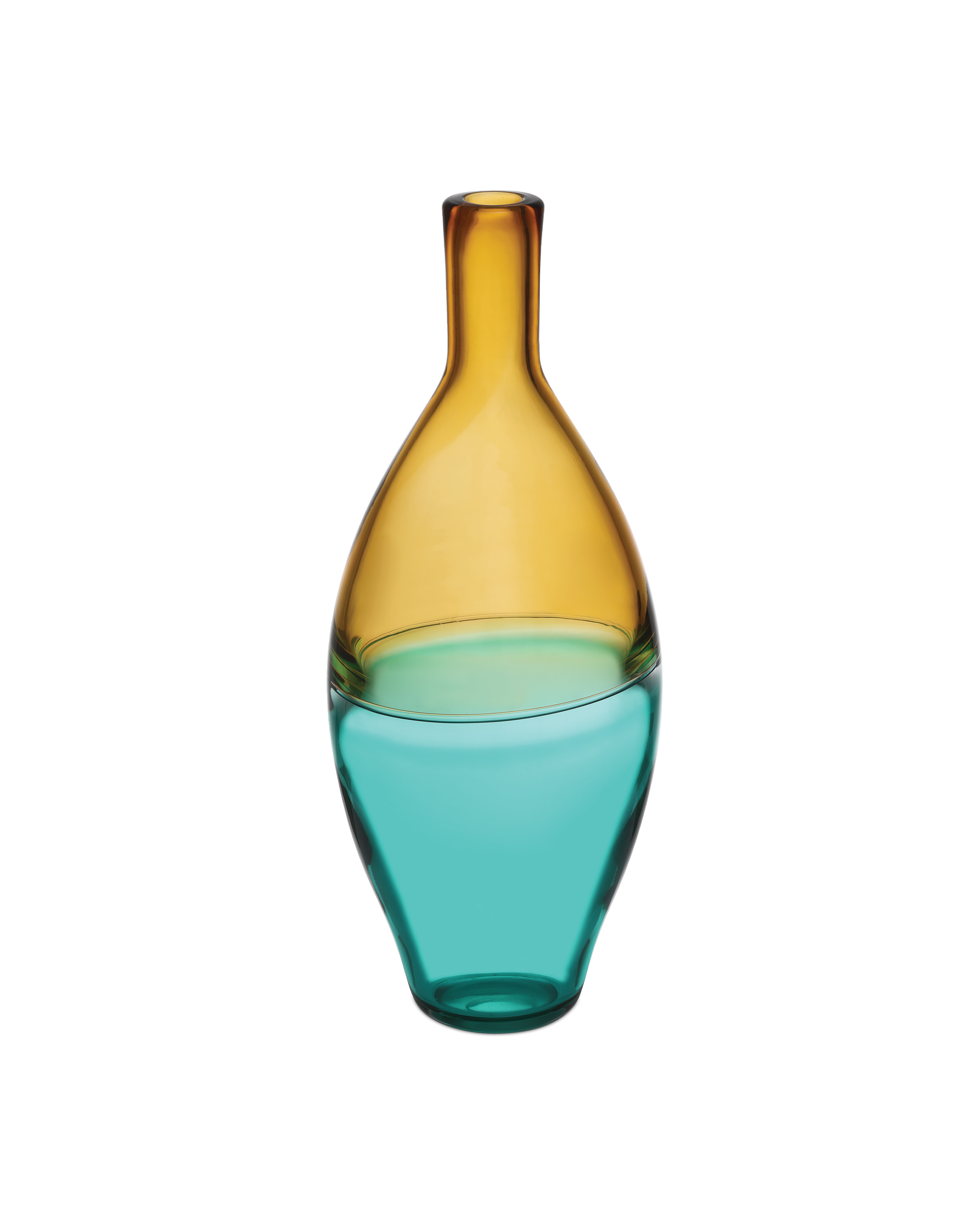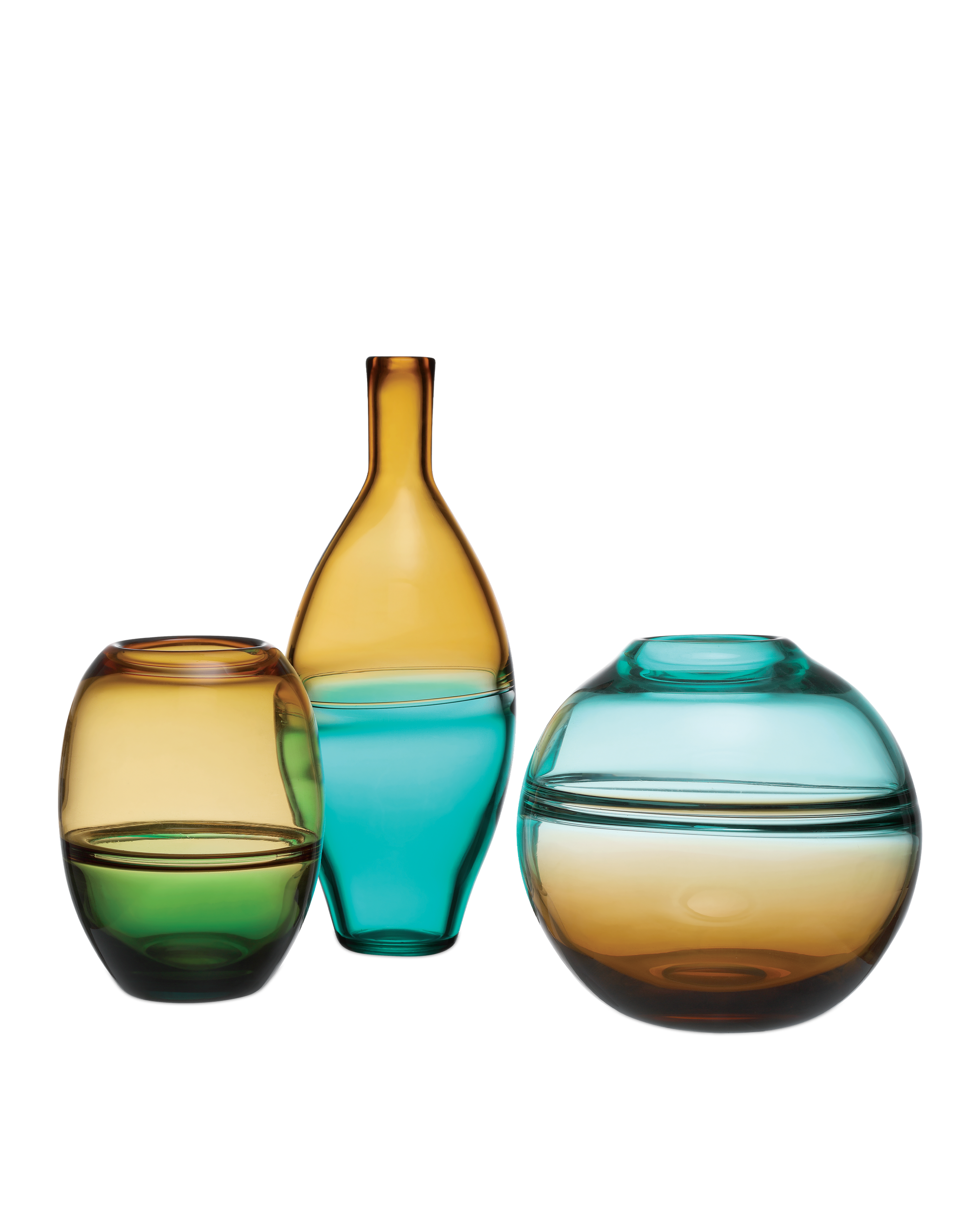 • The Tapio Vase Set is a trio of mouthblown glass vases in translucent hues of aqua blue, amber, and green. The multi-colored vessels feature artful lines of thickening at their waists, which are the points where the two colors on each vase meet to form the thicker delineations. The process to accomplish this is painstaking, as two artisans must blow different colors of glass into the same mold from the opposite ends and must know when the smooth, flowing contours are achieved.