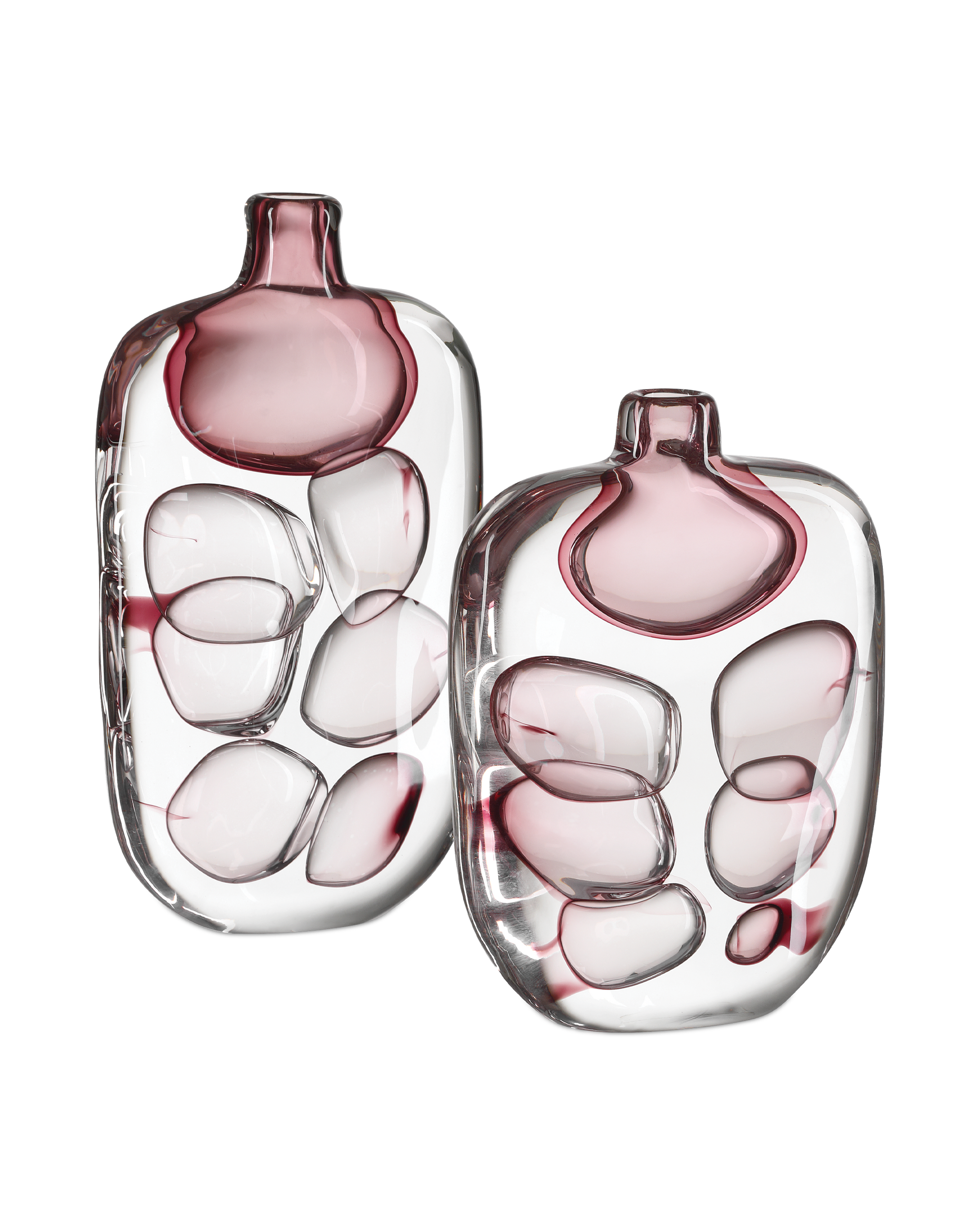 • The Vicolino Large Vase is made of clear and purple hand-made glass with organically placed bubbles floating within its overall form. The vase was created using a Venetian glass technique that is very rarely practiced in modern times. The slim silhouette has a shape that is reminiscent of a perfume bottle, the narrowness making the vase ideal for nightstands, smaller consoles, or shelves that are not very deep. Both sculptural and functional, this vase will be a glamorous accent piece in the most sophisticated setting.