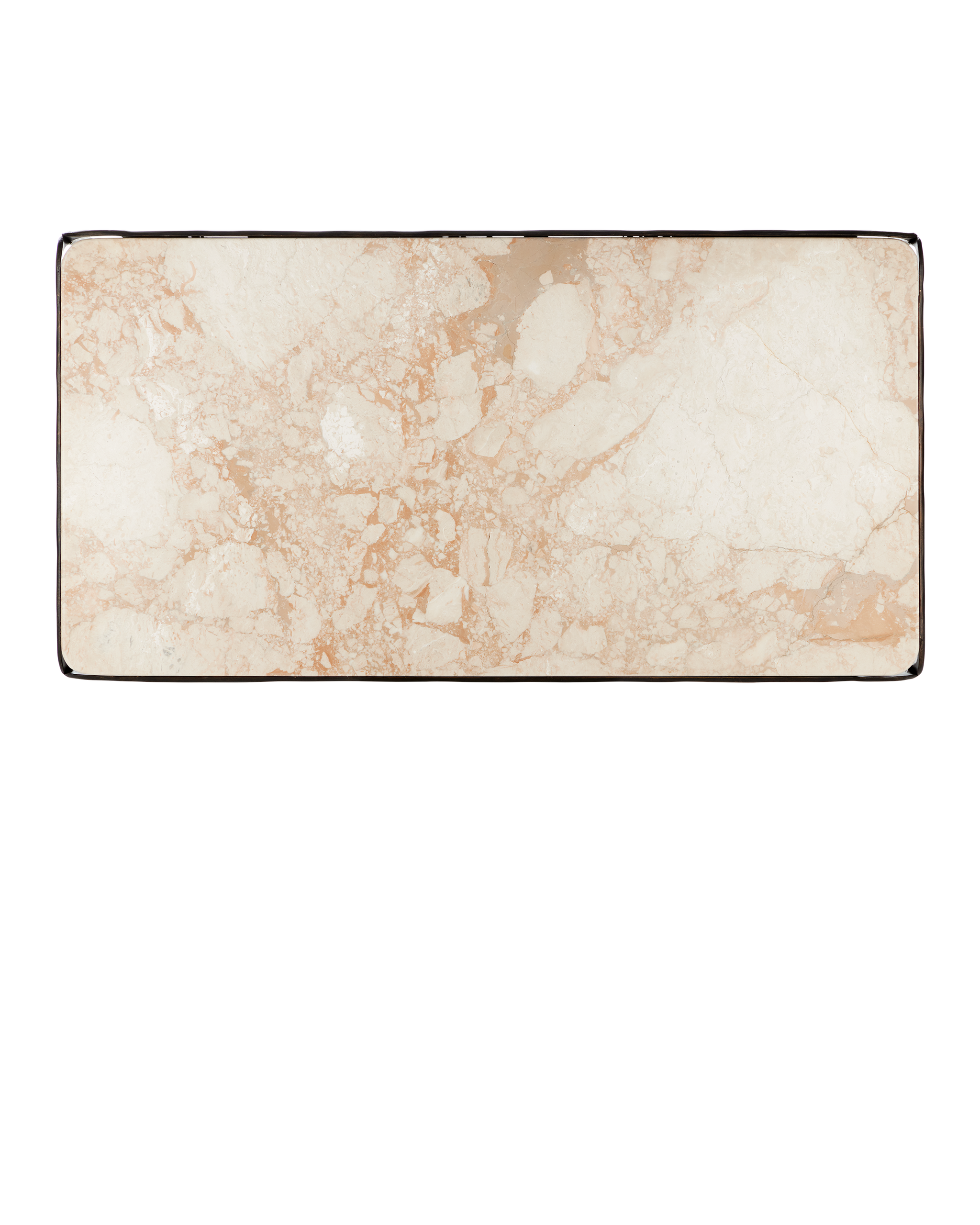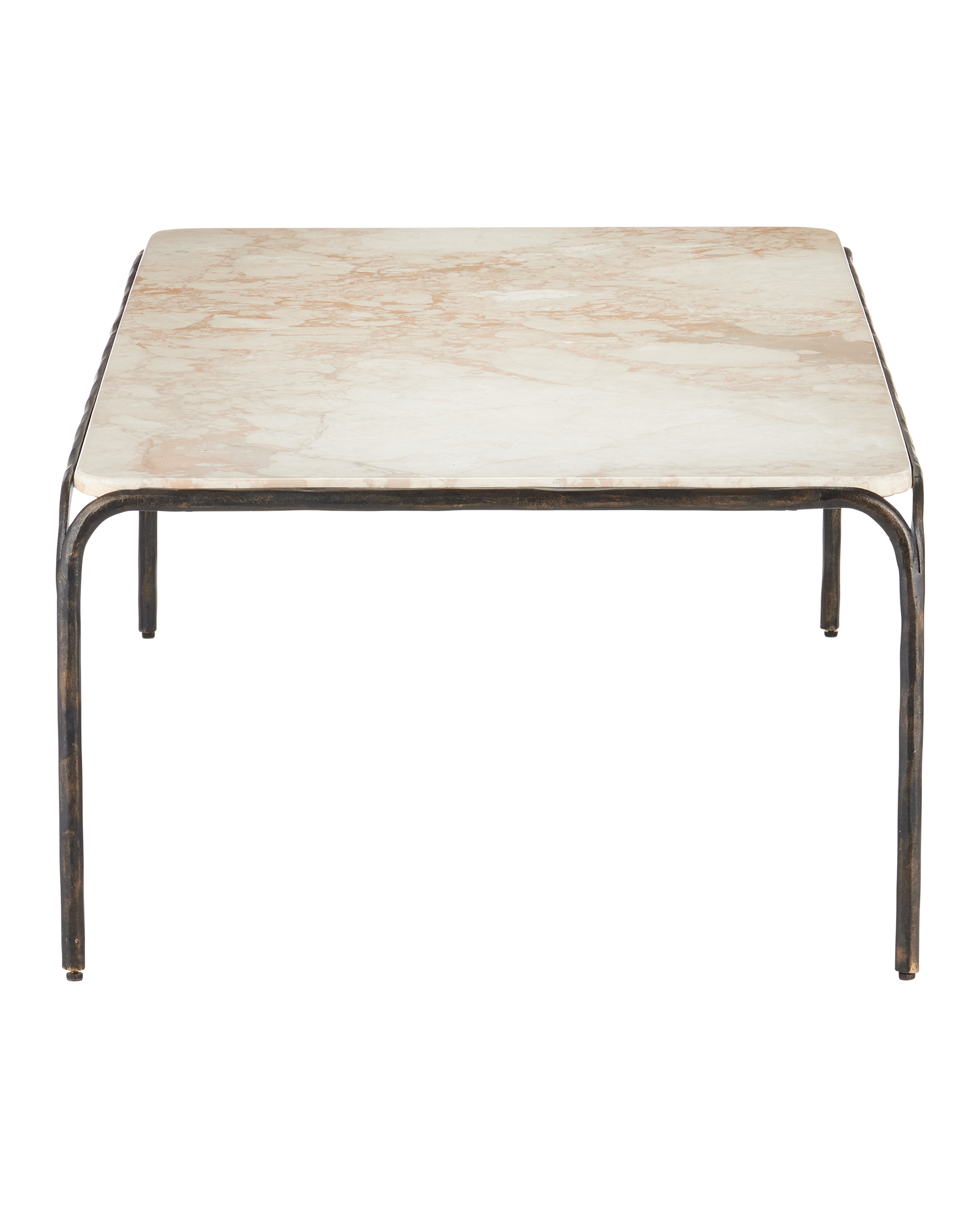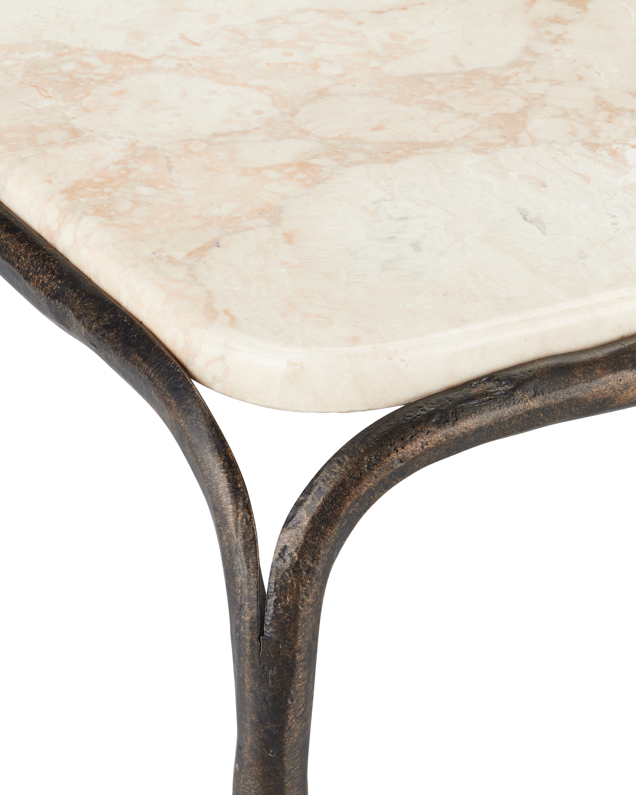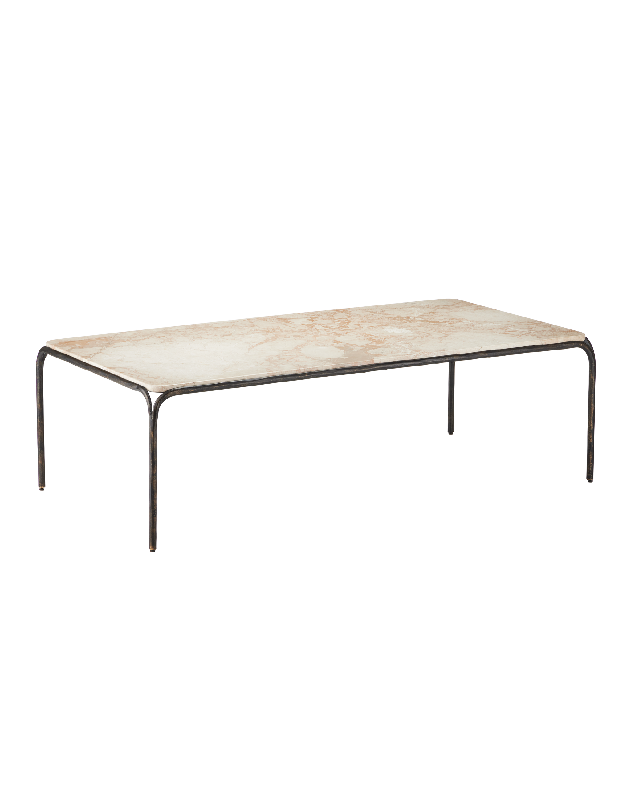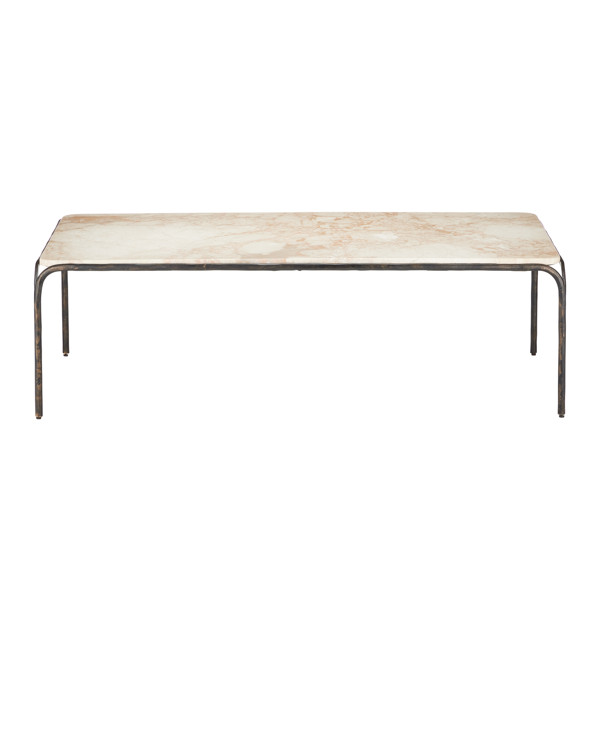• The Crema Cocktail Table combines industrial elegance with artisanal craftsmanship. Its metal frame, finished in a warm bronze, has a hand-forged appearance that adds depth to its streamlined silhouette. Supporting a luxurious crema marble top, the frame folds down and away at the corners, creating a striking forked design that echoes the refined detail found at the ends of the stretcher where it meets the legs. This is a sizeable table at 54 inches long.