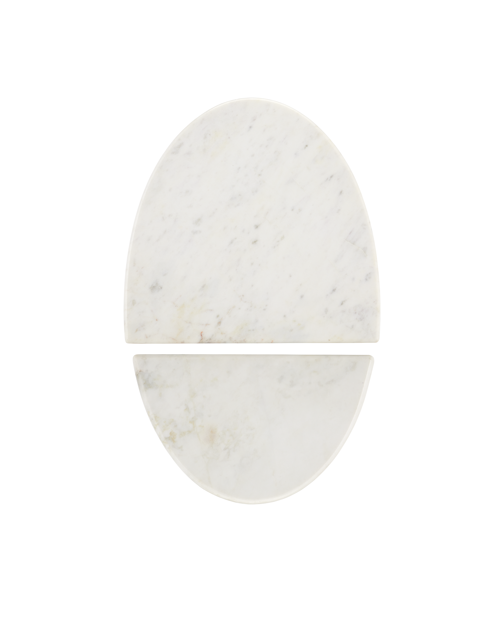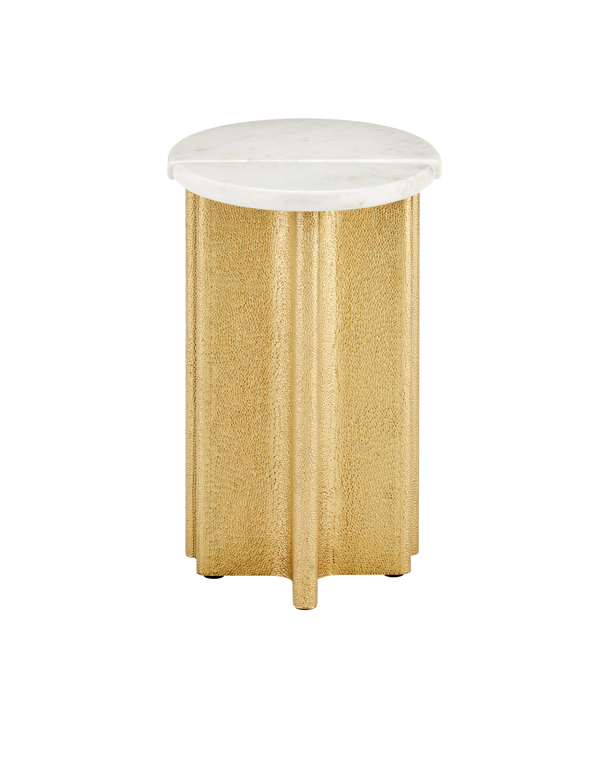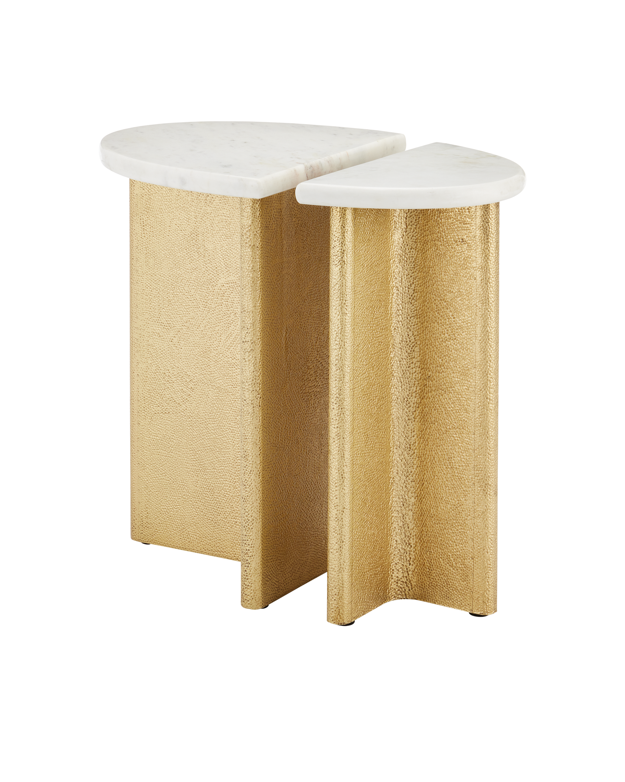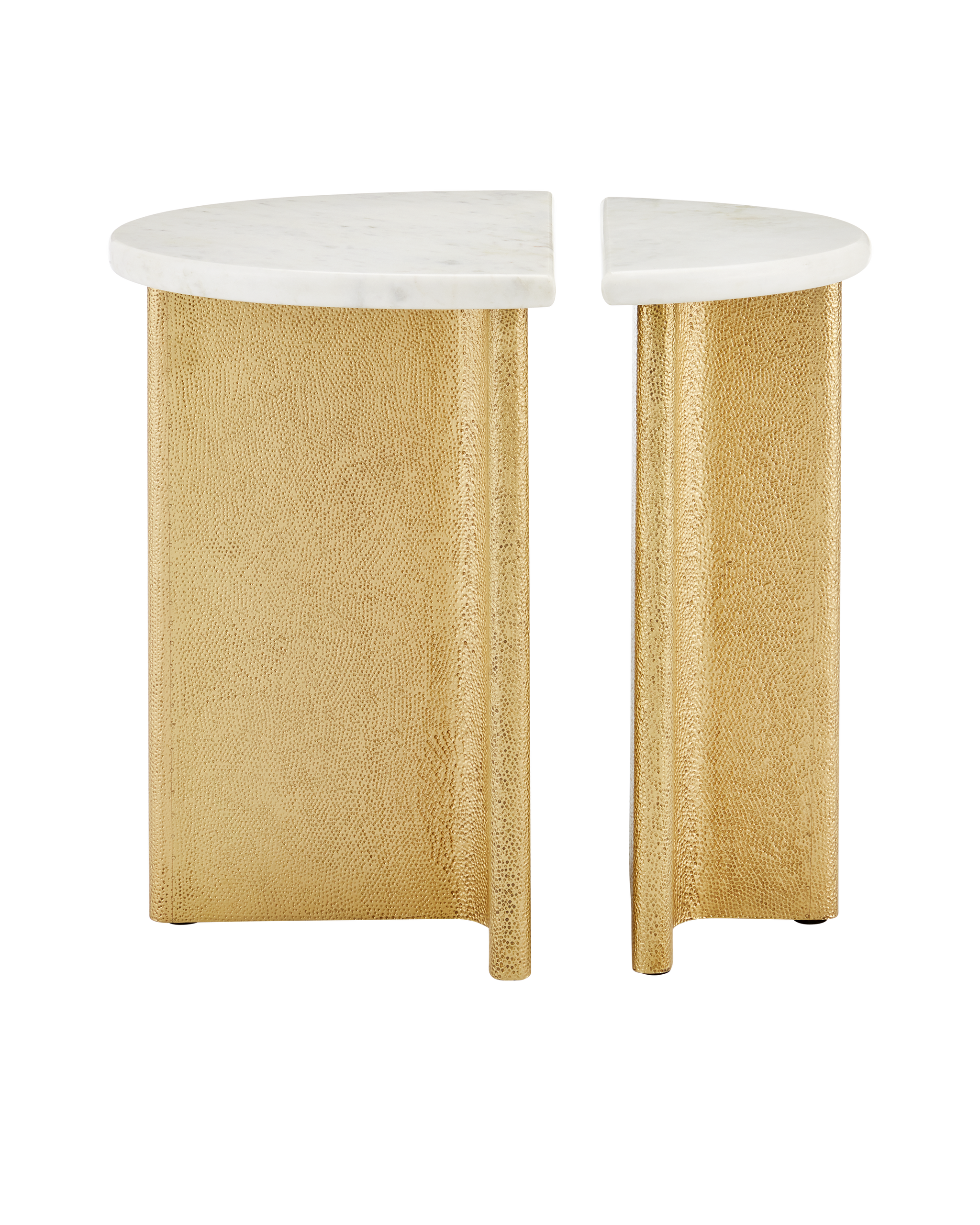 • The Doublet Marble Accent Table Set includes two compact tables, which can stand independently or be placed back-to-back to create an oblong tabletop. The bases are wrapped in brass sheeting, which is hand-hammered with an intricate swirling pattern that creates a serpentine texture. Finished in antique brass, the bases contrast beautifully with the white Banswara marble tops, creating a striking juxtaposition of warmth and coolness.