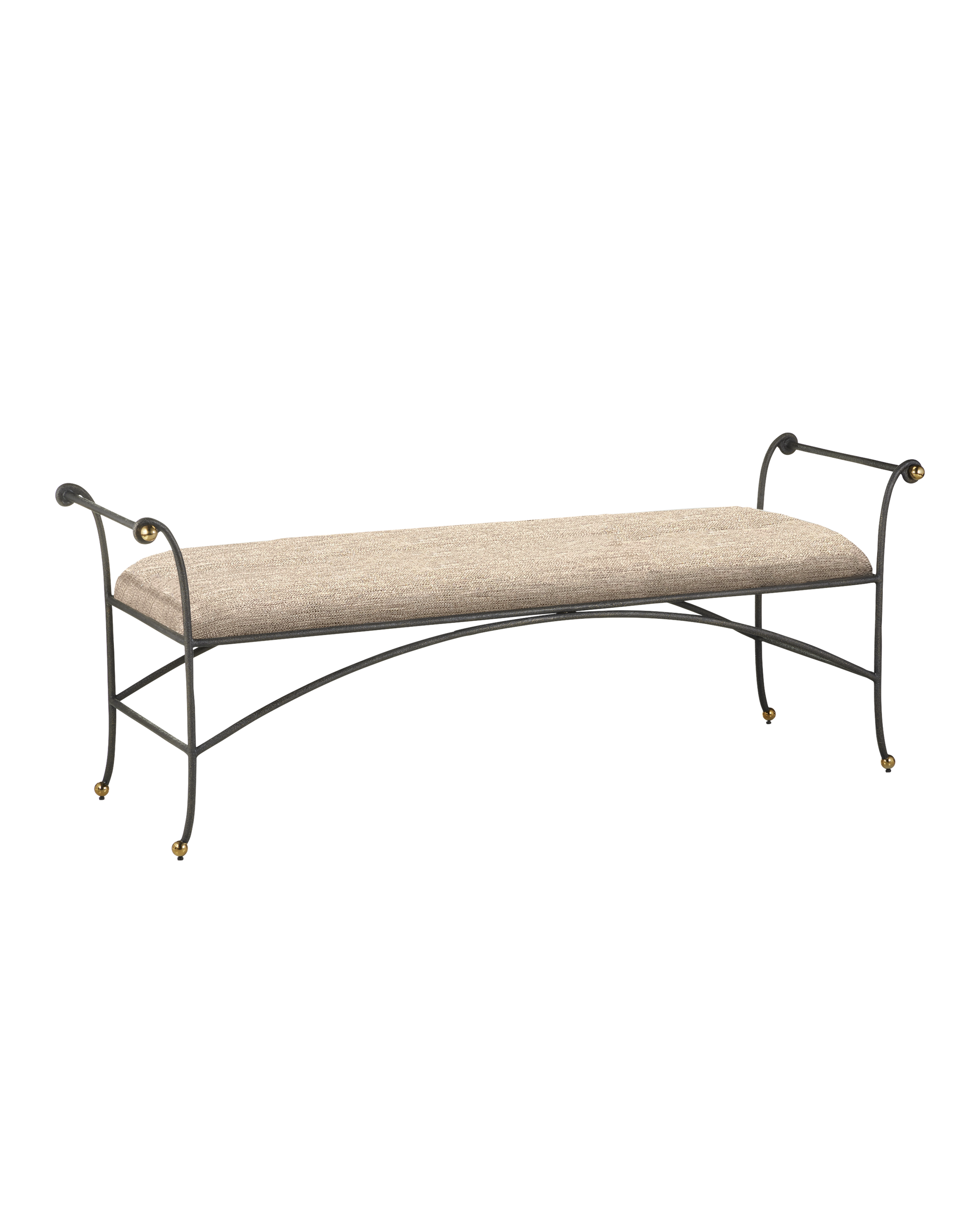 • The Mabel Bench is a classic design constructed of textured steel, which has a light gold rub that shows through. Special accents are the polished brass stainless steel ball feet and arm details, as well as the way the stretchers arc up toward the seat. The upholstered top is covered in a woven brown-beige performance fabric, and the seat is a generous 55 inches wide.
