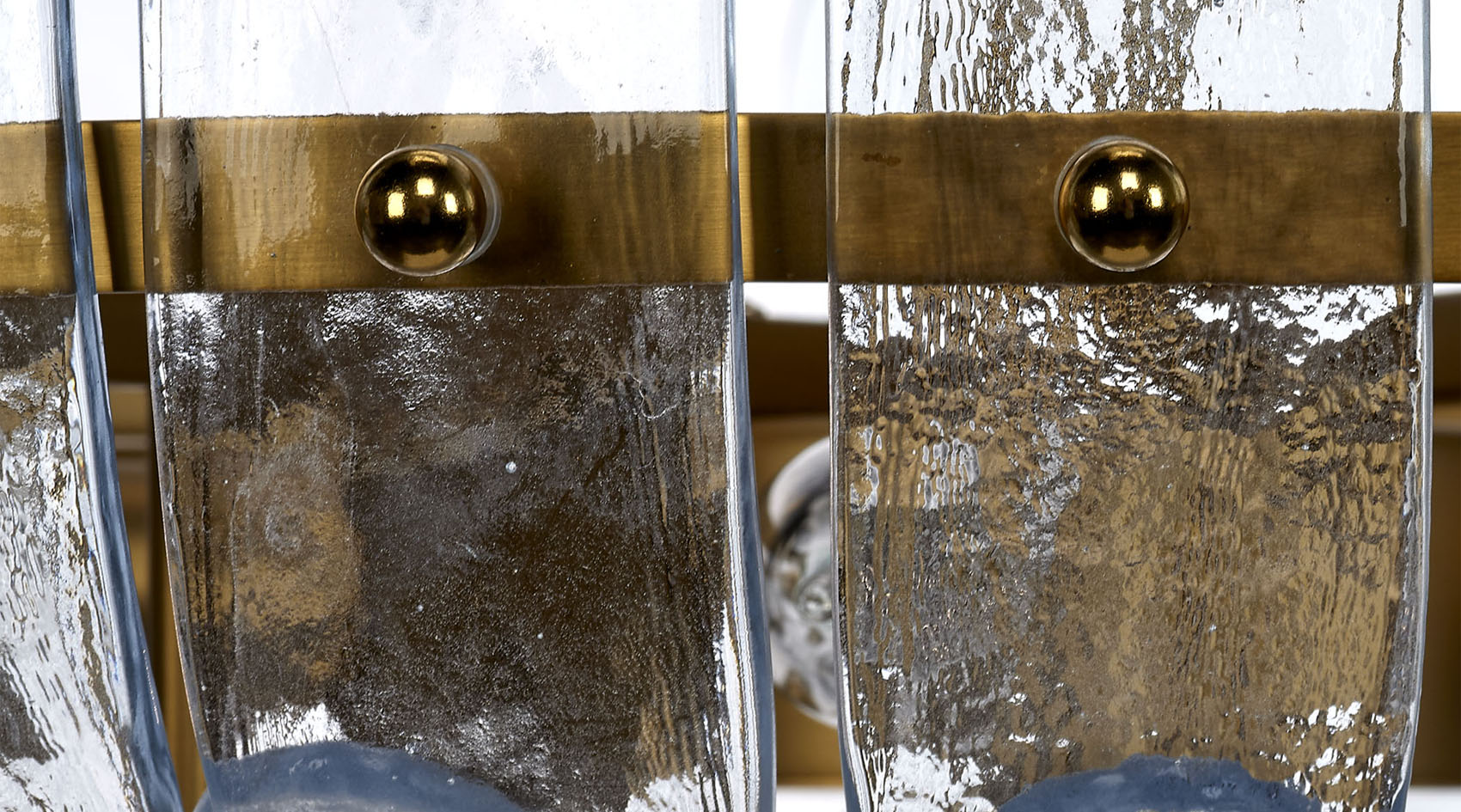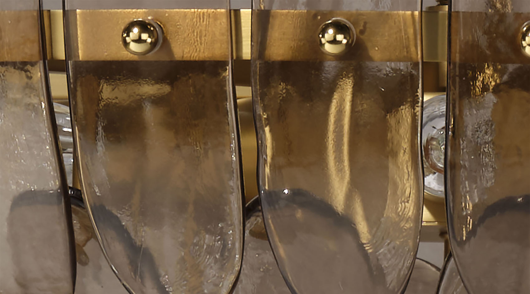 Curved ovals of glass are carefully arranged in layers and bound with strips of iron in an antique brass finish to create this spectacular chandelier. Wonderfully versatile, it can dress up a casual breakfast nook or add a homey note to a more formal setting.