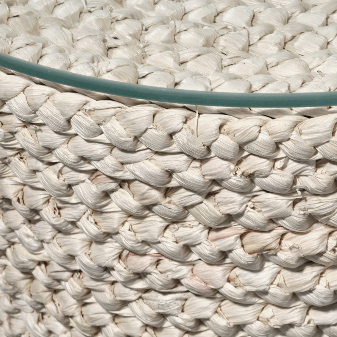 Expertly wrapped with rows of braided corn husk, this small side table features a sturdy tempered glass top, making it a perfect fit for any casually refined d‚cor. The unfinished husk showcases a rich variety of natural colors, adding unexpected depth to its neutral palette. The overall effect is a refined tropical charm that is simply lovely.