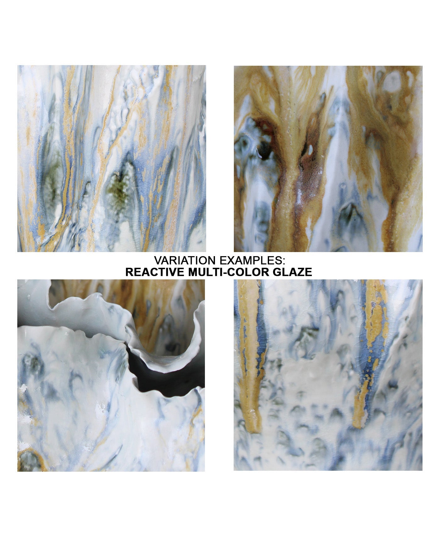 • Inspired by the ocean spray created by a breaching whale, these vases capture the exuberance of that moment in ceramic form. From the crimped openings to the expertly applied blue reactive glazes, each vessel is handcrafted and finished with care. No two are identical.