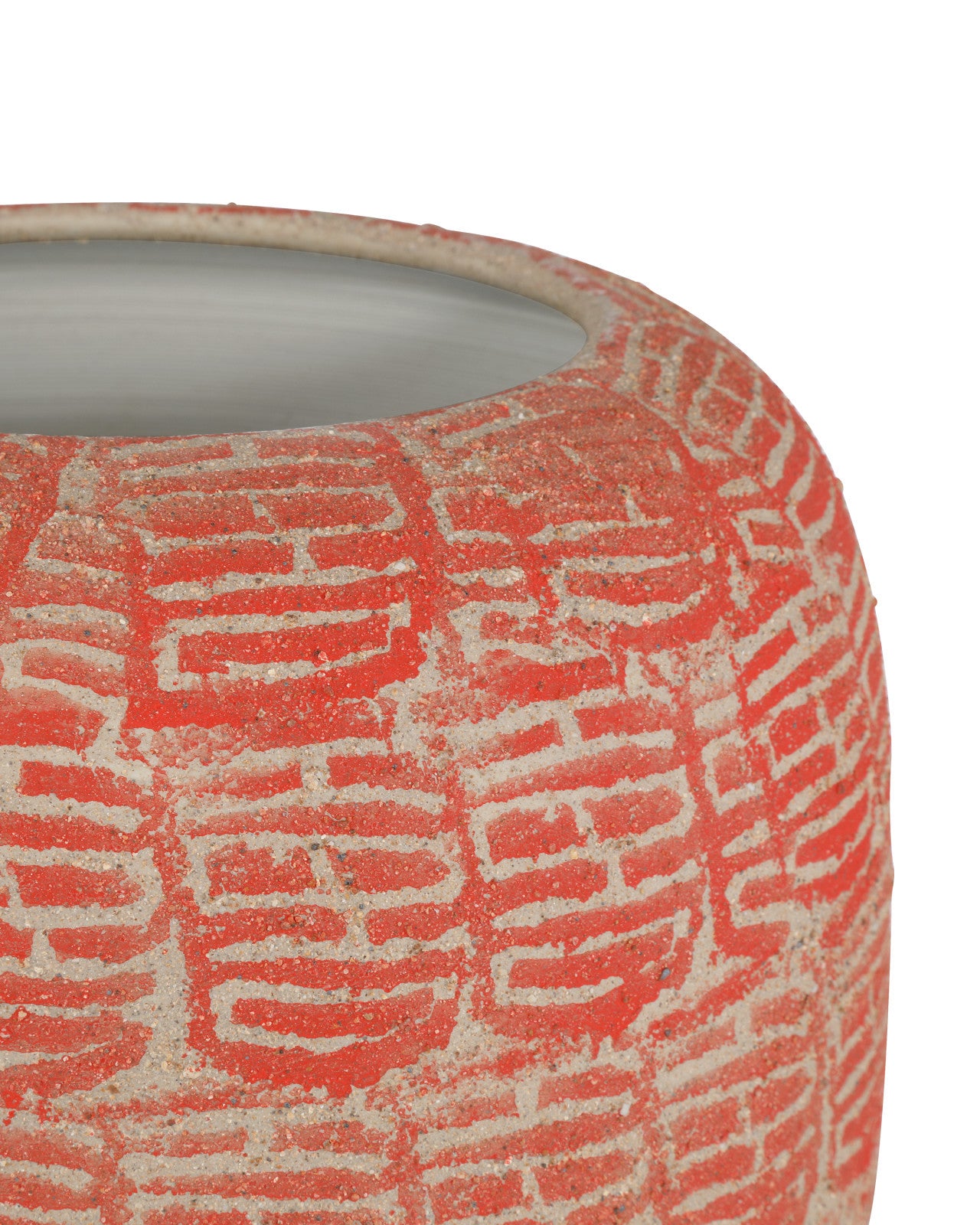 • Red and beige porcelain jar stamped with motifs resembling Chinese characters.