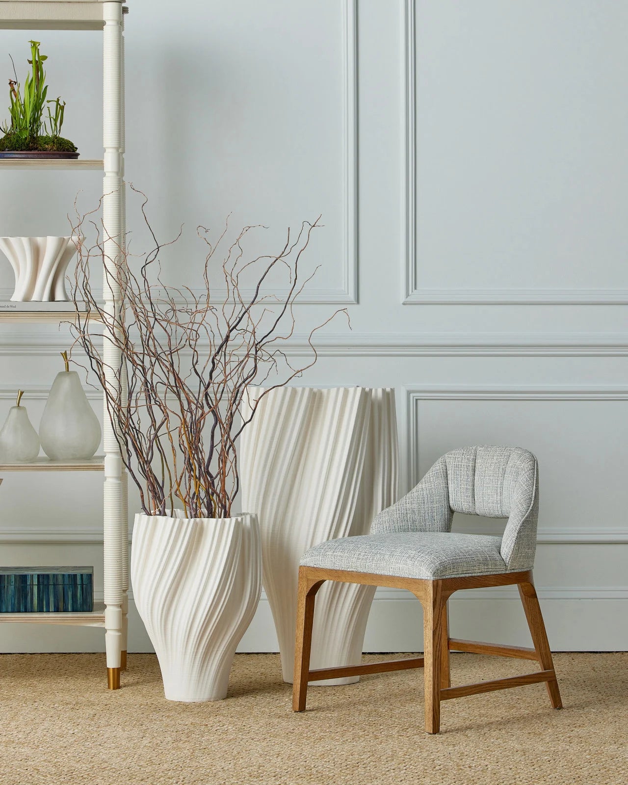 • The Currey & Company Whorl Grande White Vase is crafted from 3D-printed porcelain to resemble an elegant upside-down tassel.