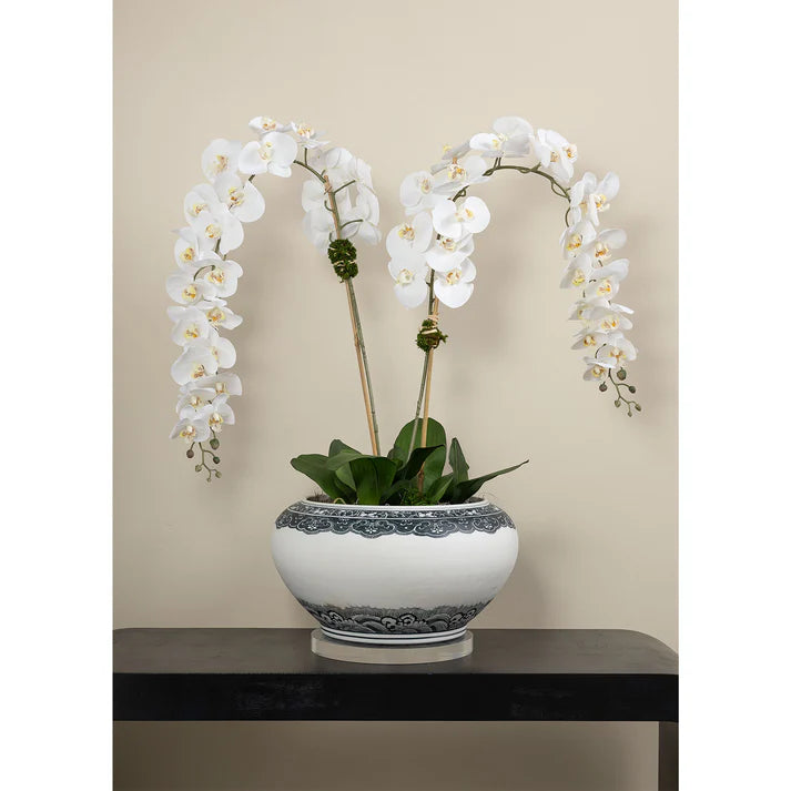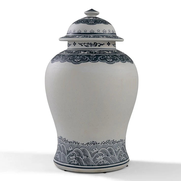 Ming is Port 68's classic Asian inspired ginger jar which features a blue & white or indigo and white glazed porcelain finish. Jar has a lift off lid / top. Available in two sizes.