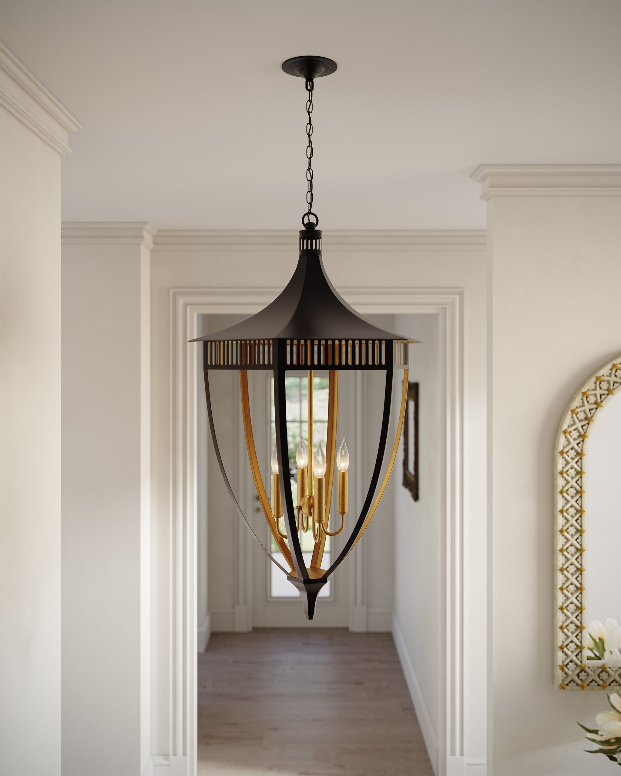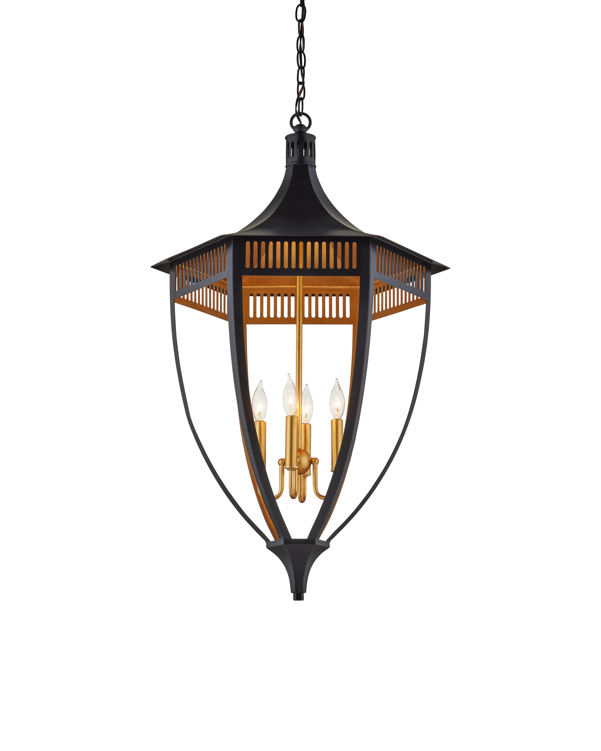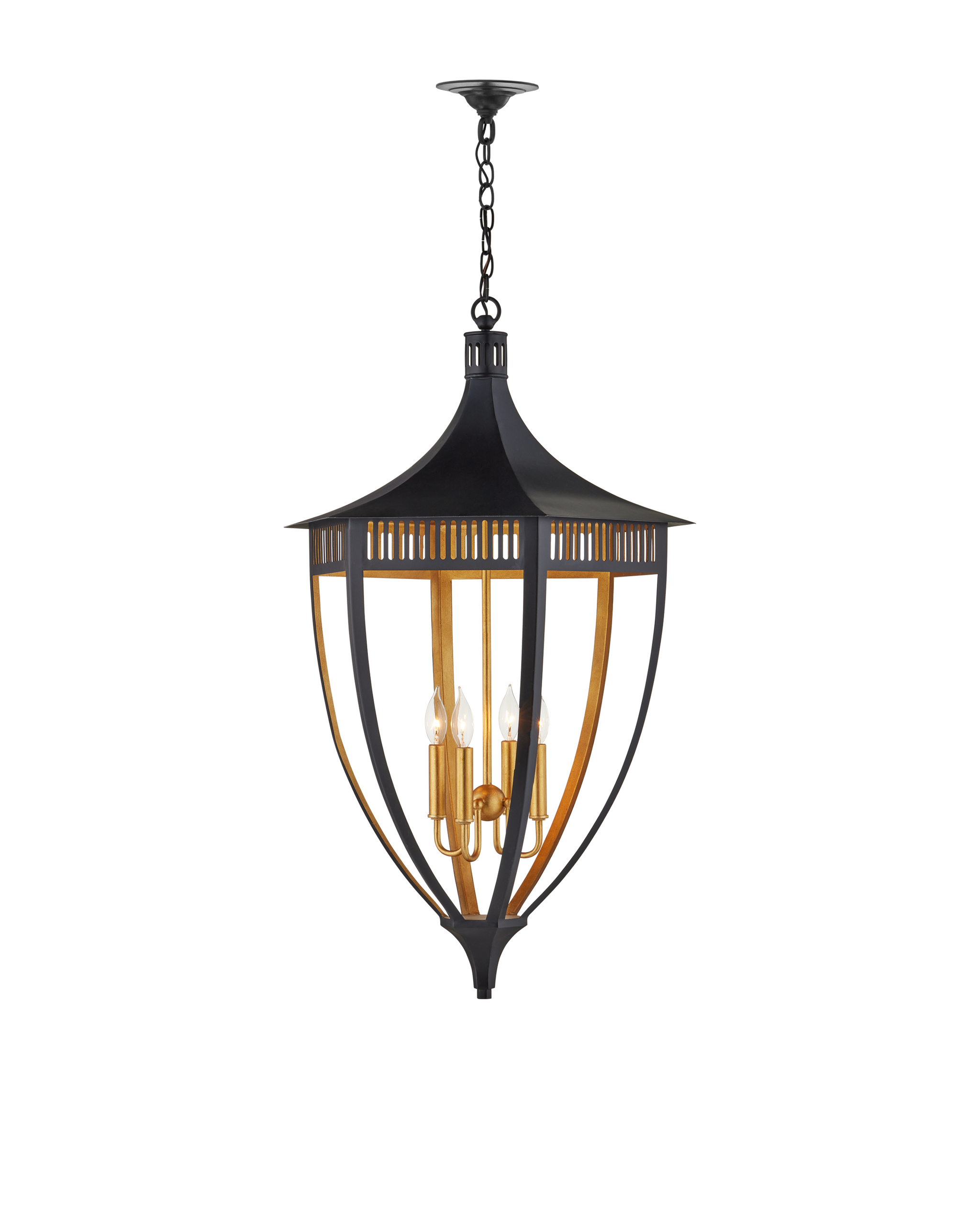 • In the Bunny Williams Collection, the Wycombe Lantern has the classic lines for which this lauded designer is known. Made of wrought iron, the refined lantern is finished in a mix of satin black and contemporary gold leaf finishes. Because the interior of the black lantern is covered with gold leaf, the illumination coming from it will warmly glow. The grillework that runs along its circumference where it meets the domed top is an elegant feature. Adjustable from 44.75" to 112.75" with use of included chain/rod kit/cable. If your space calls for a longer drop, additional chain/rods/cable is available for purchase.