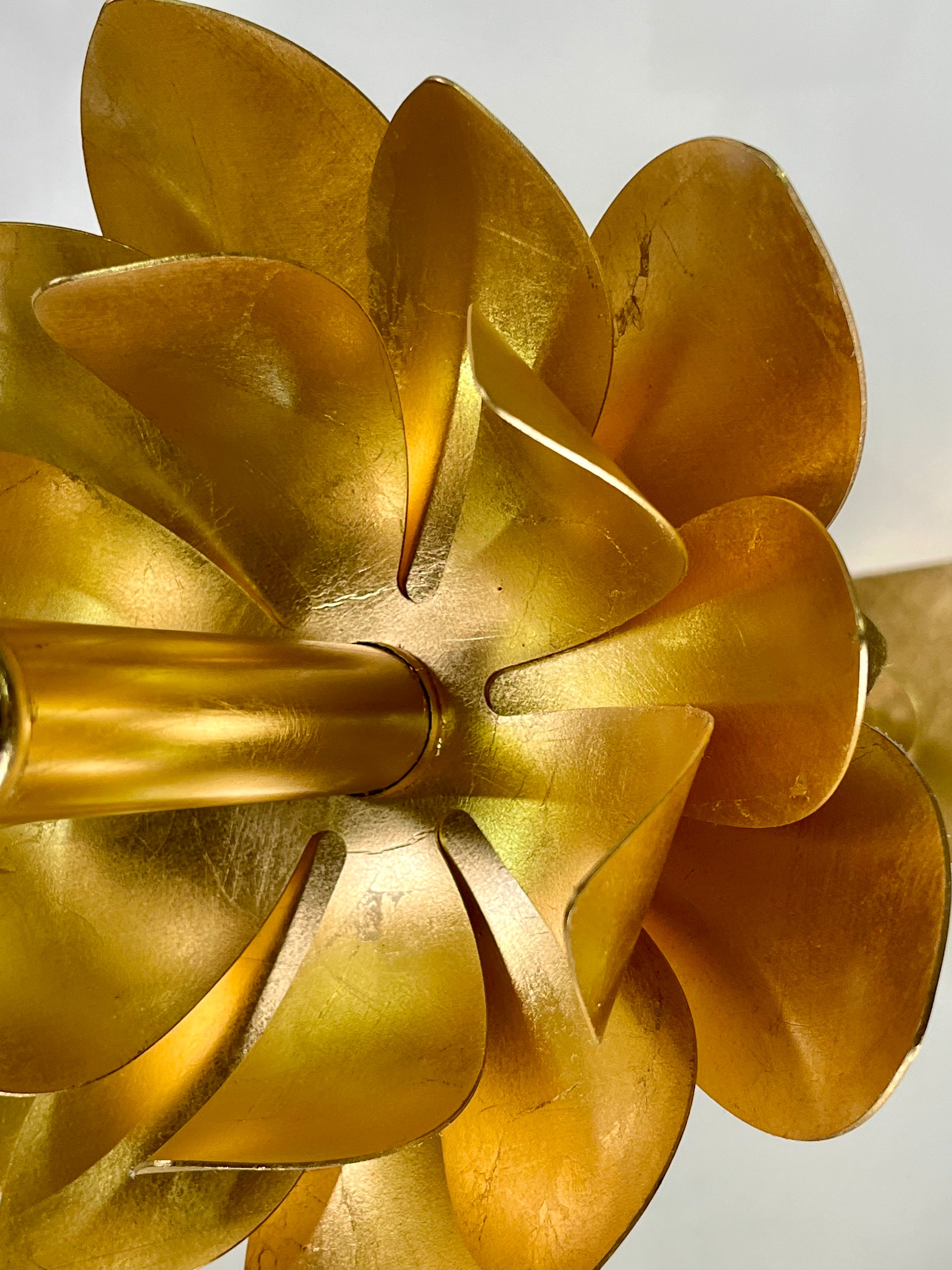 This beautiful chandelier by Old World Design features six white linen shades and an elegant gold leaf finish.