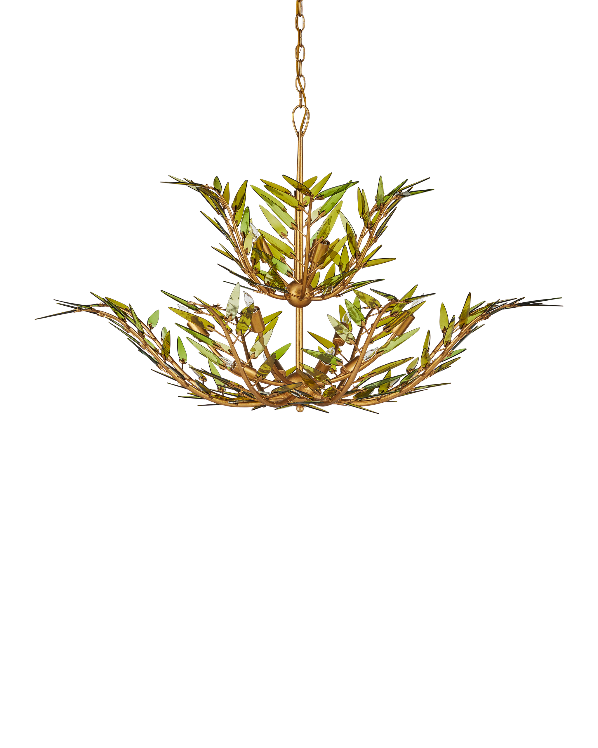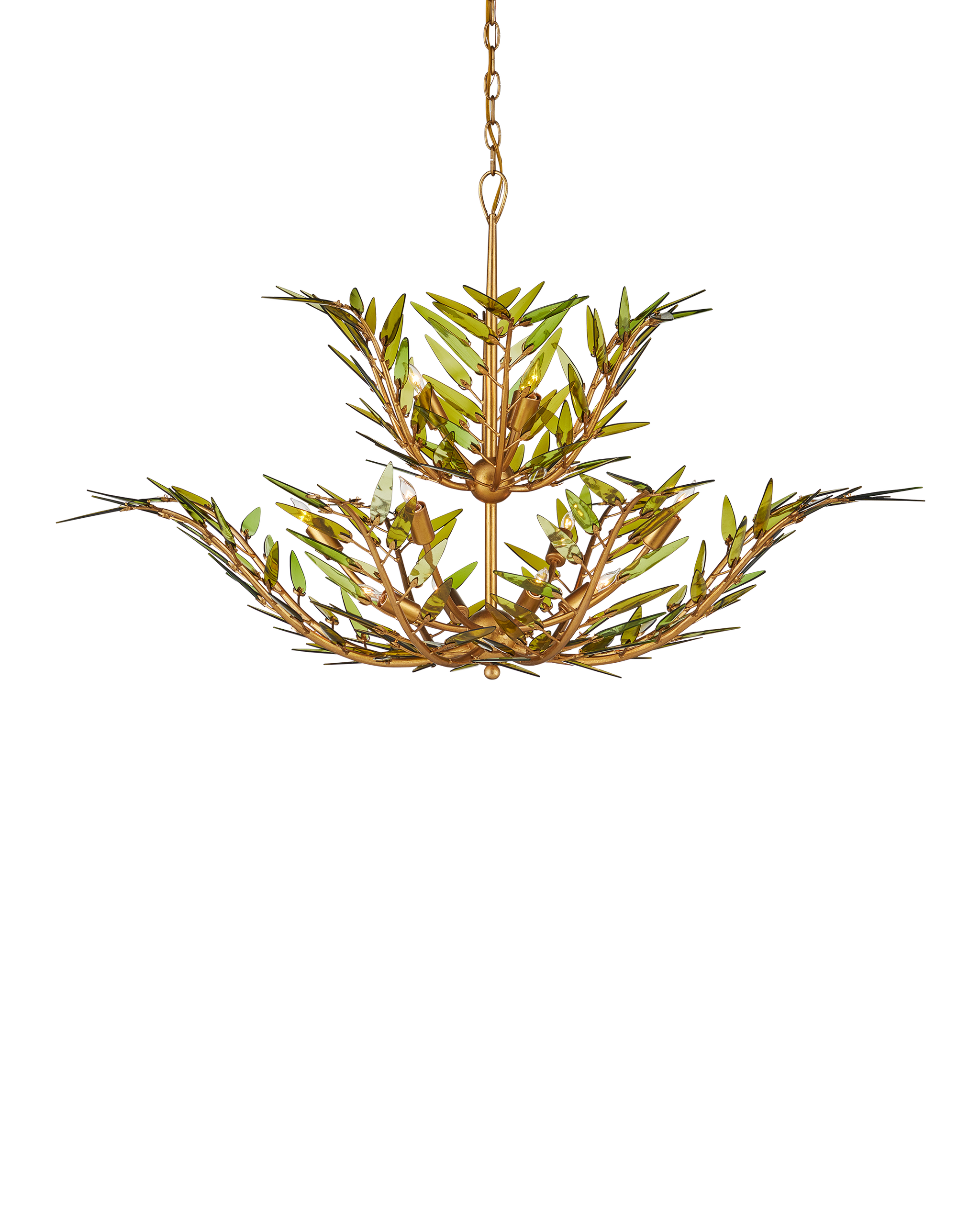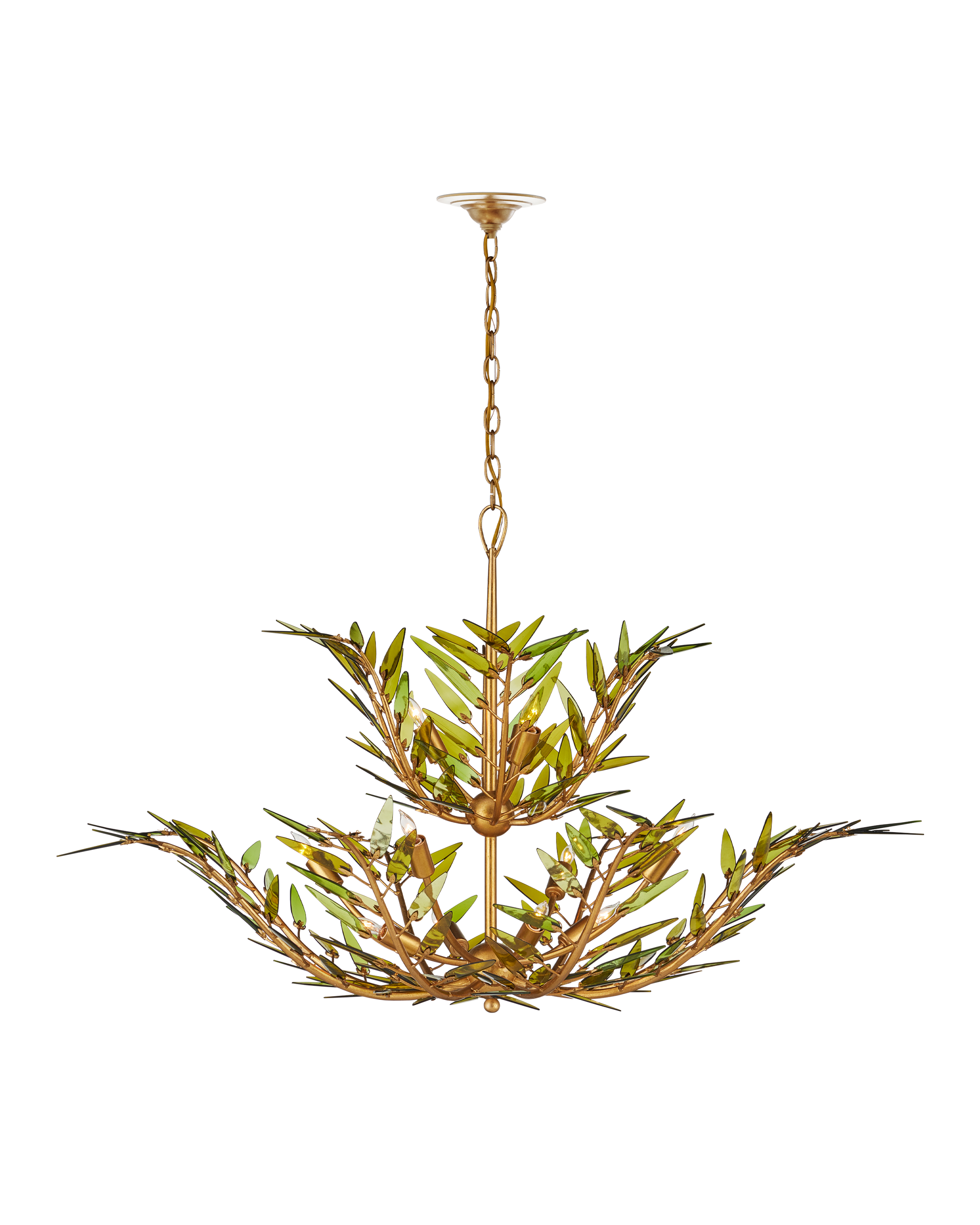 • The Babylon Two-Tier Chandelier is formed from slender, curving stems of wrought iron in a contemporary gold leaf finish that have been shaped into an elegant floral silhouette. The tapering spikes are adorned with elongated green glass leaves, each hand-cut from recycled wine bottles, that look as if they are being stirred by a breeze. The edges are individually polished by hand and placed on the frame with metal pins that resemble the shapes of the glass pieces. There will be slight variations in color in the leaves on this dimmable 11-light chandelier. Adjustable from 33" to 101" with use of included chain/rod kit/cable. If your space calls for a longer drop, additional chain/rods/cable is available for purchase.