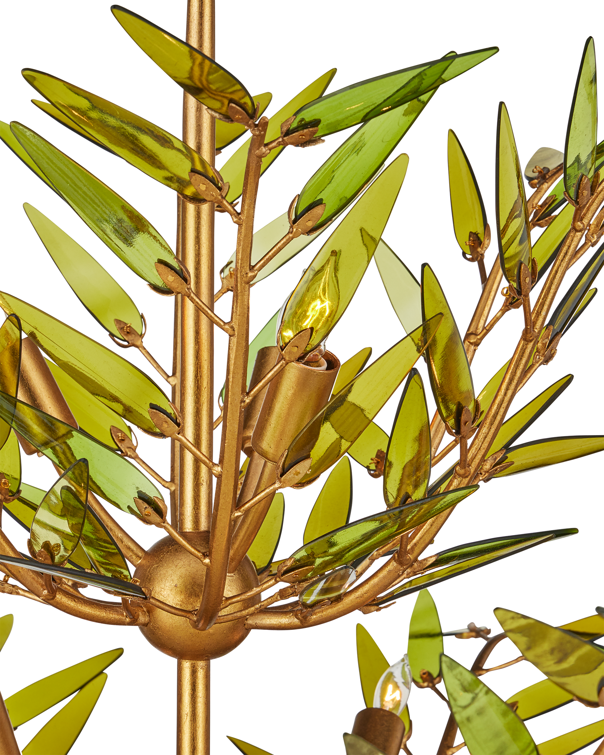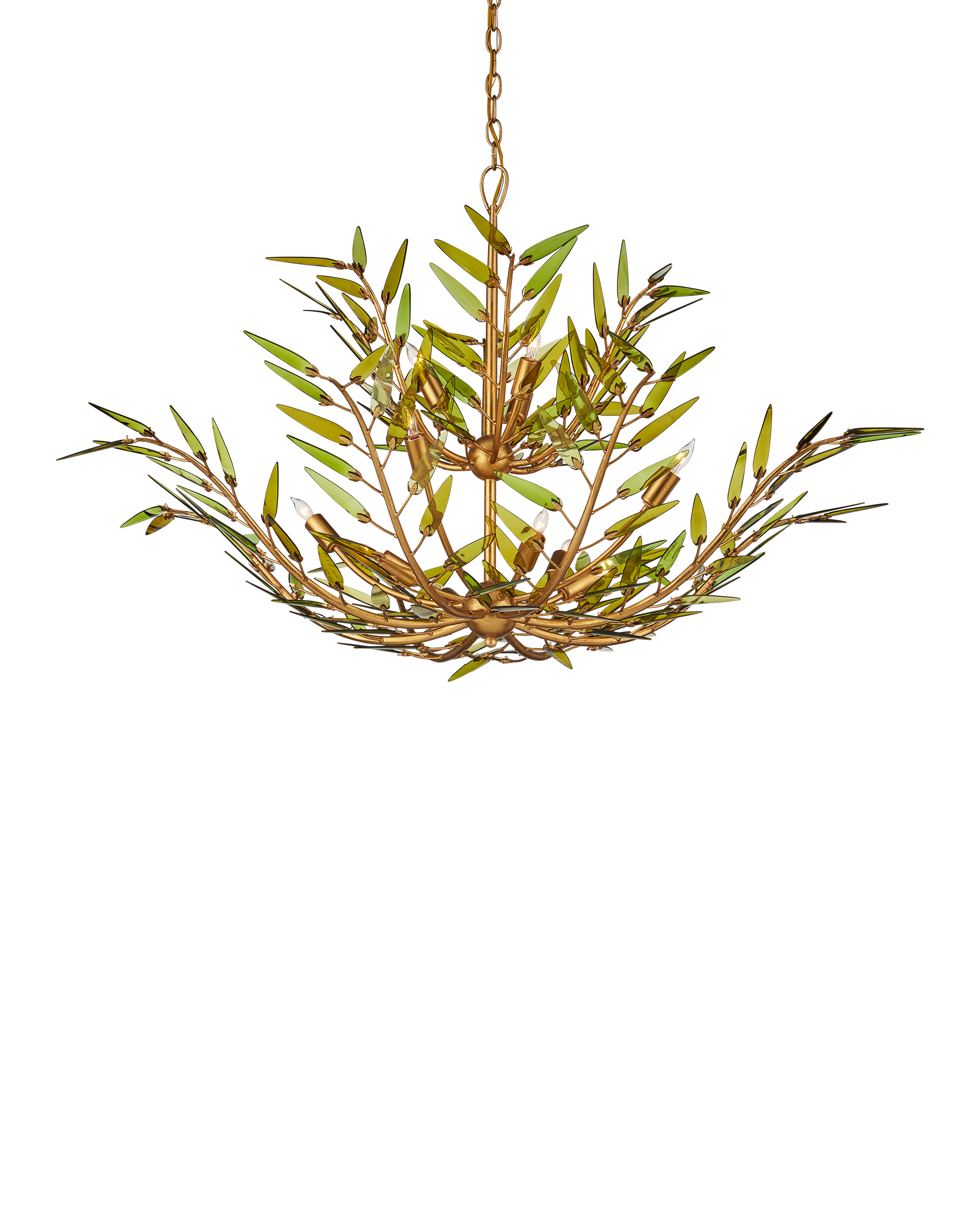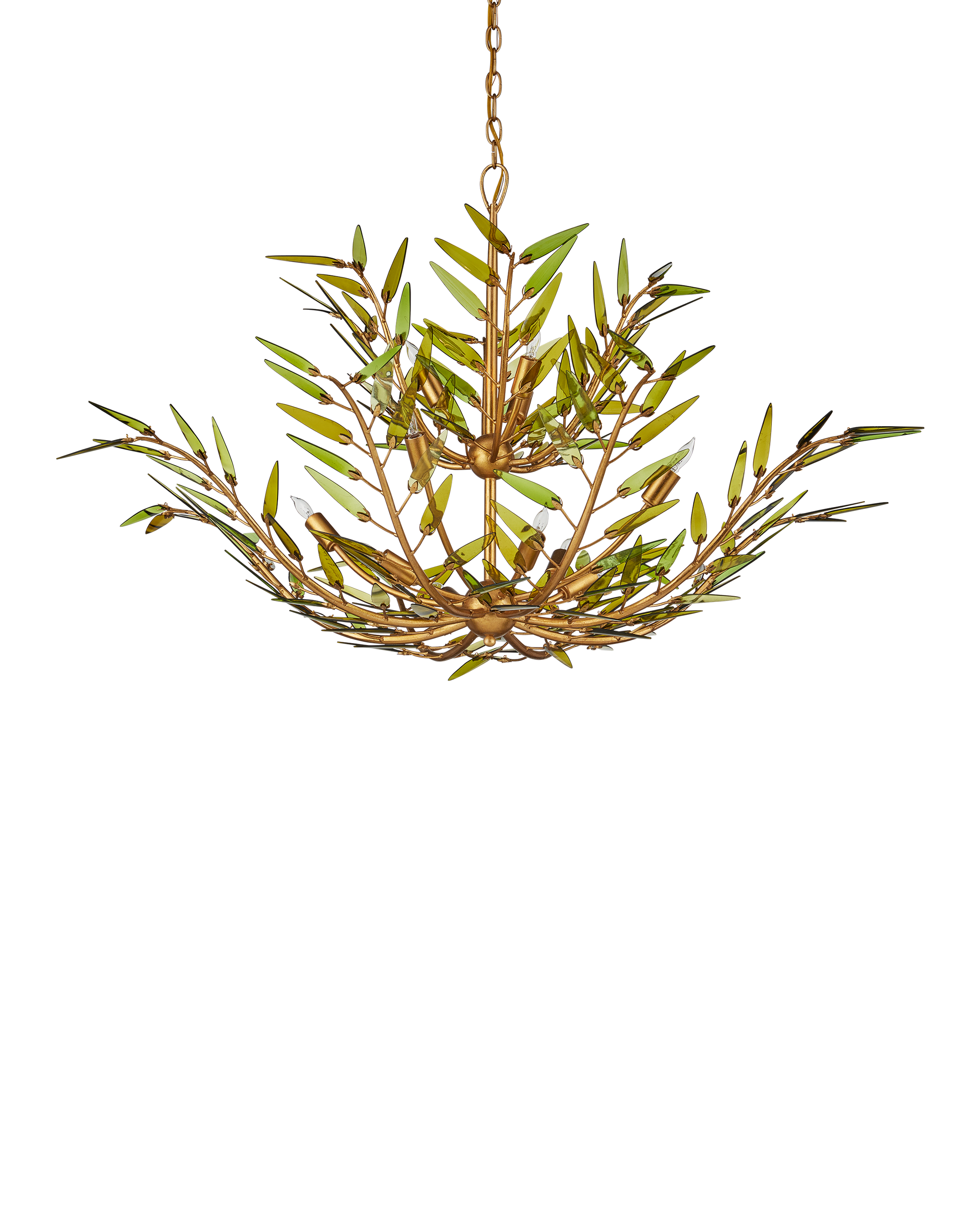 • The Babylon Two-Tier Chandelier is formed from slender, curving stems of wrought iron in a contemporary gold leaf finish that have been shaped into an elegant floral silhouette. The tapering spikes are adorned with elongated green glass leaves, each hand-cut from recycled wine bottles, that look as if they are being stirred by a breeze. The edges are individually polished by hand and placed on the frame with metal pins that resemble the shapes of the glass pieces. There will be slight variations in color in the leaves on this dimmable 11-light chandelier. Adjustable from 33" to 101" with use of included chain/rod kit/cable. If your space calls for a longer drop, additional chain/rods/cable is available for purchase.