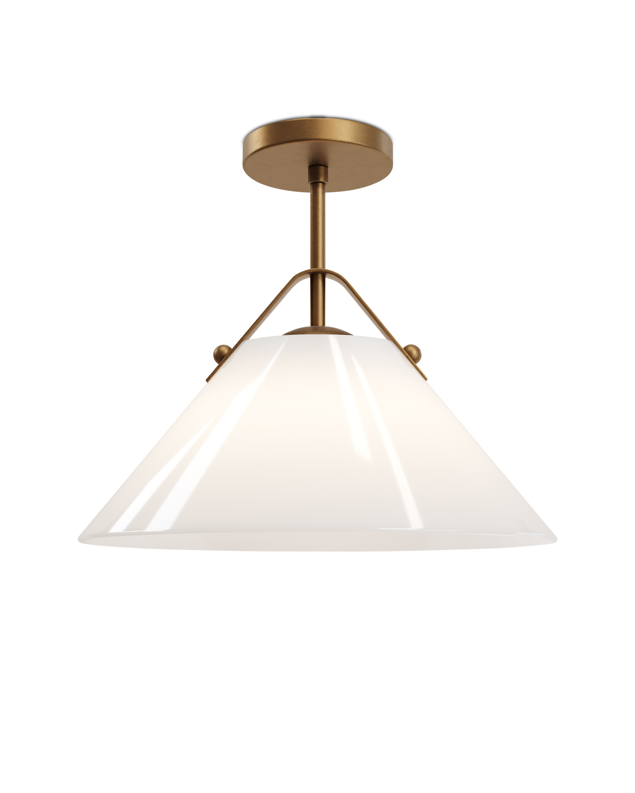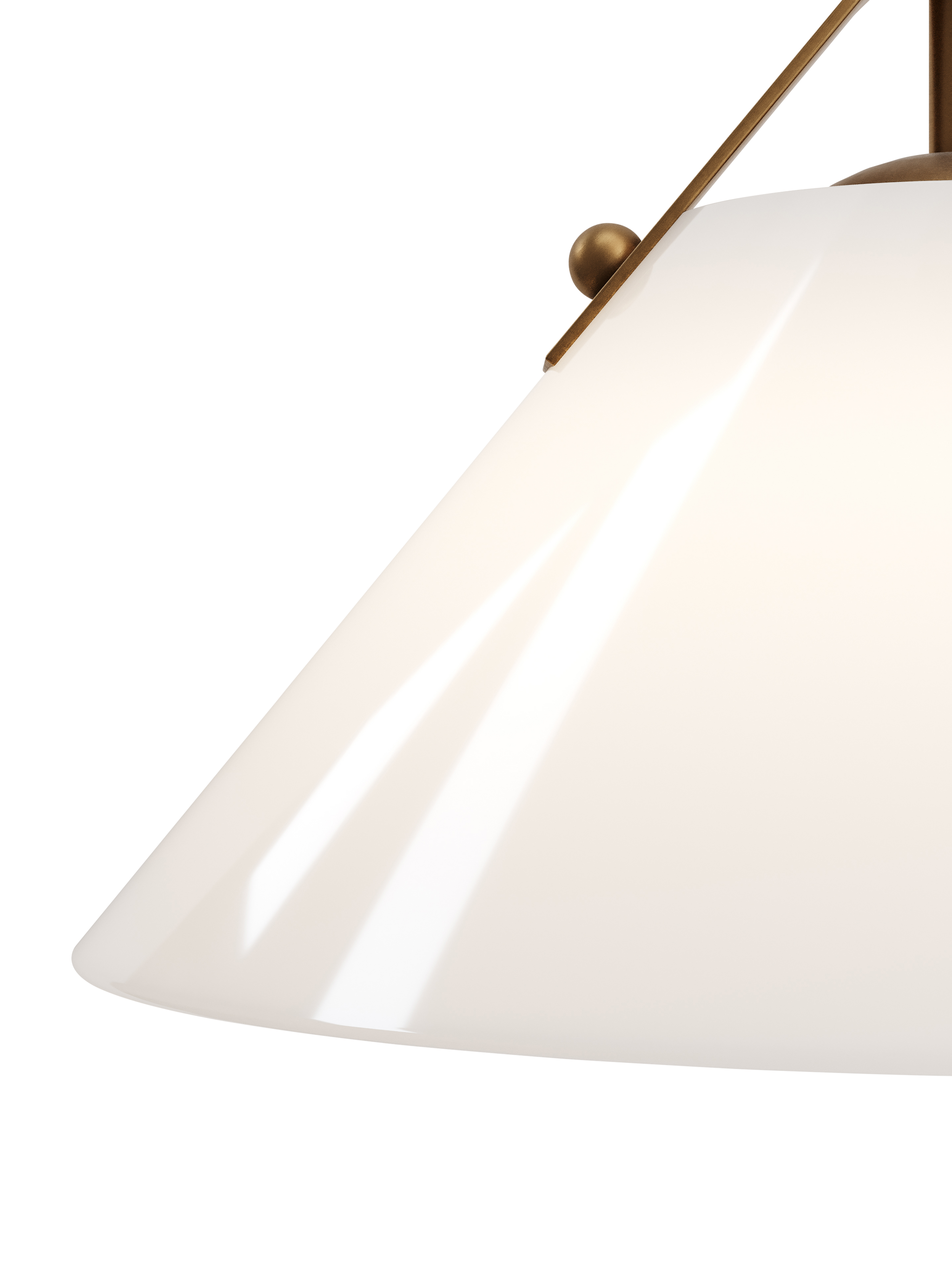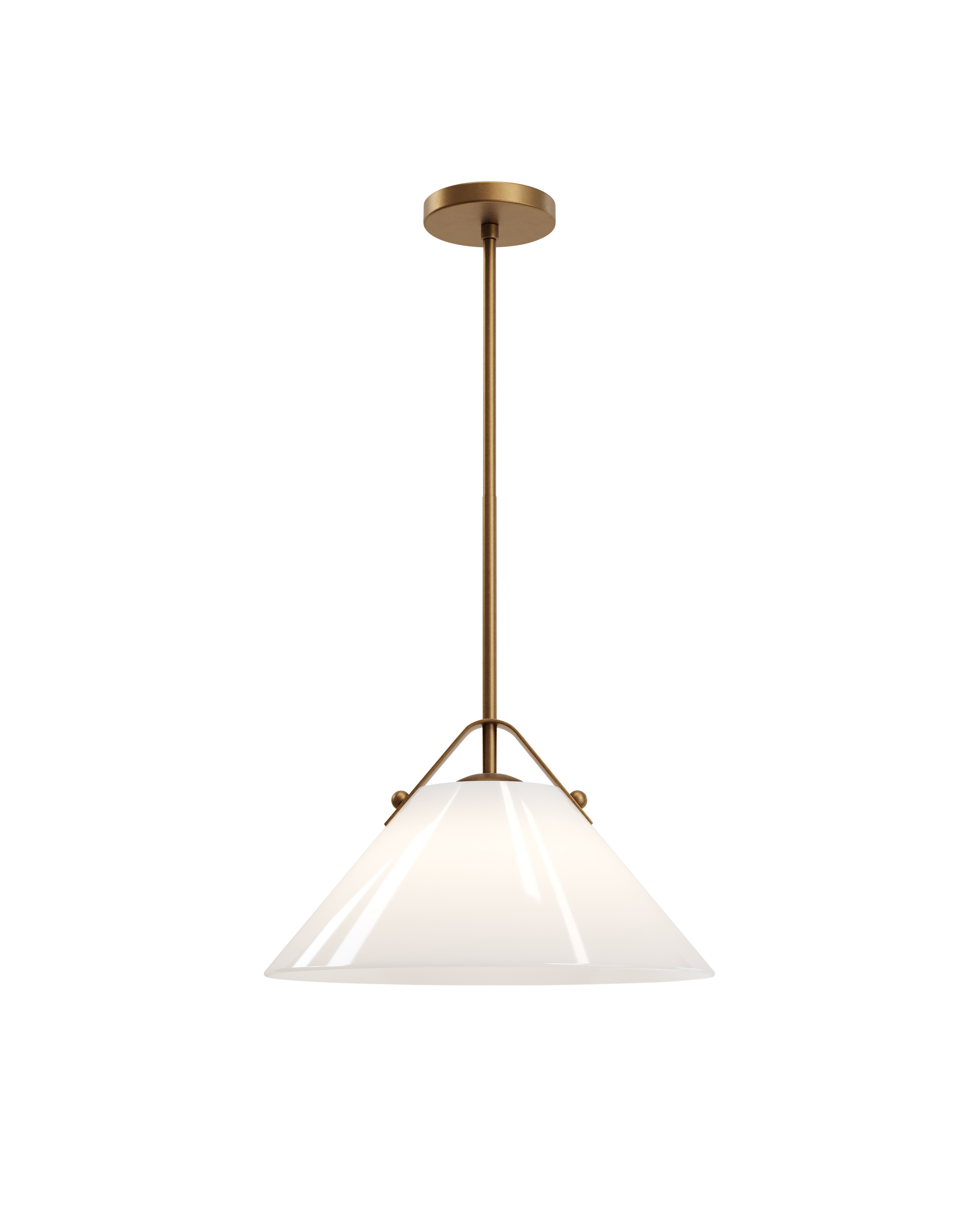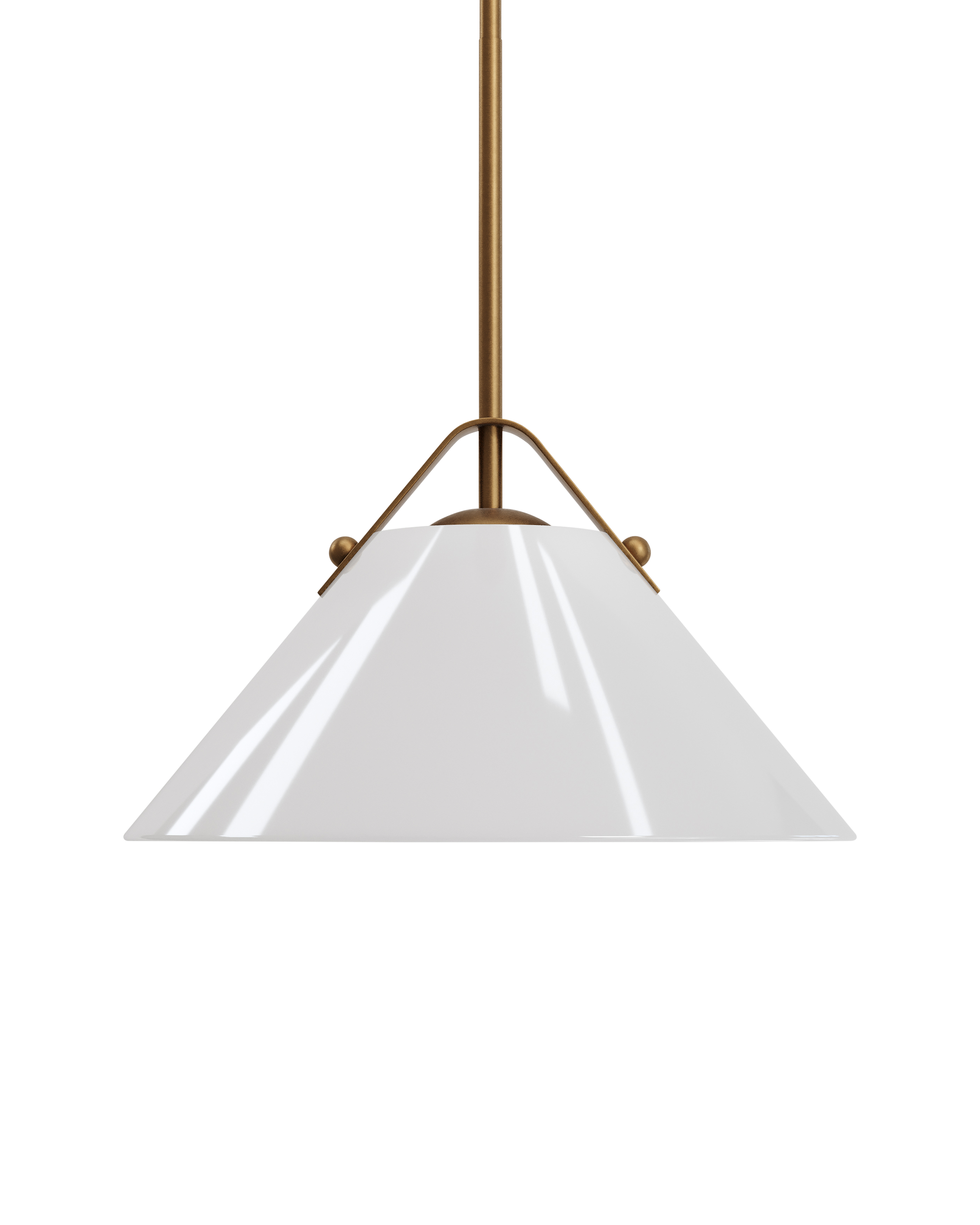 • The Bronwen Brass Pendant is an equestrian-inspired design with a flaring white glass shade fastened to the round canopy with a sophisticated strap—a subtle nod to classic tack hardware. The profile can lean modern farmhouse, though it also complements other design styles. The metal in an antique brass finish is a nice contrast to the paleness of the shade, which has a glossy surface that glows. At 19 inches in diameter, the one-light pendant is dimmable. Adjustable from 18" to 60" with use of included chain/rod kit/cable. If your space calls for a longer drop, additional chain/rods/cable is available for purchase.