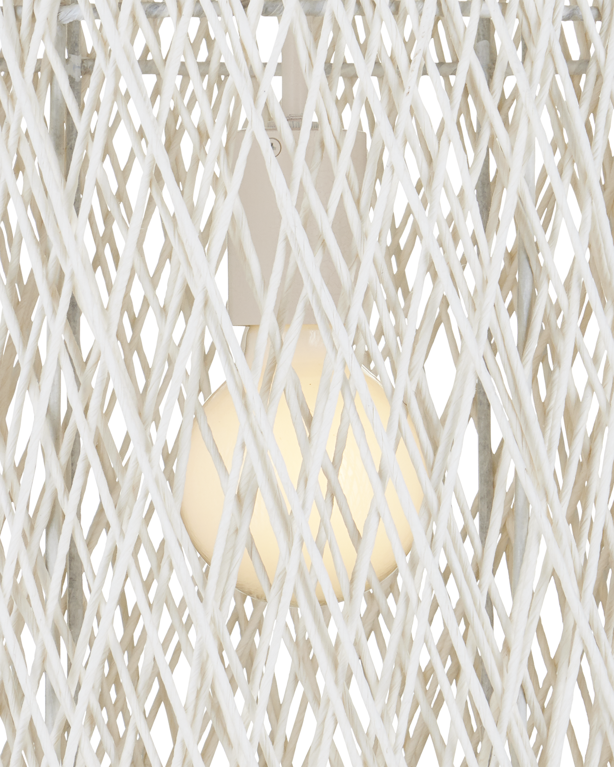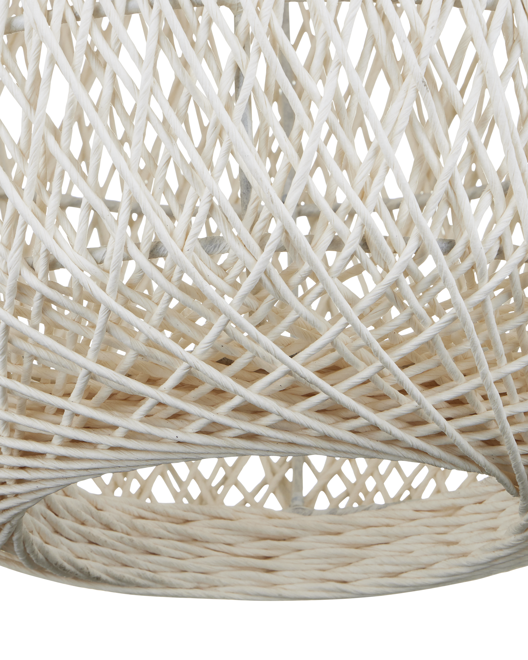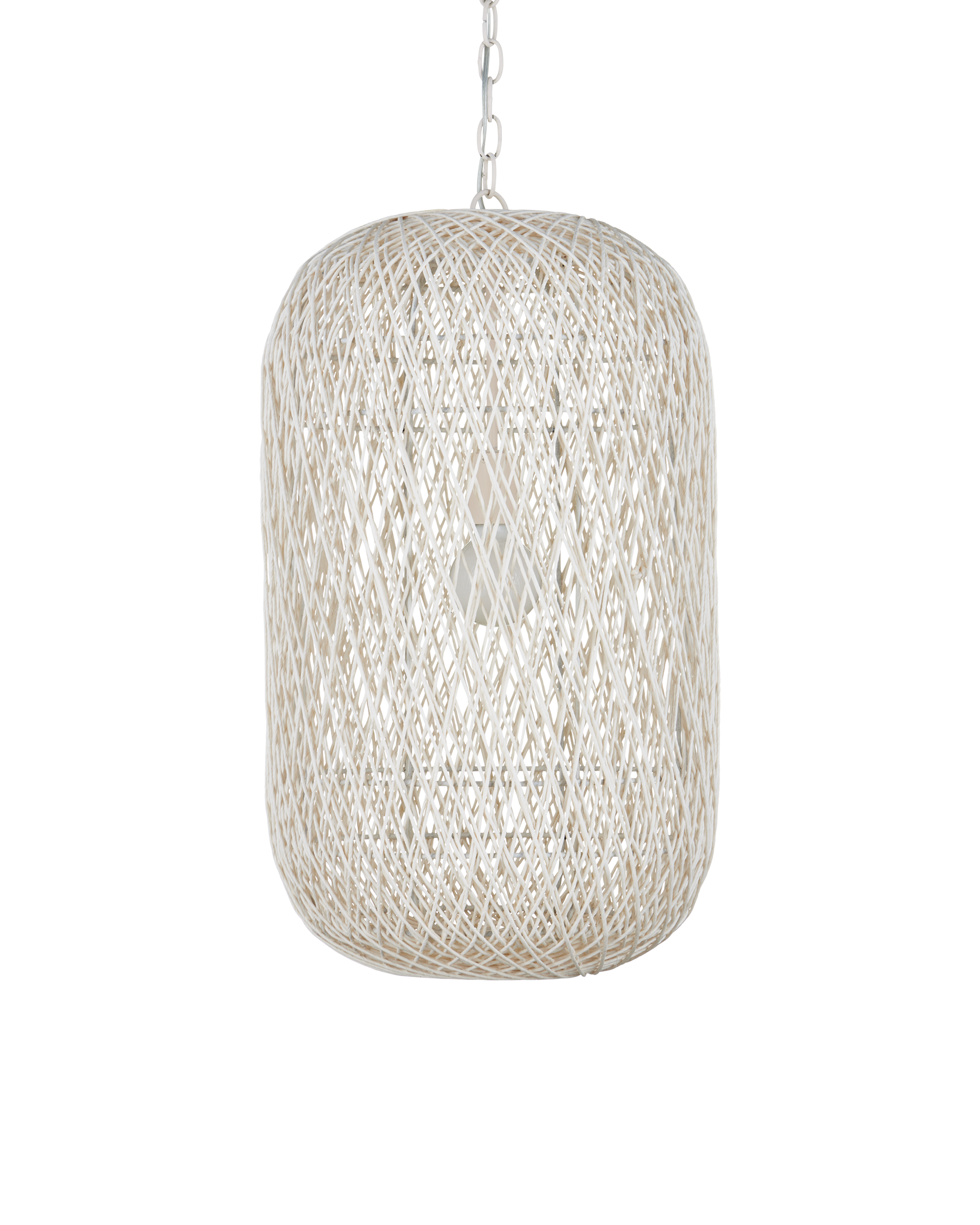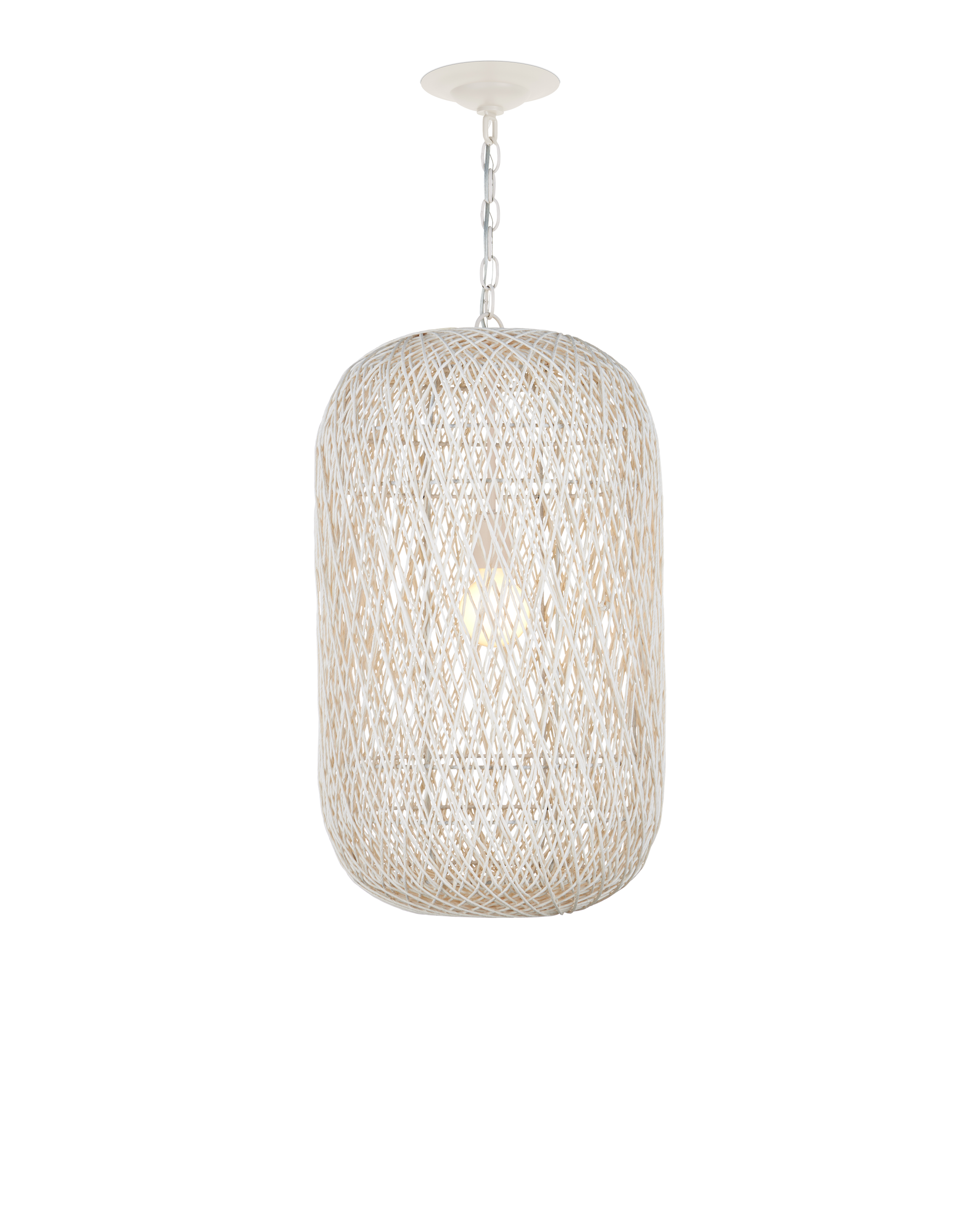 • The Cocoon Medium Pendant was inspired by a butterfly in chrysalis, but it is meant for grander-scaled duties as a light fixture. The white pendant has a wrought iron frame covered in a vanilla finish that is beautifully wrapped in Kraft paper twine in a cream finish. The skill and patience required to create such an even flow of string makes this an artisanal piece. Adjustable from 36" to 106.5" with use of included chain/rod kit/cable. If your space calls for a longer drop, additional chain/rods/cable is available for purchase.
