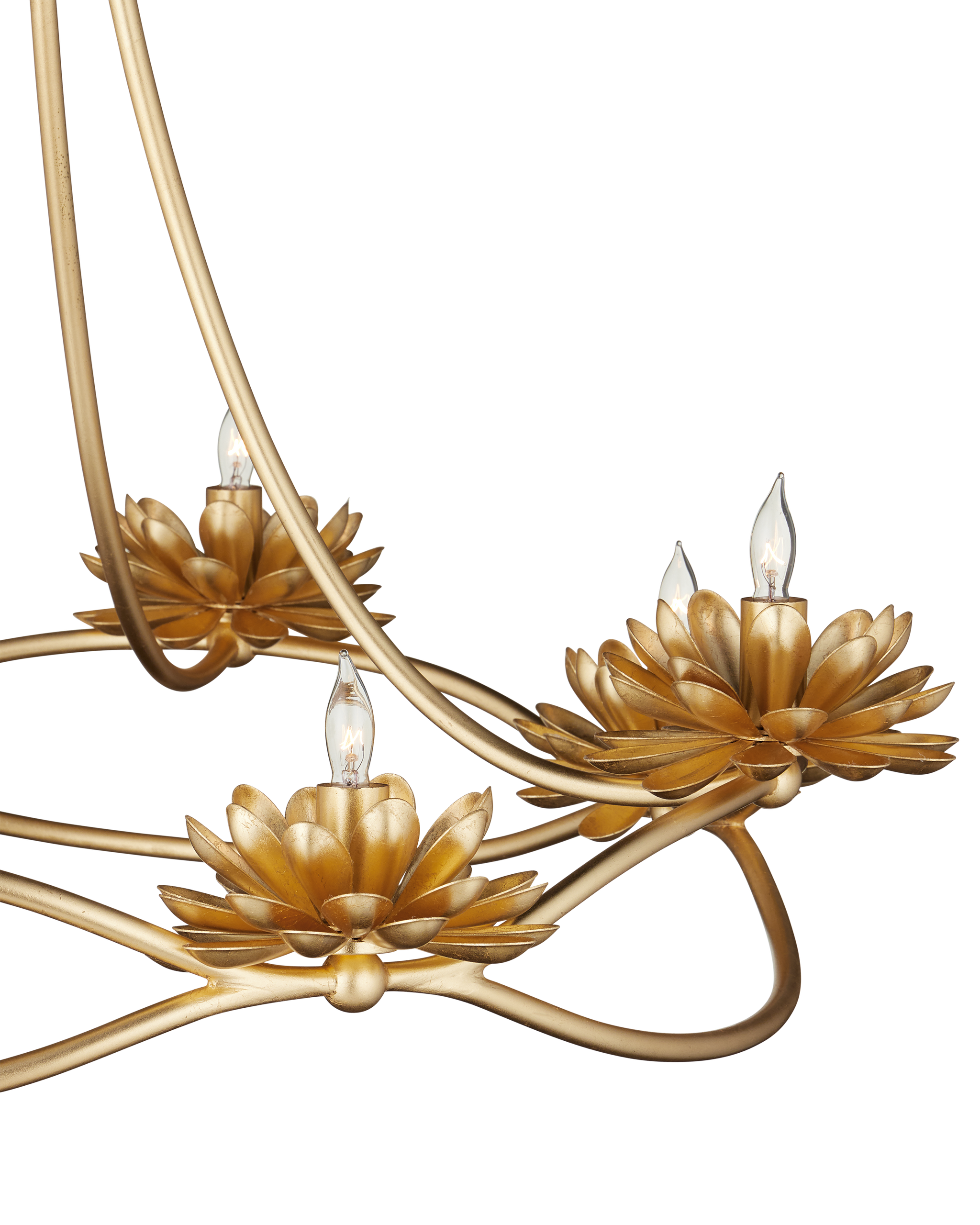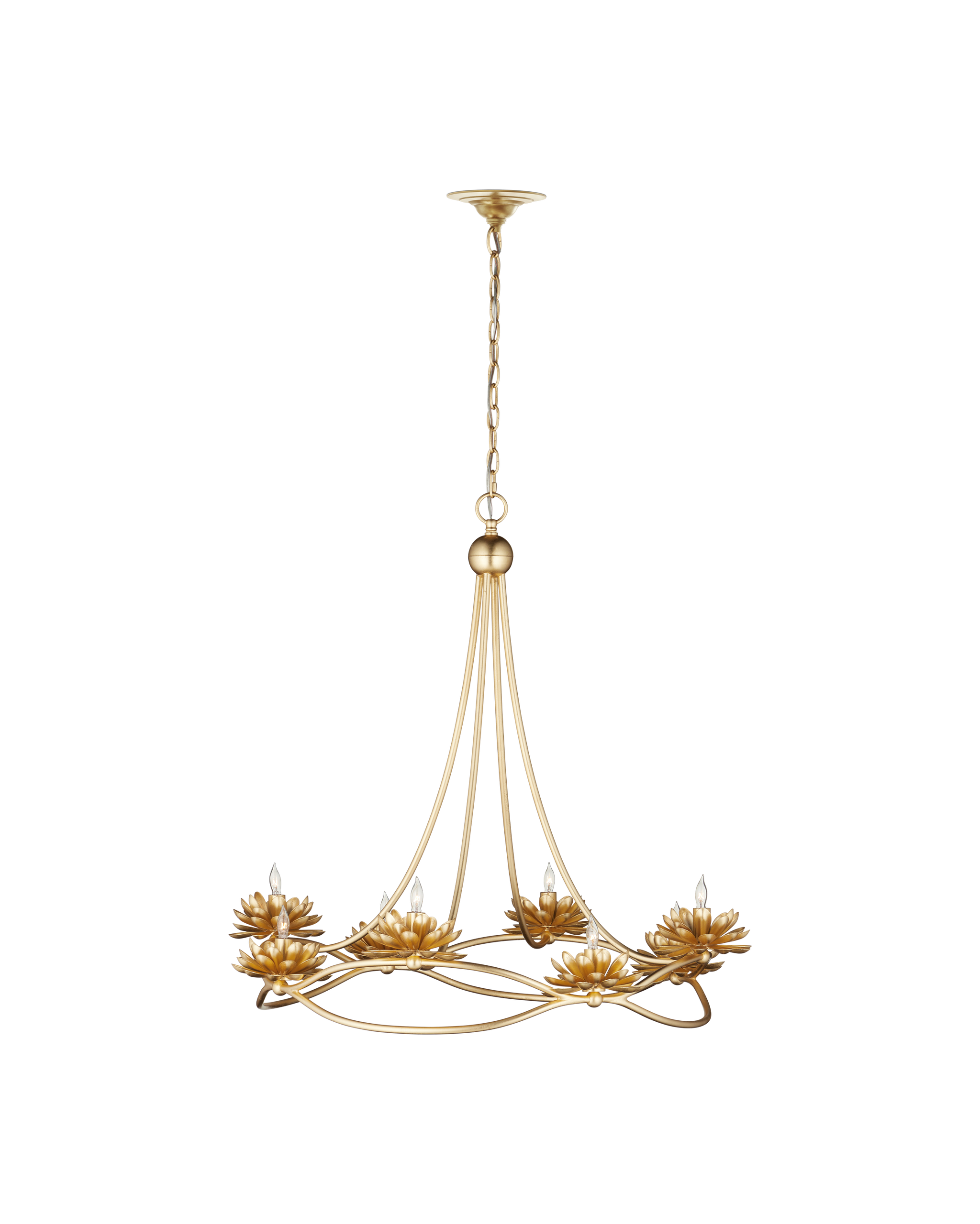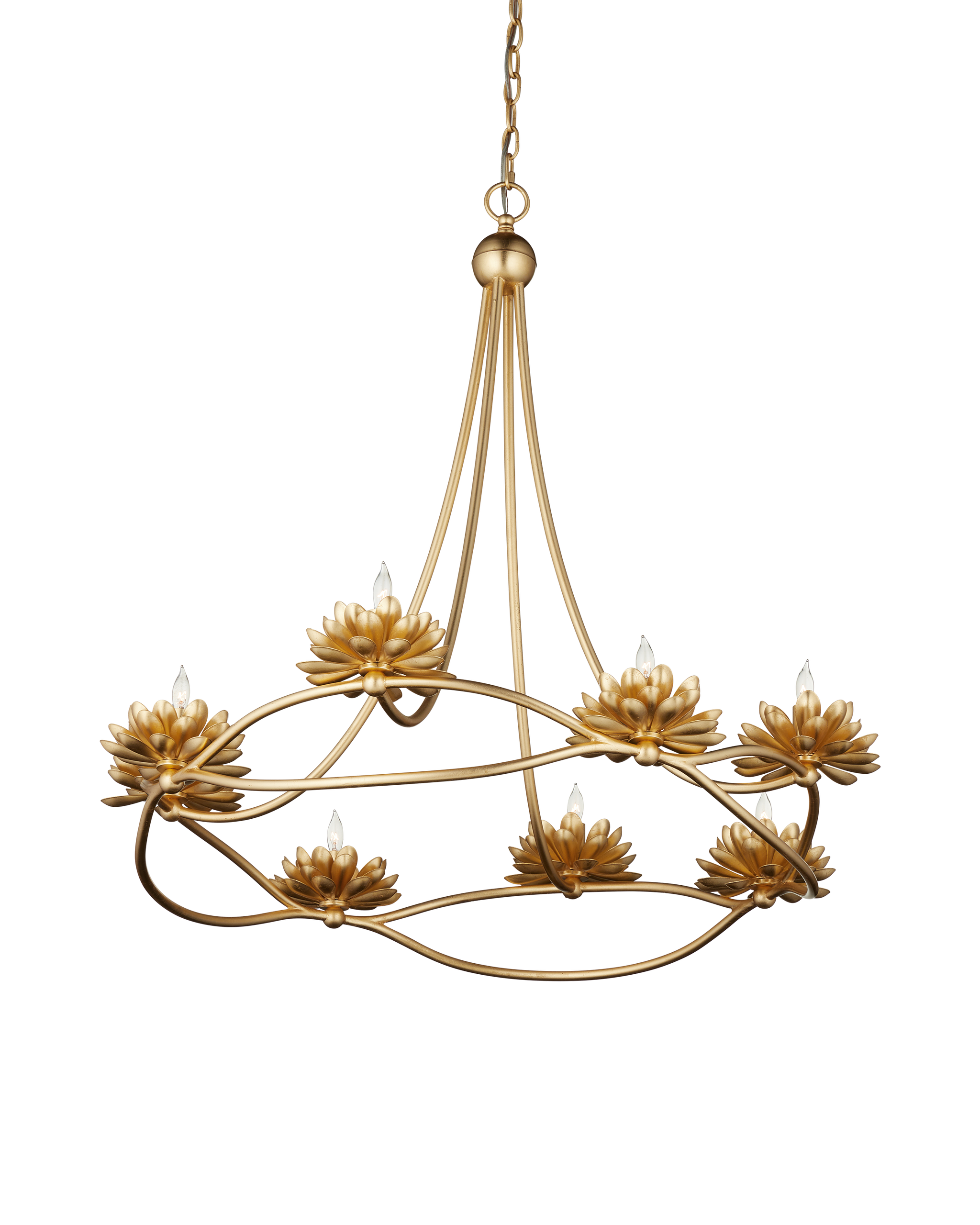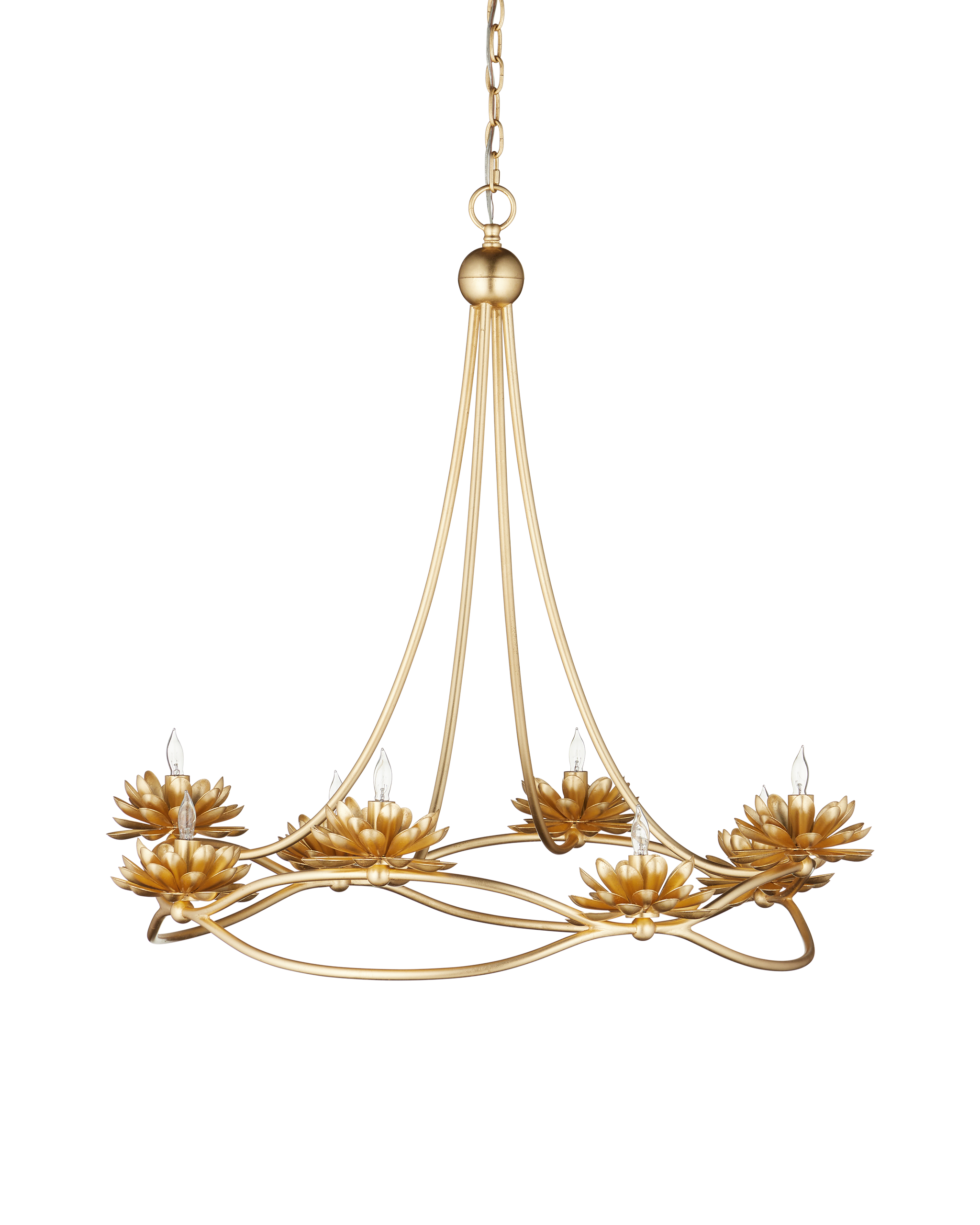 • The curving arms and an undulant ring bring the Cyrene Gold Chandelier a graceful shape. The fixture has eight lotus flowers that blossom around the bulbs to reflect off the bright gold leaf finish and highlight the sculptural details. Made of metal and spanning 32 inches in diameter, the dimmable chandelier creates a warm glow as the bulbs shimmer against the floral elements. Adjustable from 37.75" to 105.75" with use of included chain/rod kit/cable. If your space calls for a longer drop, additional chain/rods/cable is available for purchase.