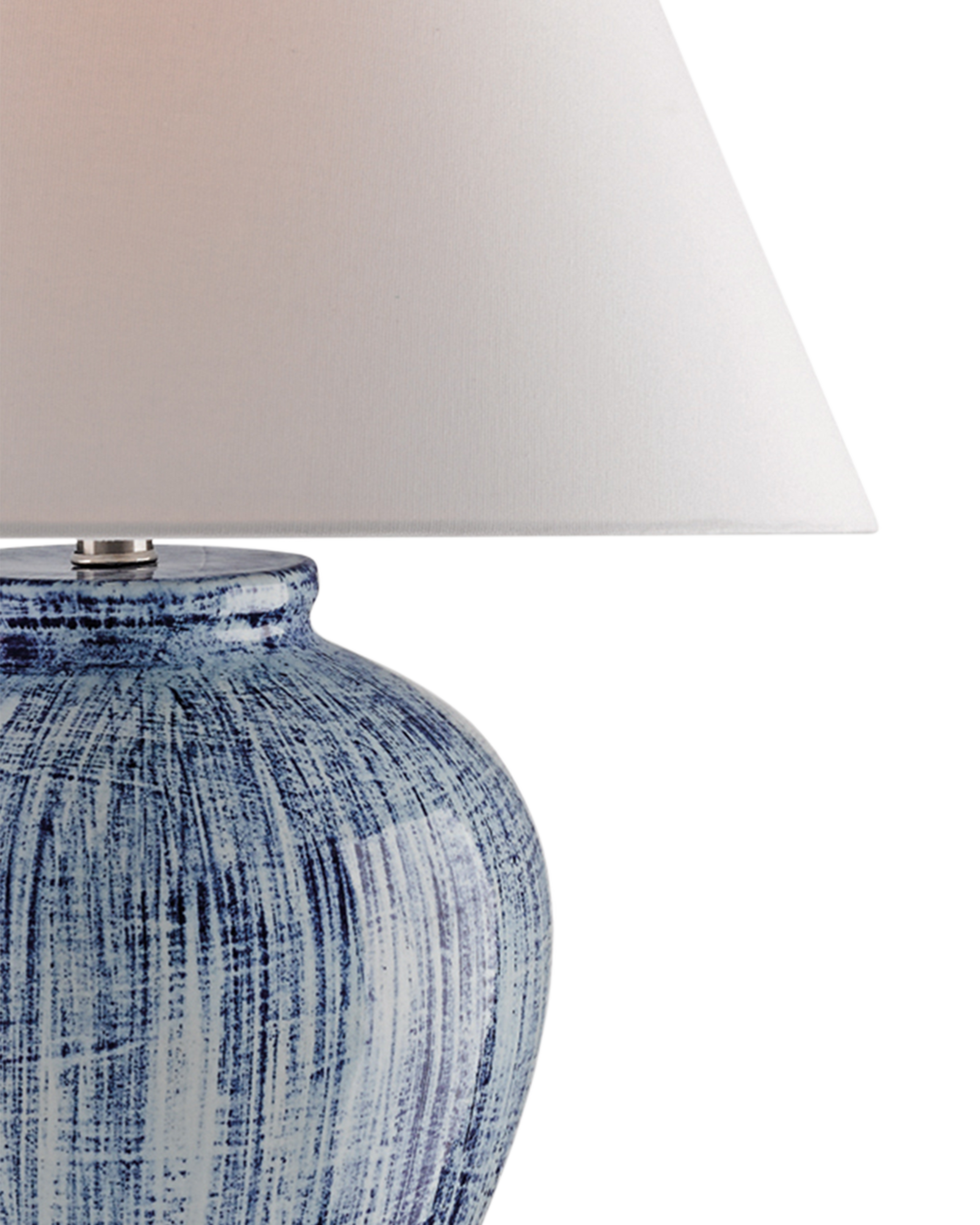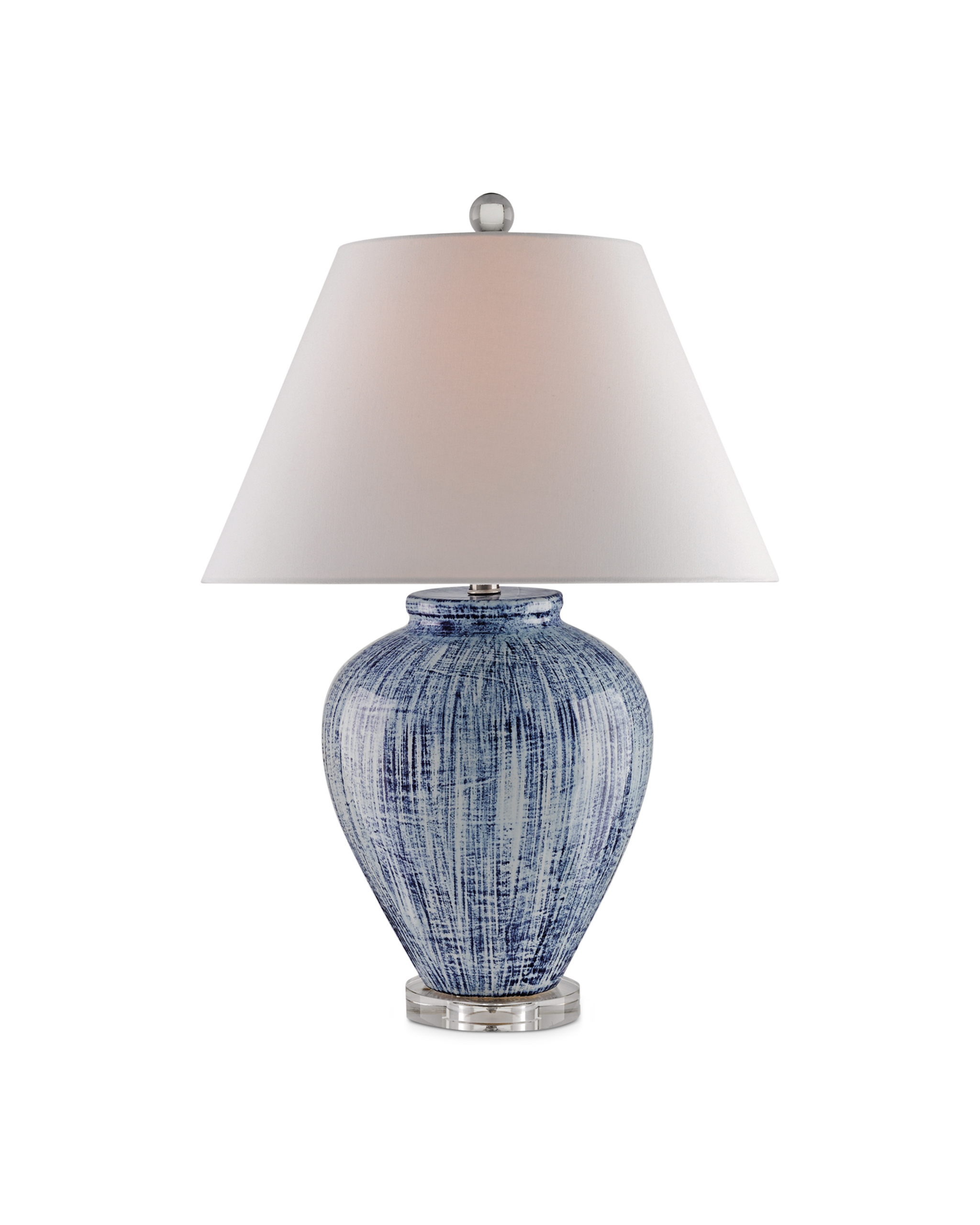 • Like time-honored Dutch pottery, the Malaprop Table Lamp has a hand-glazed blue and white finish on its ceramic body. But this design has a modern edge given the brushstroke pattern is texturally abstract. The blue lamp with its clear acrylic finial and base is fitted with a crisp white linen shade.