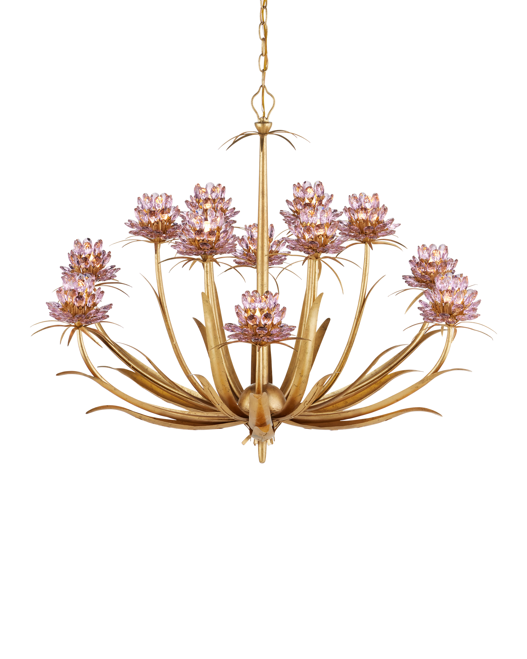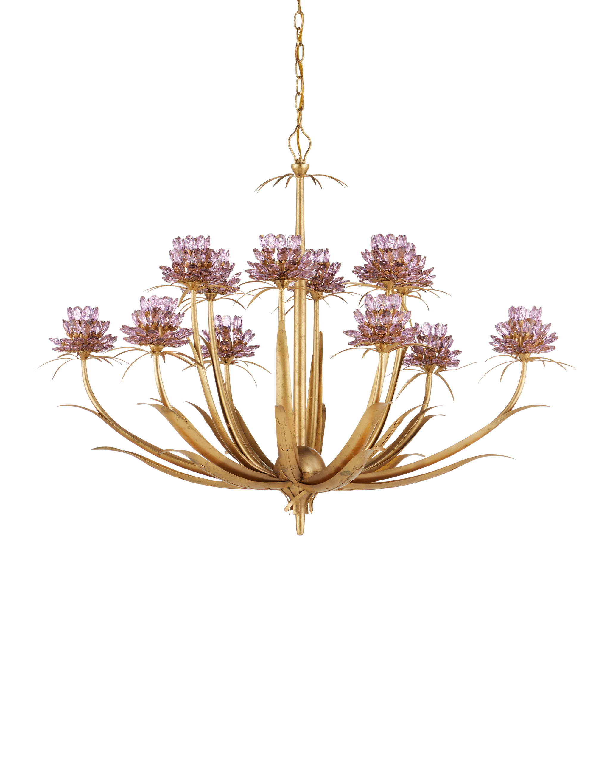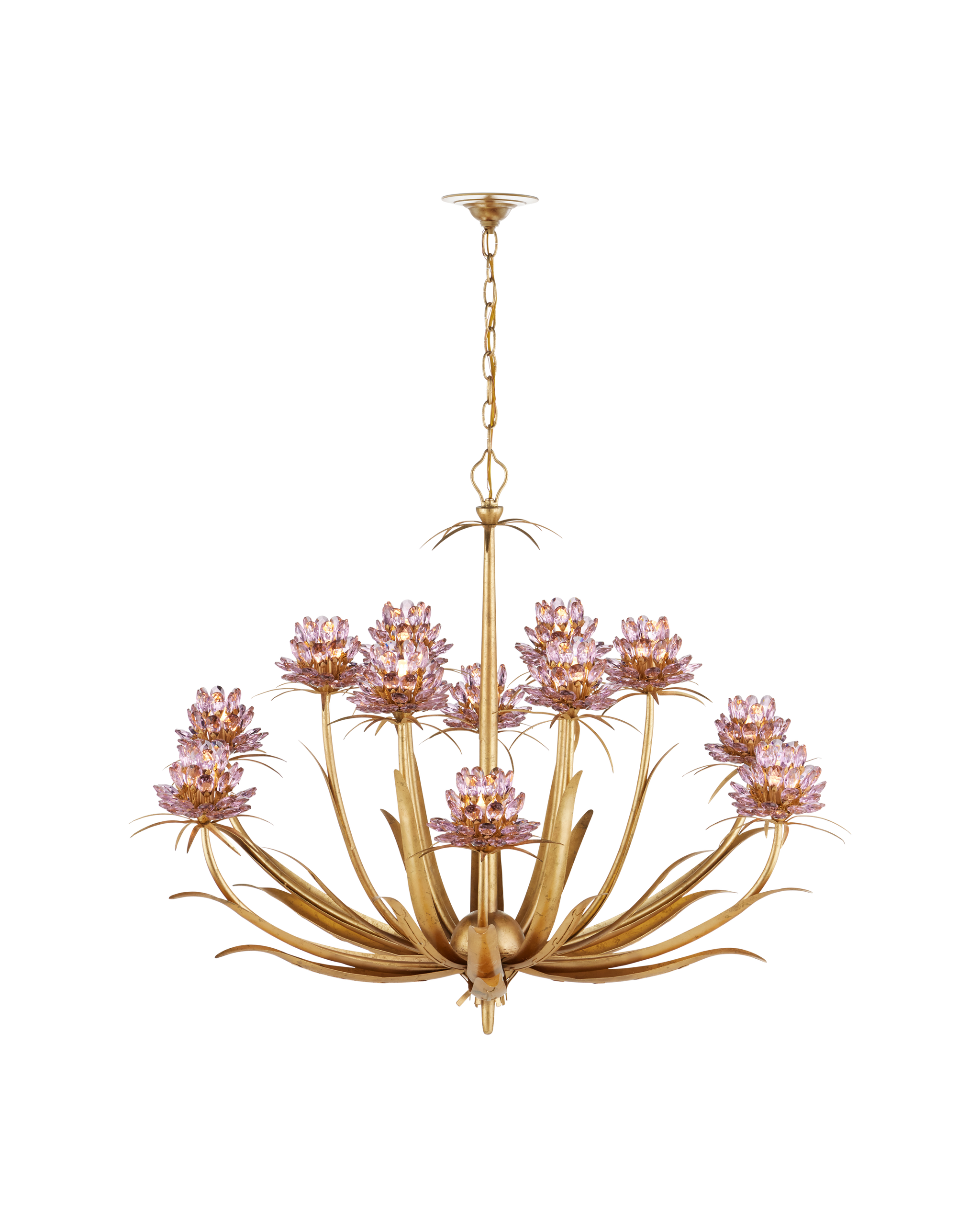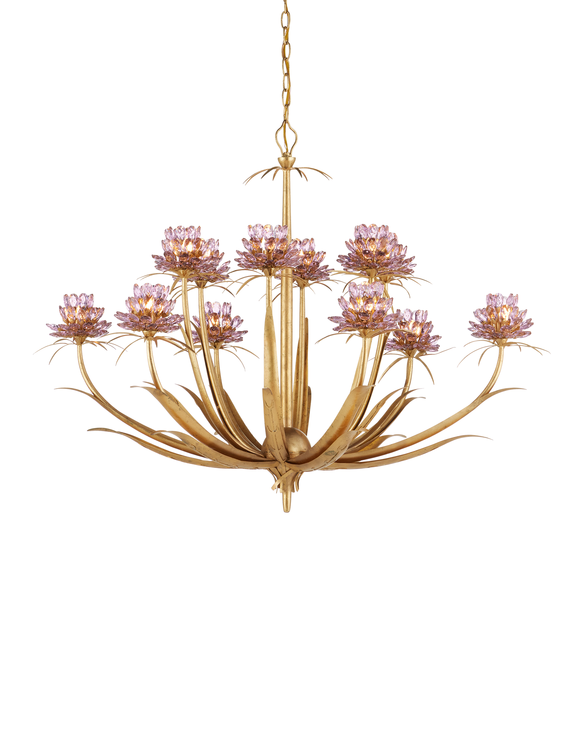• The Marilee Large Chandelier is a floral-inspired chandelier in a Dutch Gold Leaf finish with plant-like shapes flowing along each of the arms. The curved rods that make up the frame culminate in crystal blossoms that surround the bulbs, which makes them glow. The tiny palm-shaped details on the top and beneath the blossoms are artful details. The 12-light gold chandelier is dimmable. Adjustable from 39" to 107" with use of included chain/rod kit/cable. If your space calls for a longer drop, additional chain/rods/cable is available for purchase.