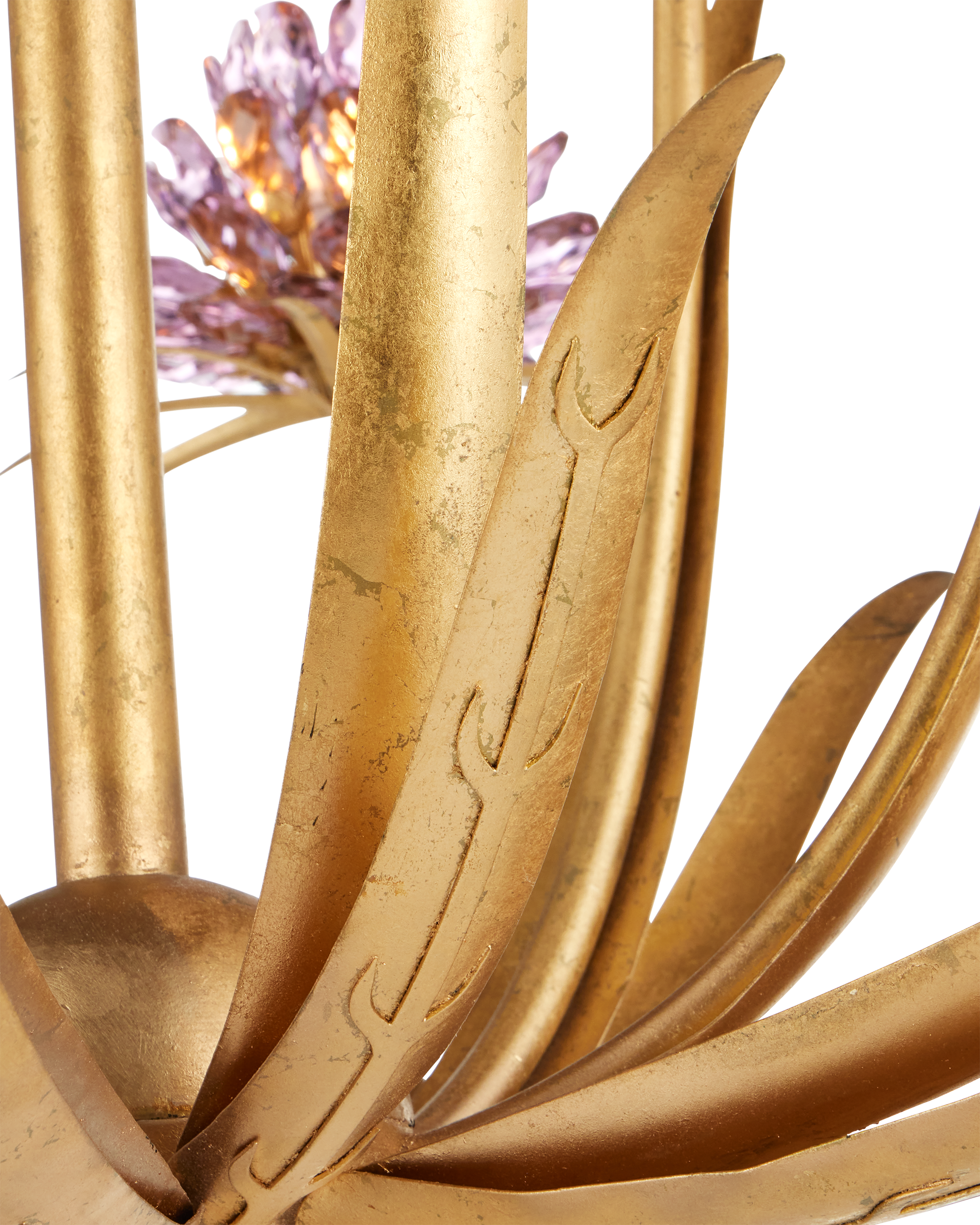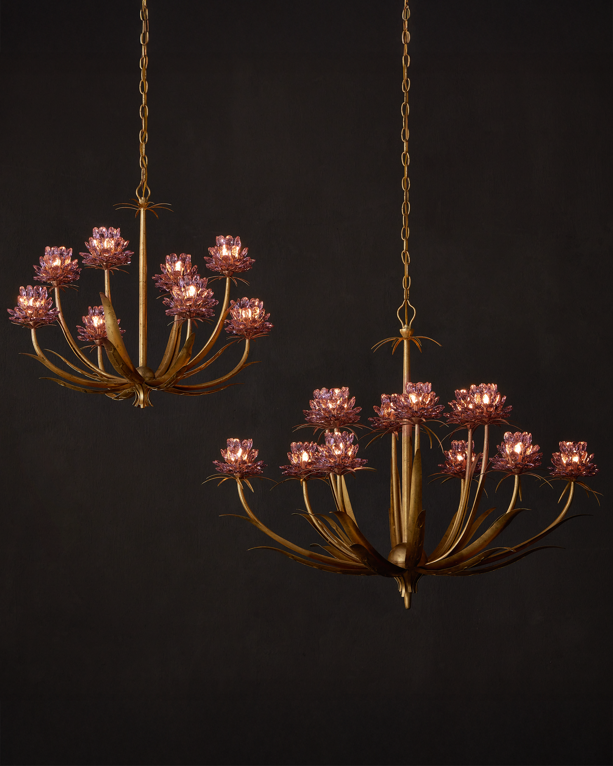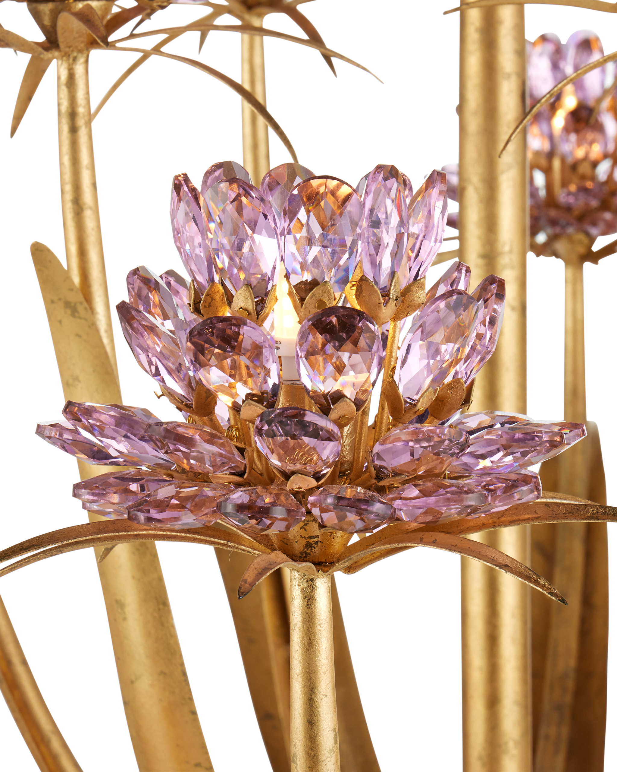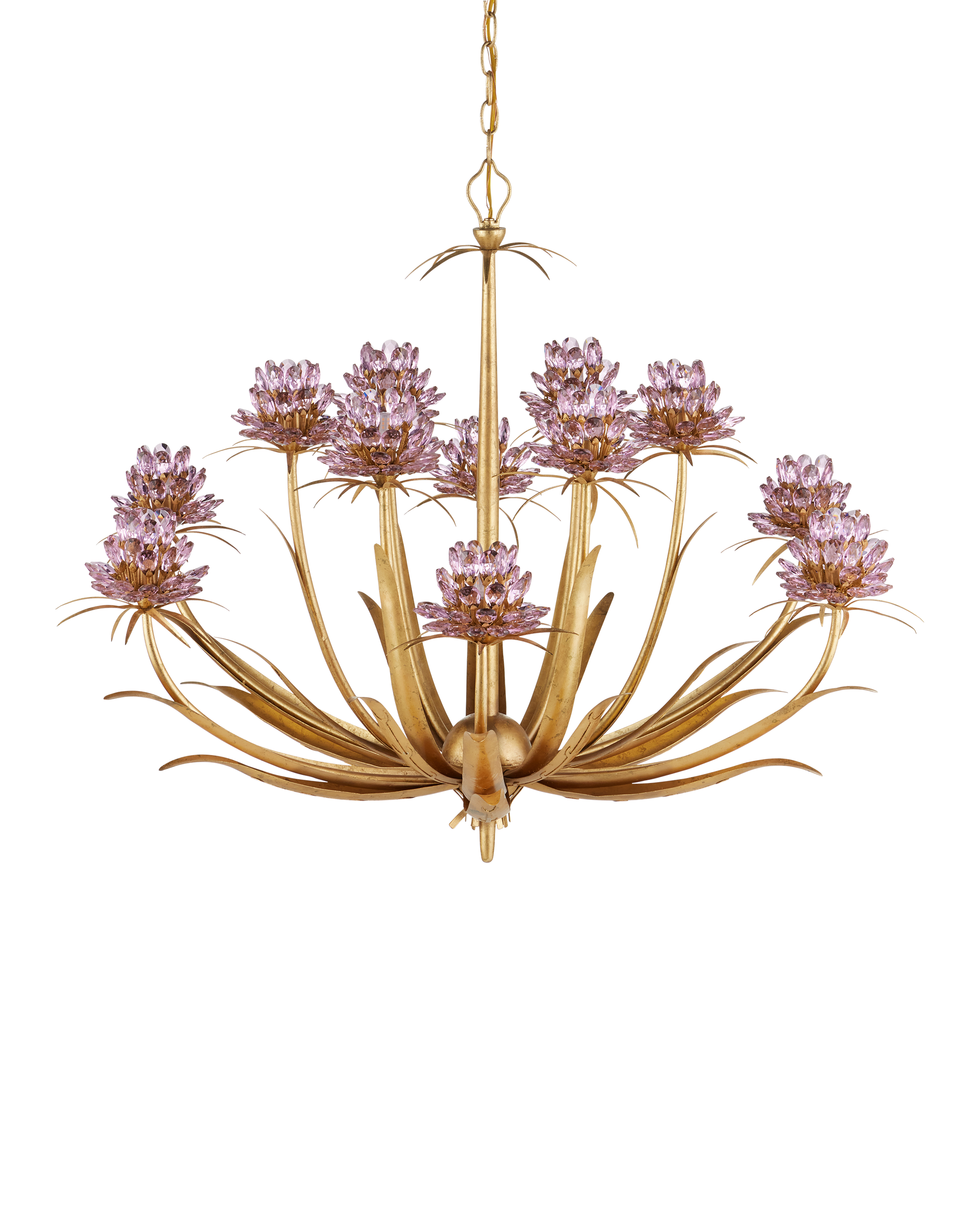 • The Marilee Large Chandelier is a floral-inspired chandelier in a Dutch Gold Leaf finish with plant-like shapes flowing along each of the arms. The curved rods that make up the frame culminate in crystal blossoms that surround the bulbs, which makes them glow. The tiny palm-shaped details on the top and beneath the blossoms are artful details. The 12-light gold chandelier is dimmable. Adjustable from 39" to 107" with use of included chain/rod kit/cable. If your space calls for a longer drop, additional chain/rods/cable is available for purchase.