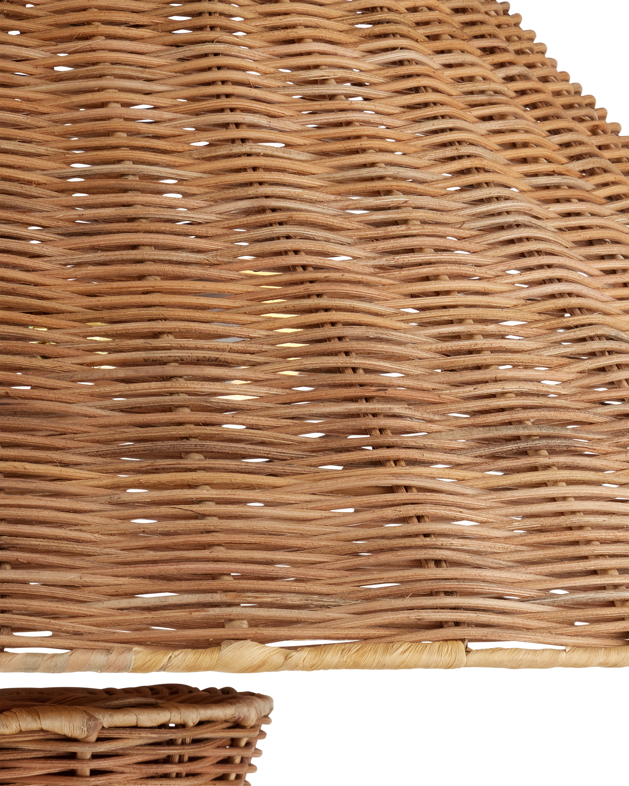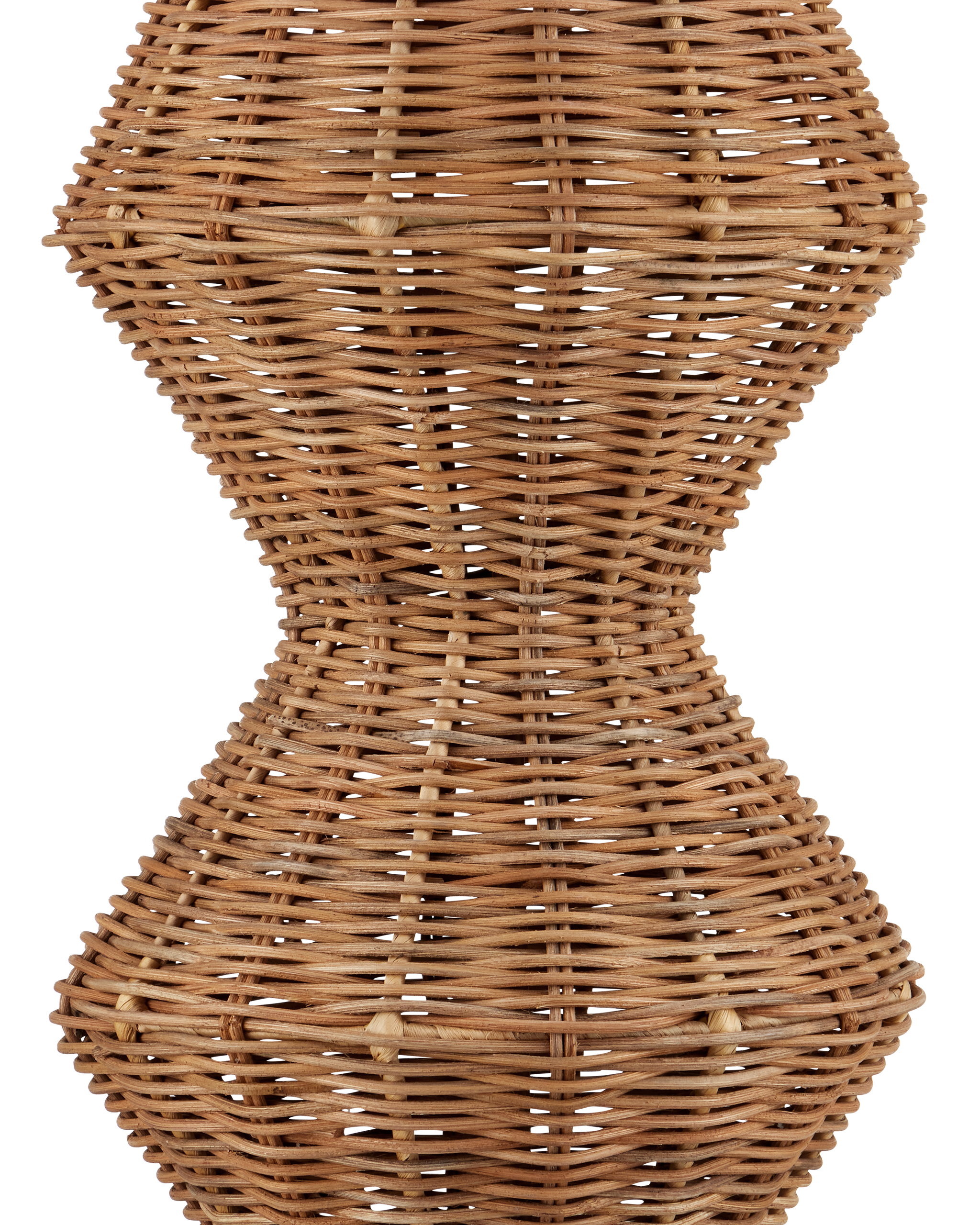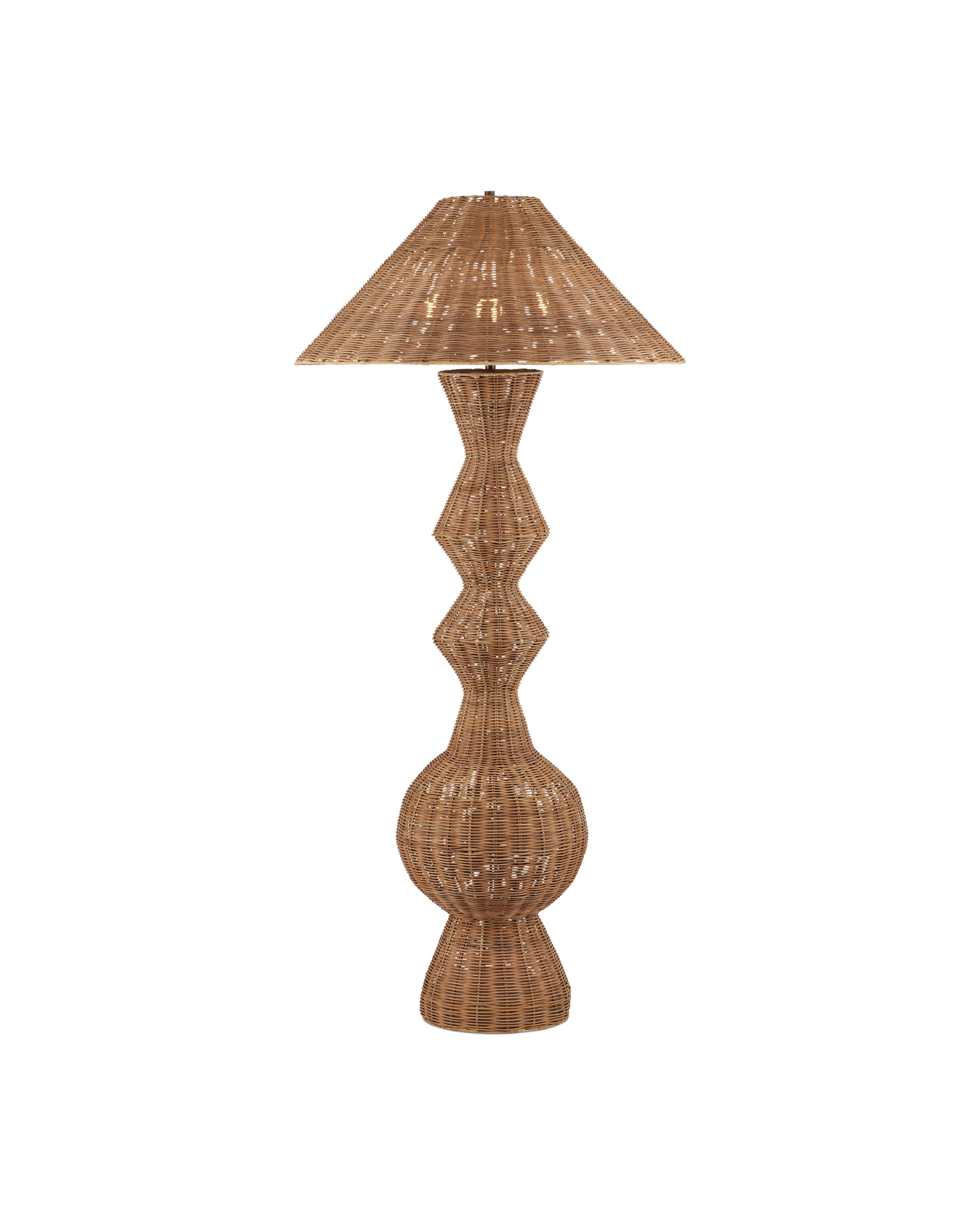 • The Nirvana Grande Floor Lamp has an overscale geometric body made of cane rattan from which the skin was stripped to give the natural material a matte texture. The flared empire shade is made of thicker rattan to provide the floor lamp with an Asian-inspired flair. Three bulbs emit an abundance of warm illumination, and the Nirvana turns on and off with an inline foot switch.