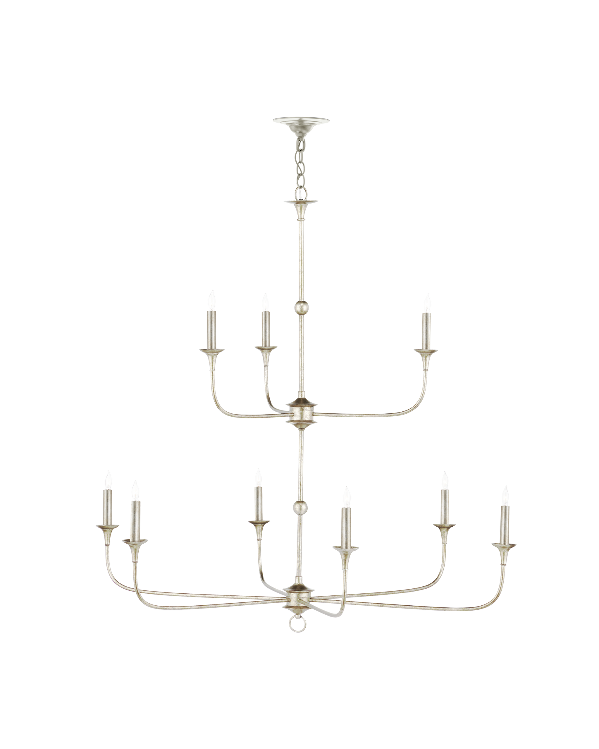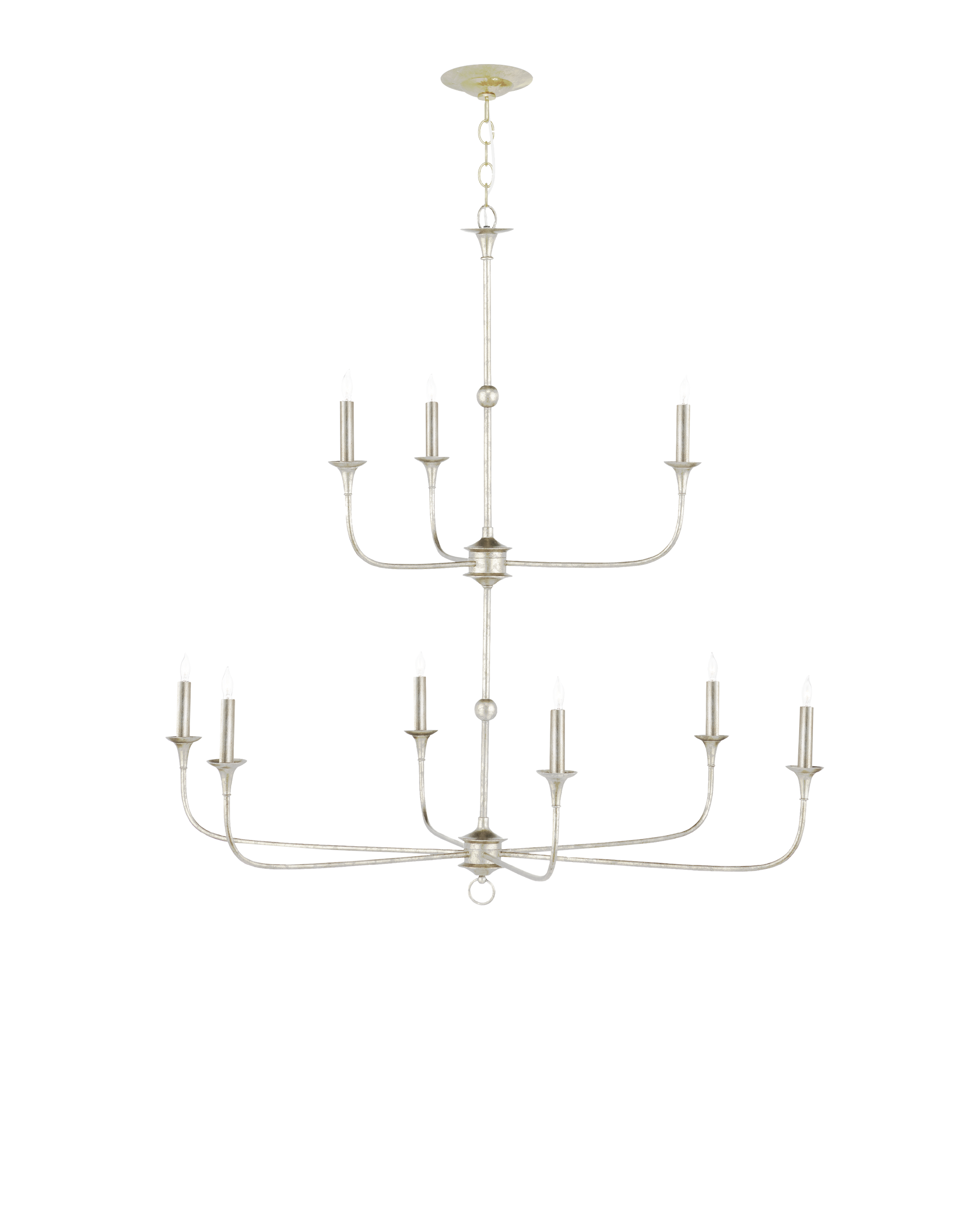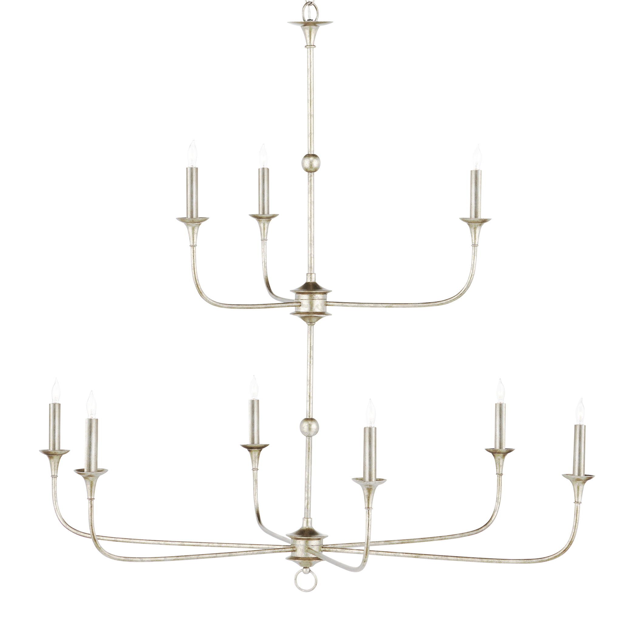 • The arms of the Nottaway Two-Tier Champagne Chandelier stretch gracefully from petite cogs that rest at the bottoms of its stems, the bottom one ornamented with a dainty ring. Though the silver chandelier has minimalist lines, there is a sweeping fluidity to its profile that makes it a natural choice for large tall foyers or any room with high ceilings. The finish on the wrought iron frame brings textural interest to this dimmable nine-light fixture. Adjustable from 51" to 119" with use of included chain/rod kit/cable. If your space calls for a longer drop, additional chain/rods/cable is available for purchase.