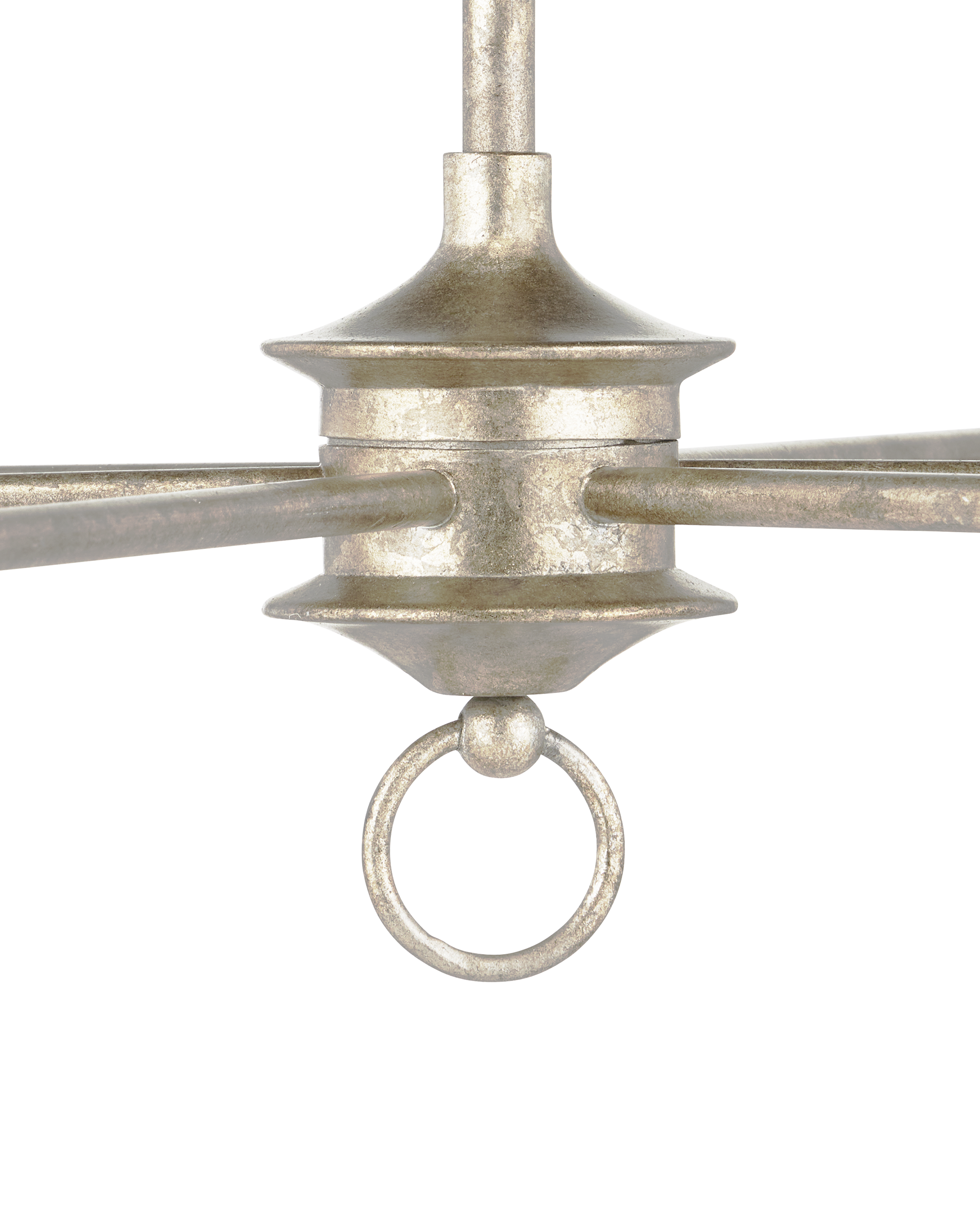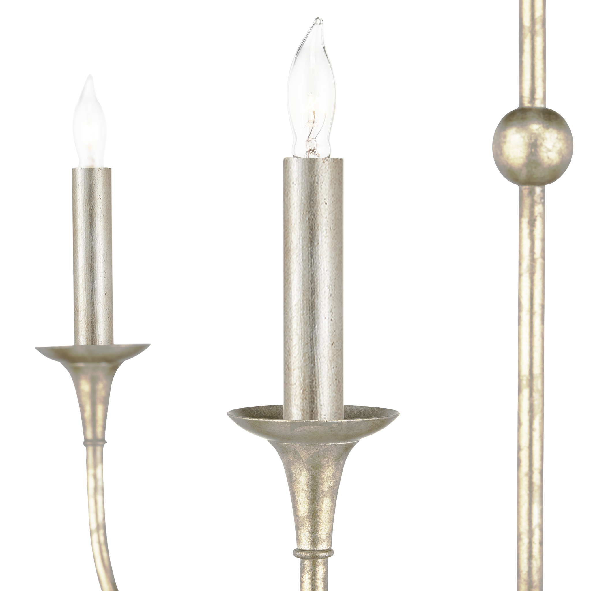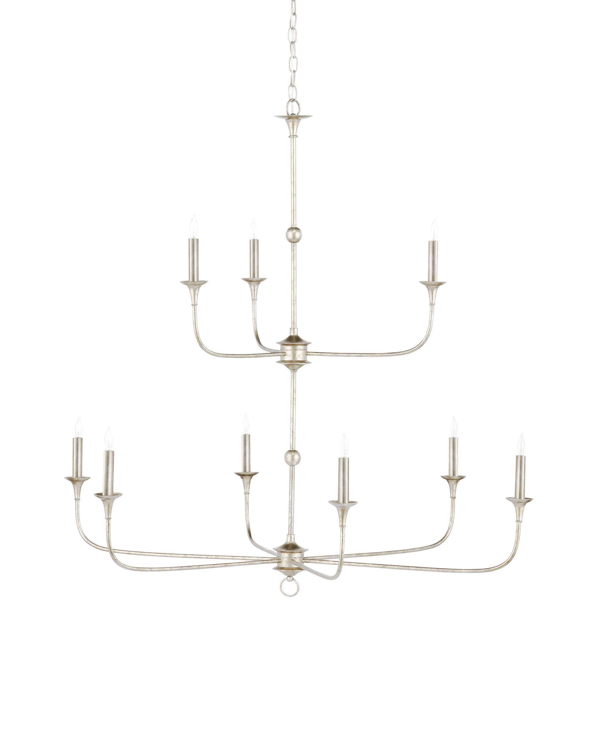 • The arms of the Nottaway Two-Tier Champagne Chandelier stretch gracefully from petite cogs that rest at the bottoms of its stems, the bottom one ornamented with a dainty ring. Though the silver chandelier has minimalist lines, there is a sweeping fluidity to its profile that makes it a natural choice for large tall foyers or any room with high ceilings. The finish on the wrought iron frame brings textural interest to this dimmable nine-light fixture. Adjustable from 51" to 119" with use of included chain/rod kit/cable. If your space calls for a longer drop, additional chain/rods/cable is available for purchase.