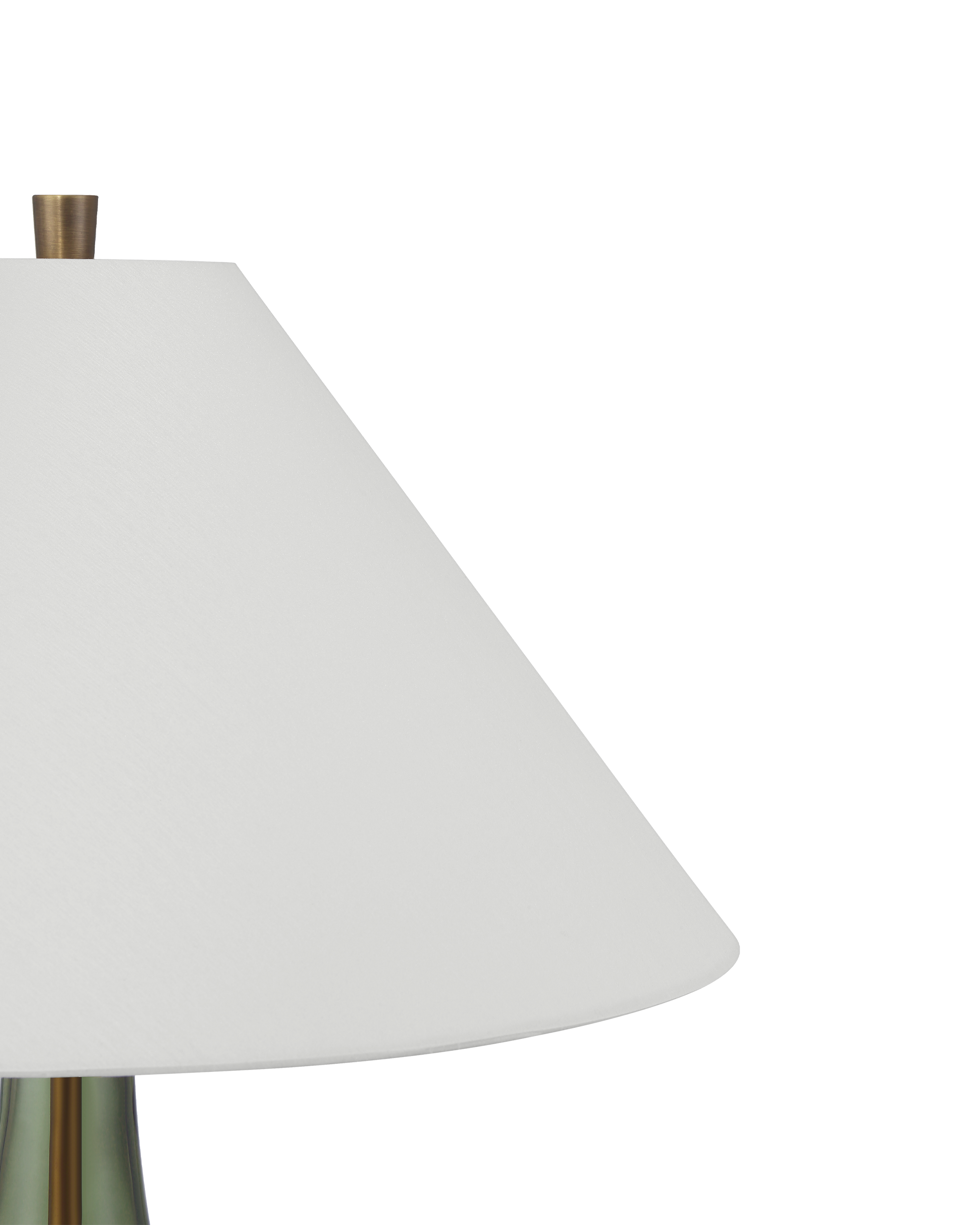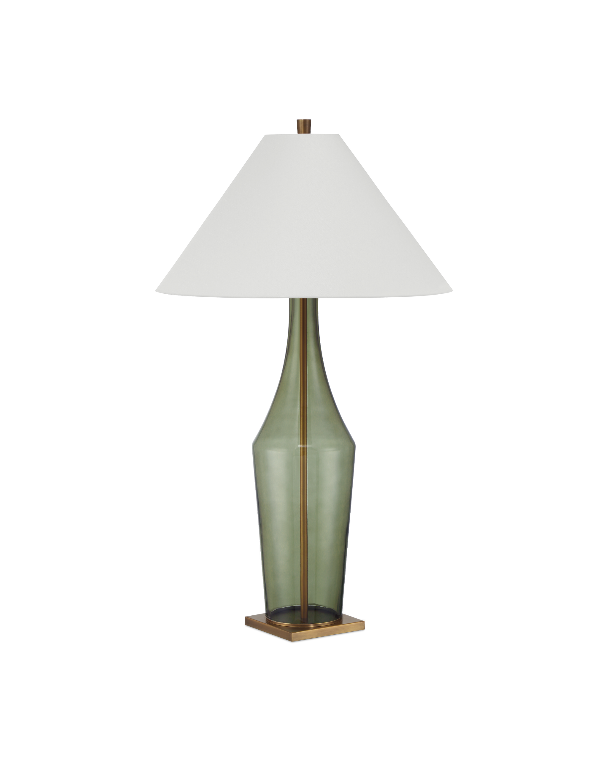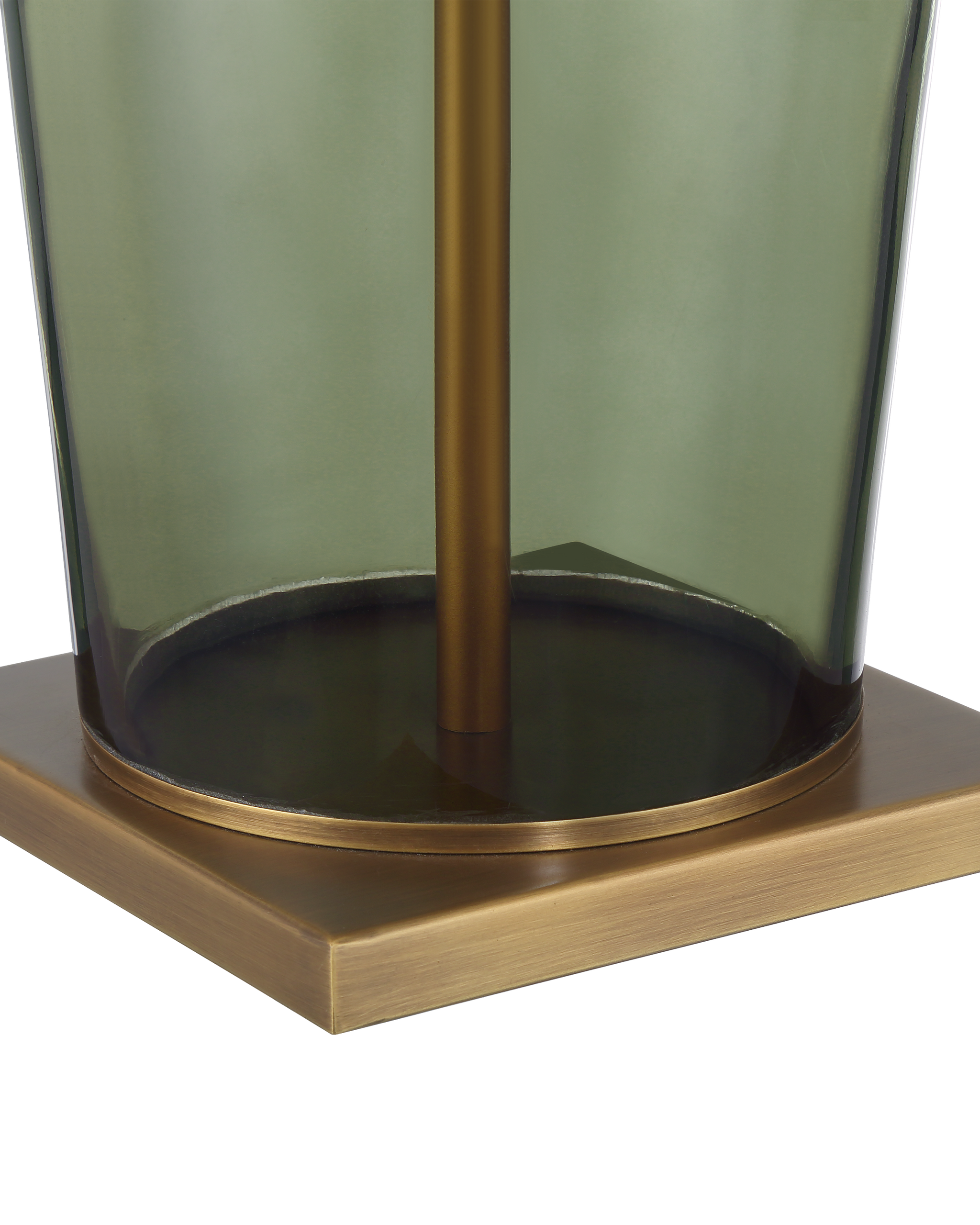 • The color of the Olive Green Table Lamp brings warmth to the bottle-shaped body given it is made of transparent glass. The metal rod that runs through it to connect the hardware to the base is in an antique brass finish, as is the understated square base with a coordinating lip that cradles the glass form. This is a tall lamp at 33.5 inches from the base to the antique brass finial that fastens a pale empire shade to it.