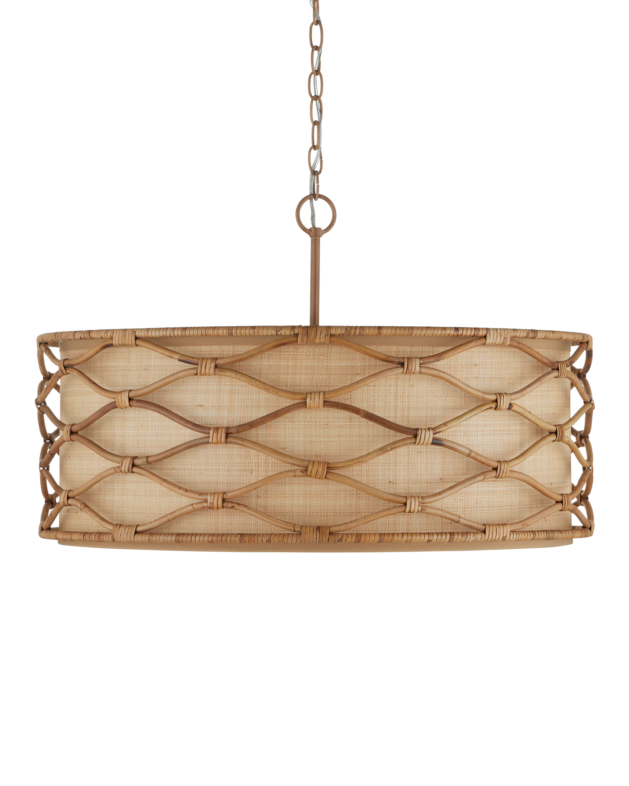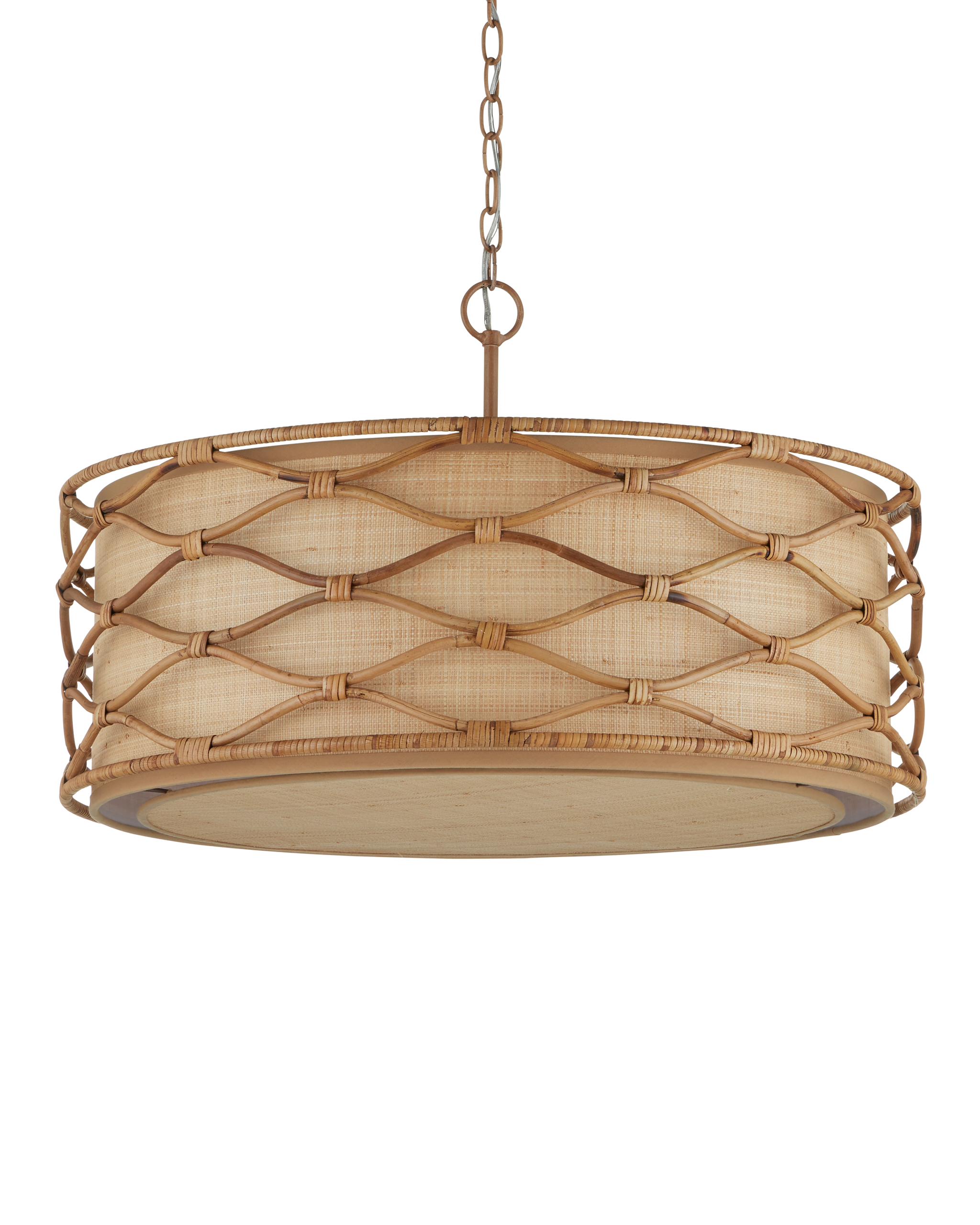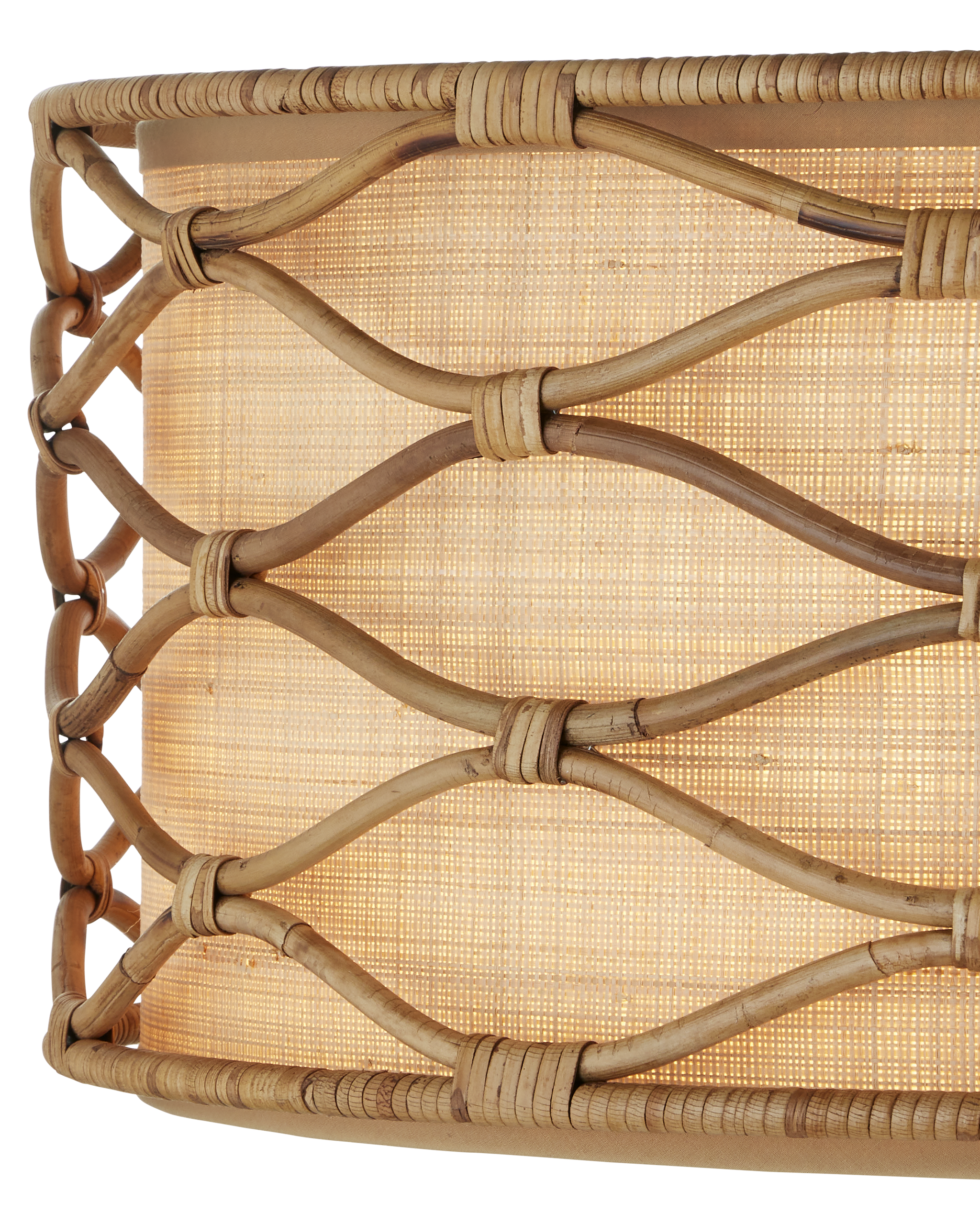 • The Partita Pendant is a natural material story through and through. The illumination is softened from the sides and the bottom by grasscloth that shows off its subtle texture when the light filters through it. Surrounding the shade is a rattan pattern that flows elegantly without seeming to begin or end. The process to create this ornamentation is painstaking, as the rattan is steamed and bent by hand, then bound together with thin bands of the same material. To be consistent with the overall color of the other elements, the wrought iron frame and hardware on the pendant are finished in a saddle tan. Adjustable from 24.5" to 92.5" with use of included chain/rod kit/cable. If your space calls for a longer drop, additional chain/rods/cable is available for purchase.