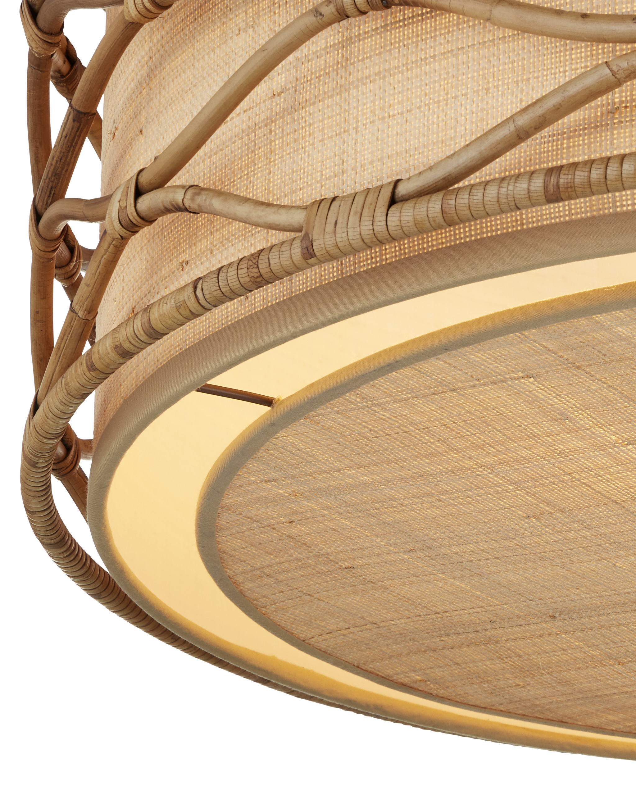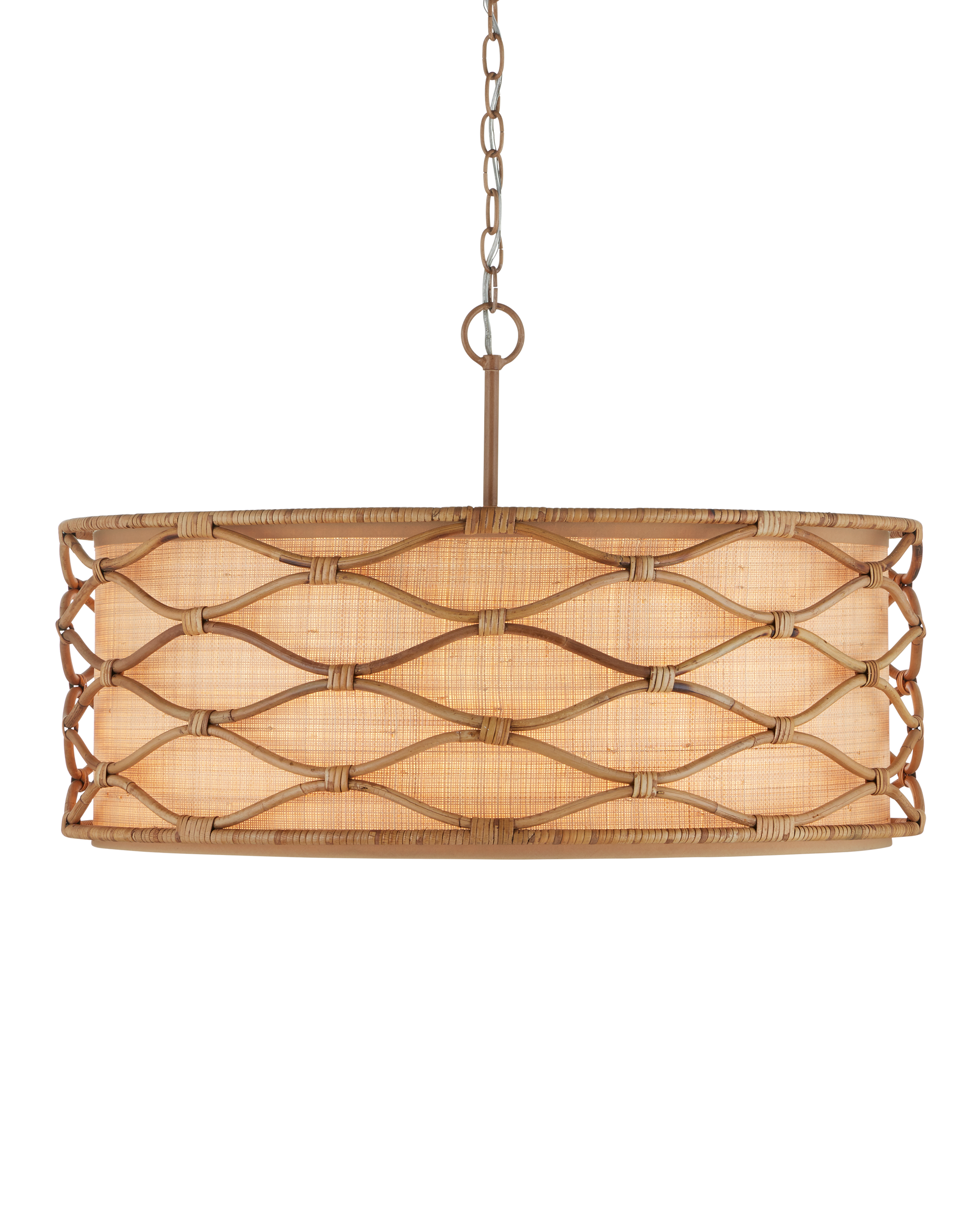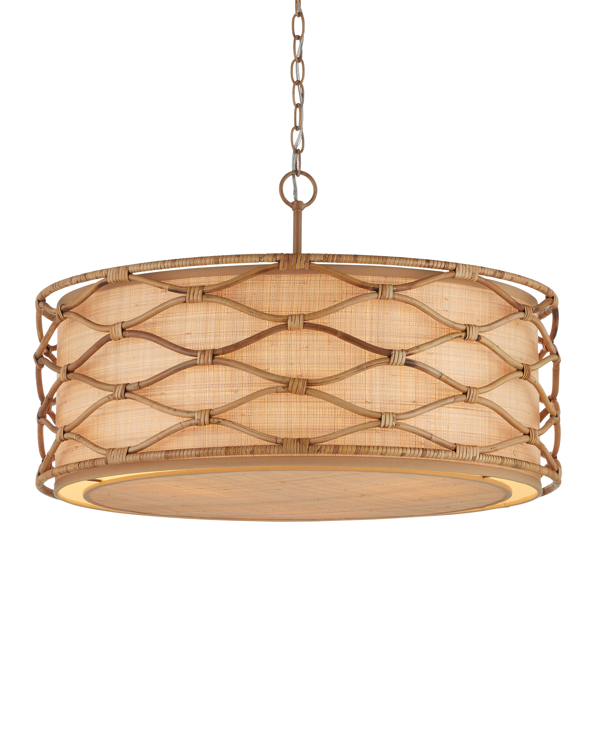 • The Partita Pendant is a natural material story through and through. The illumination is softened from the sides and the bottom by grasscloth that shows off its subtle texture when the light filters through it. Surrounding the shade is a rattan pattern that flows elegantly without seeming to begin or end. The process to create this ornamentation is painstaking, as the rattan is steamed and bent by hand, then bound together with thin bands of the same material. To be consistent with the overall color of the other elements, the wrought iron frame and hardware on the pendant are finished in a saddle tan. Adjustable from 24.5" to 92.5" with use of included chain/rod kit/cable. If your space calls for a longer drop, additional chain/rods/cable is available for purchase.