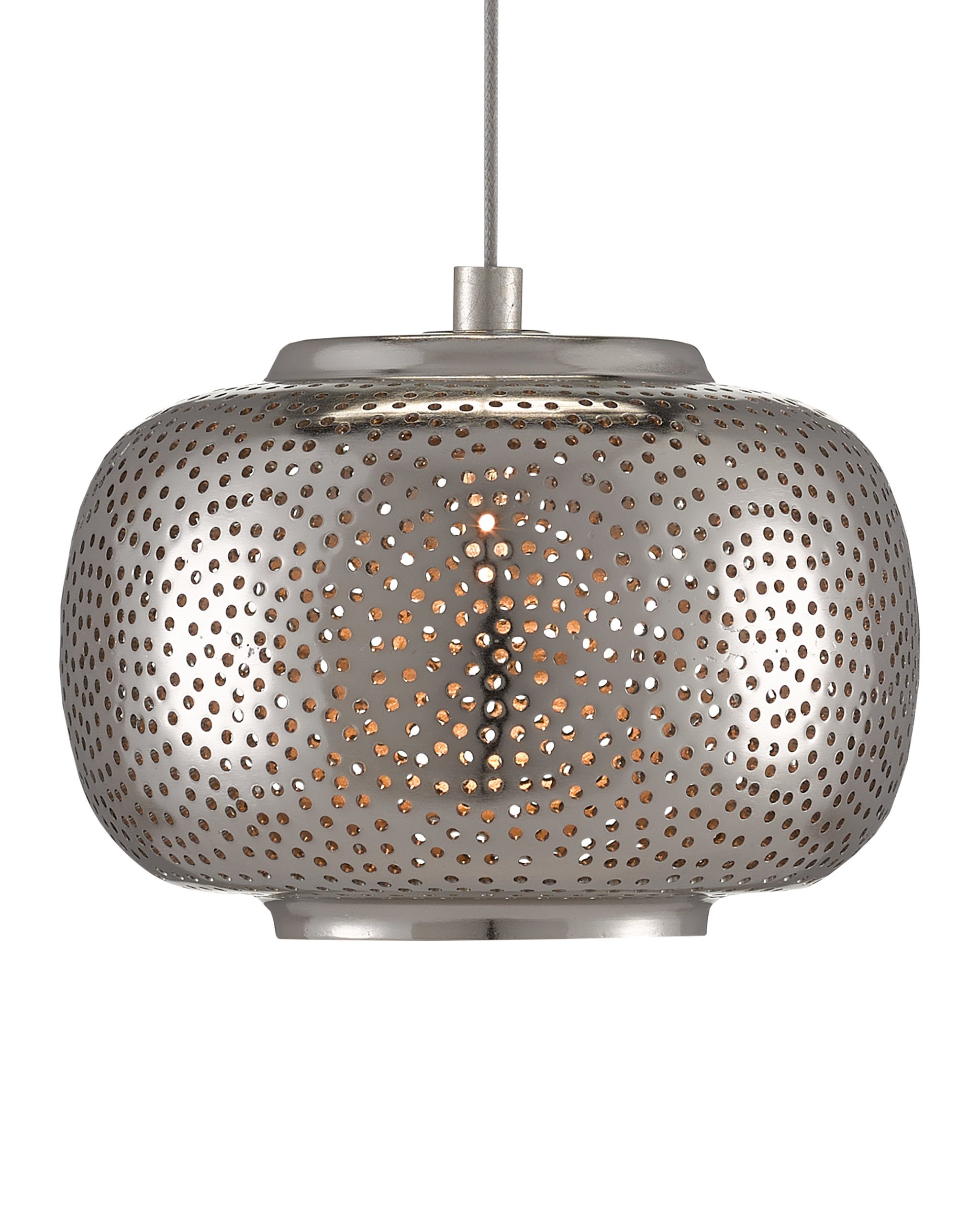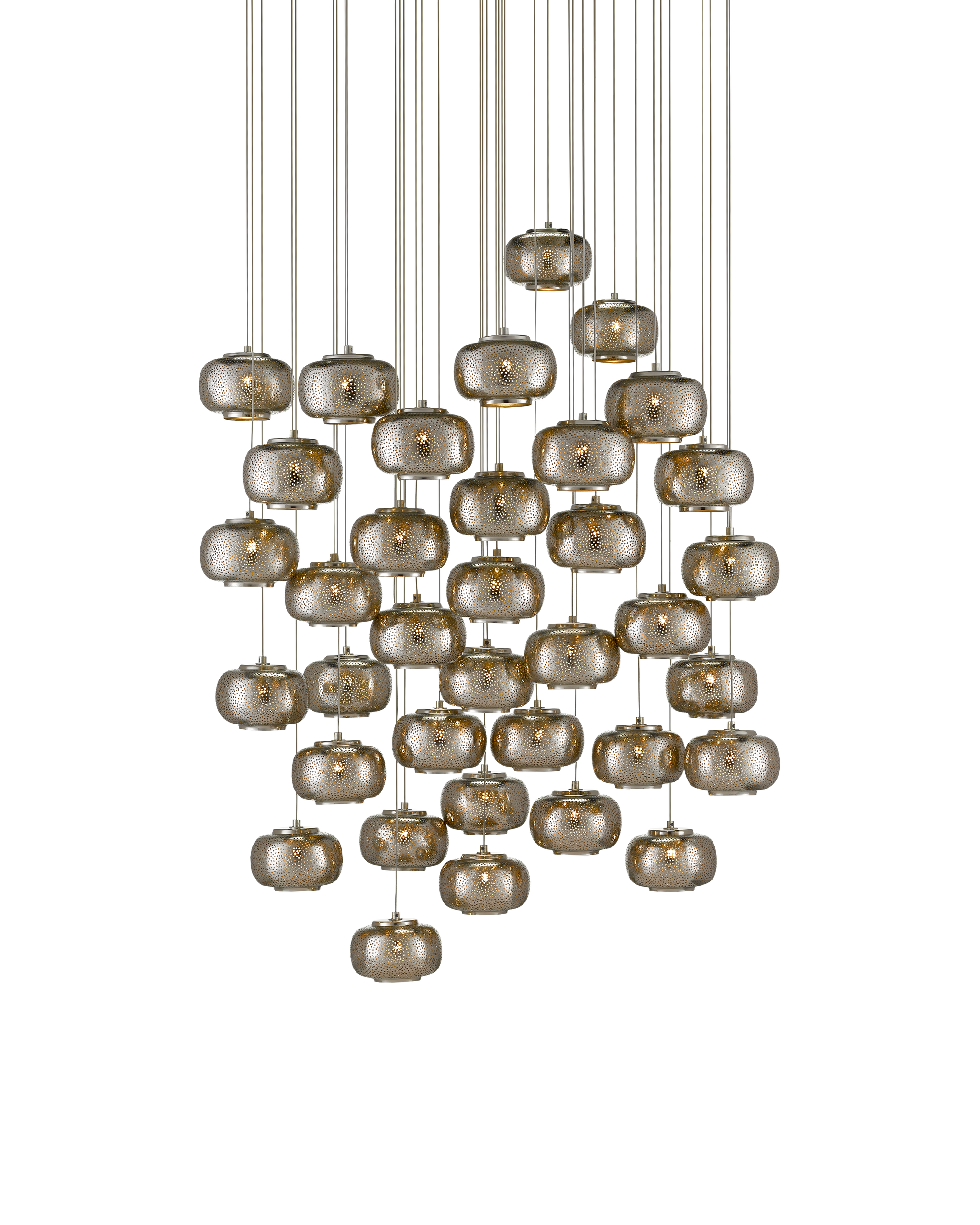 • Our Pepper 36-Light Multi-Drop Pendant has pierced metal shades in a mix of painted silver and nickel finishes. The textural metal orbs are on point for modern farmhouse and industrial chic interiors. The canopy of this piece is luminous in a painted silver finish. This fixture is among Currey & Company's multi-drop pendant collection, which includes multiple configurations.