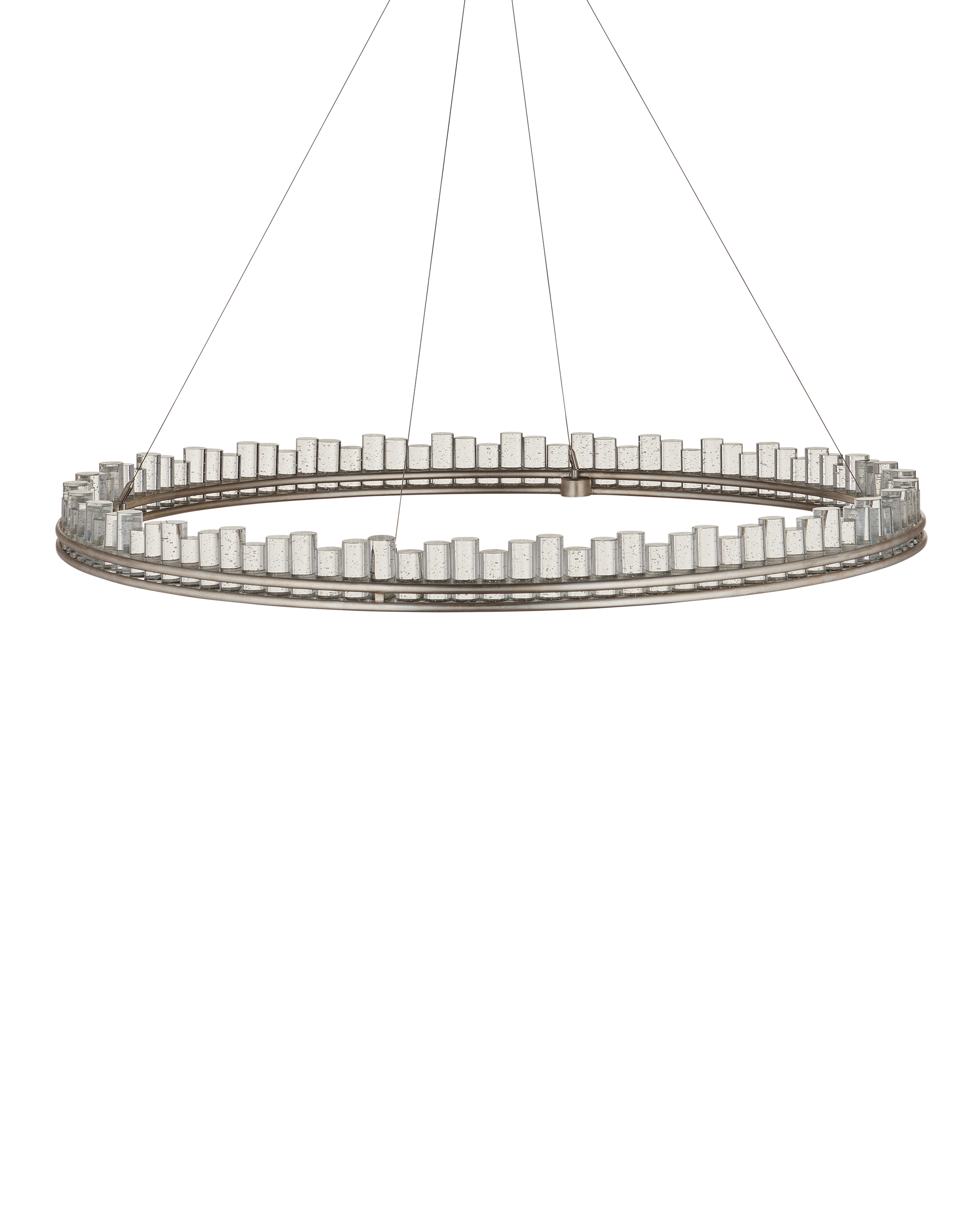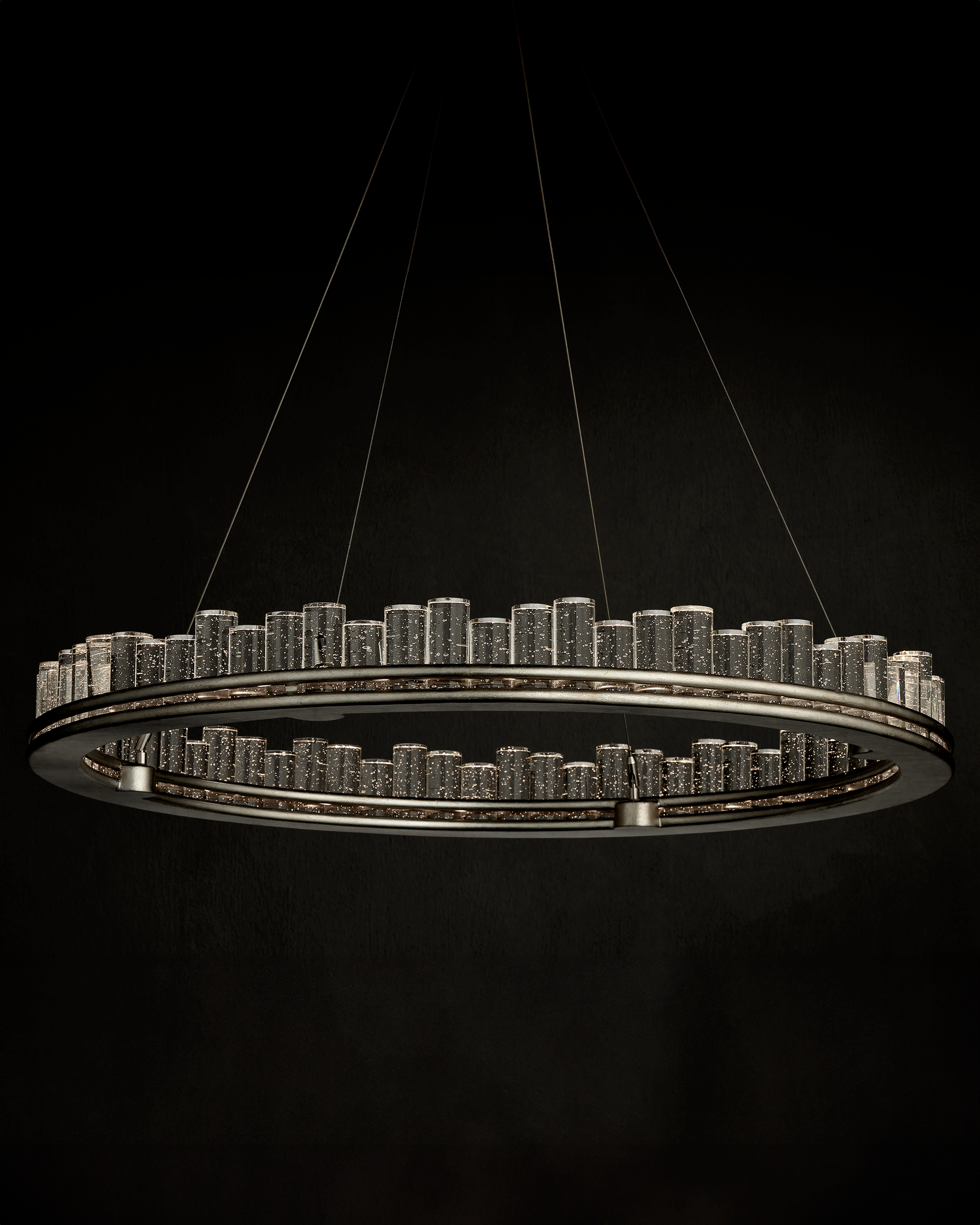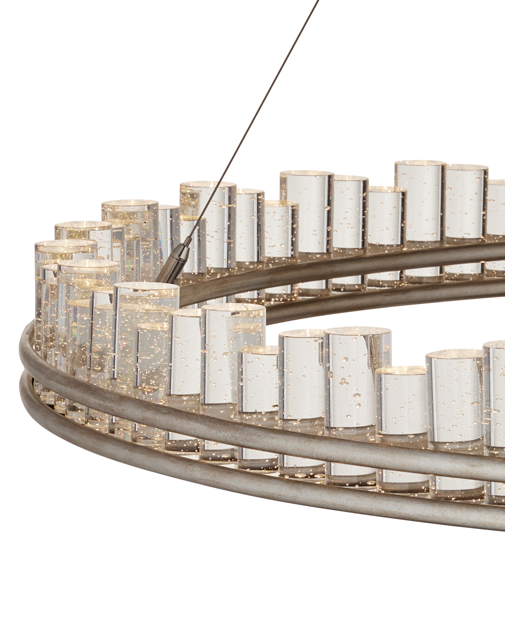 • When envisioning the Pleiades Large Chandelier, the goal was to create drama with cylindrical pieces of seeded crystal fitted into a generously scaled silver leaf wrought iron ring. The open design of the ring is essential to enhance the sensational illumination, as it is fitted with an integrated LED strip. The light effervesces when it strikes the bubbles in the crystal rods, adding to the chandelier's allure. The Pleiades is dimmable. Adjustable from 32" to 148" with use of included chain/rod kit/cable. If your space calls for a longer drop, additional chain/rods/cable is available for purchase.