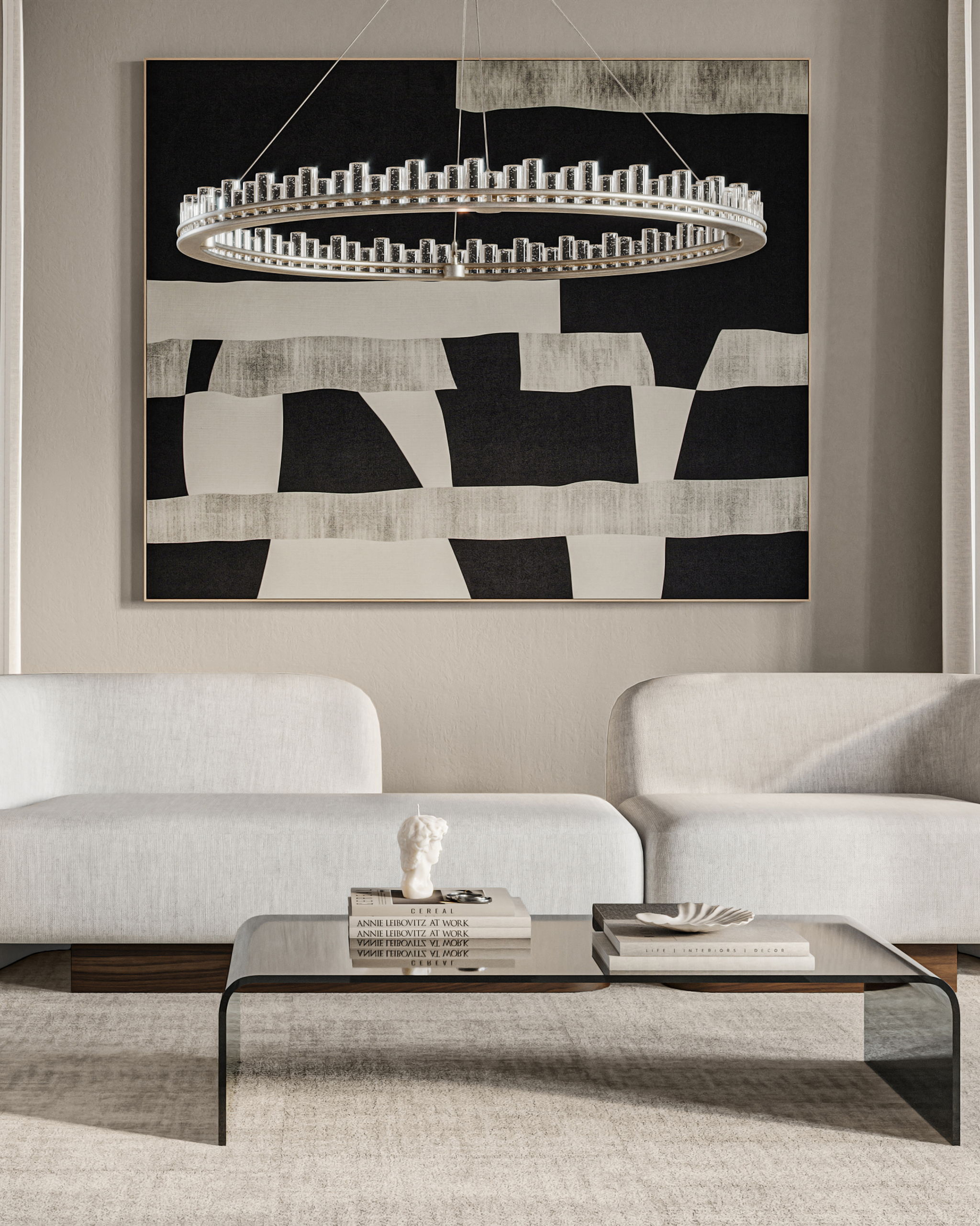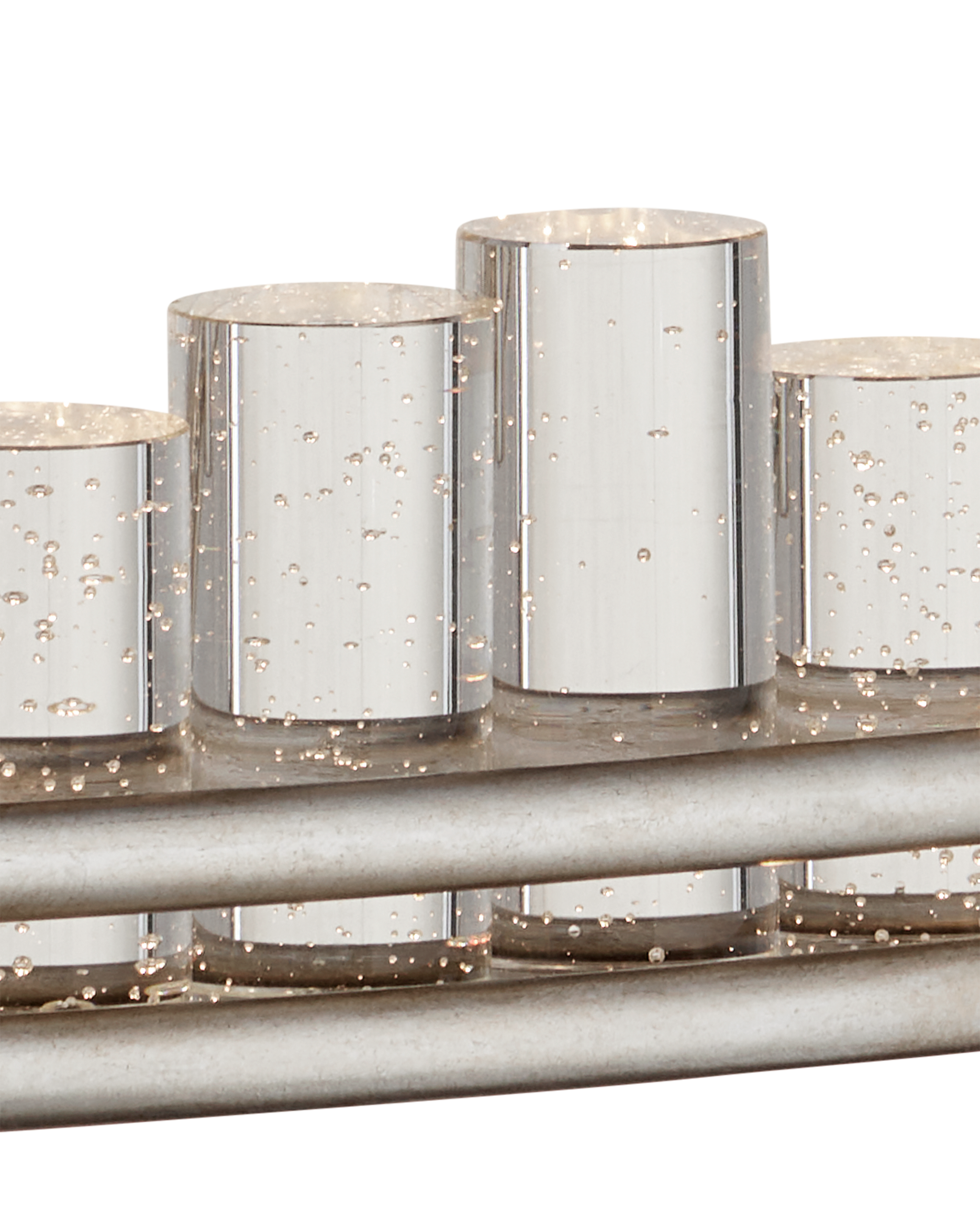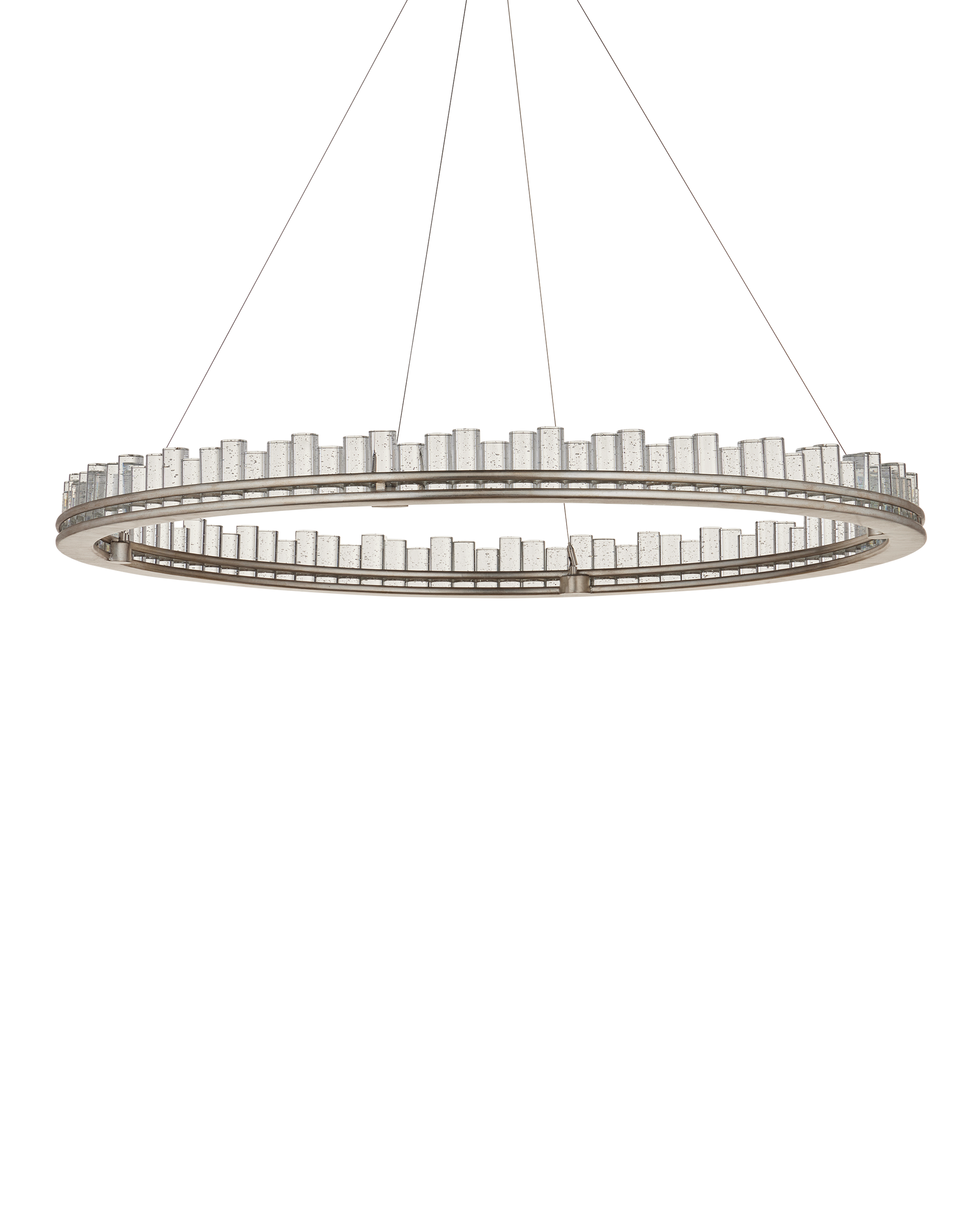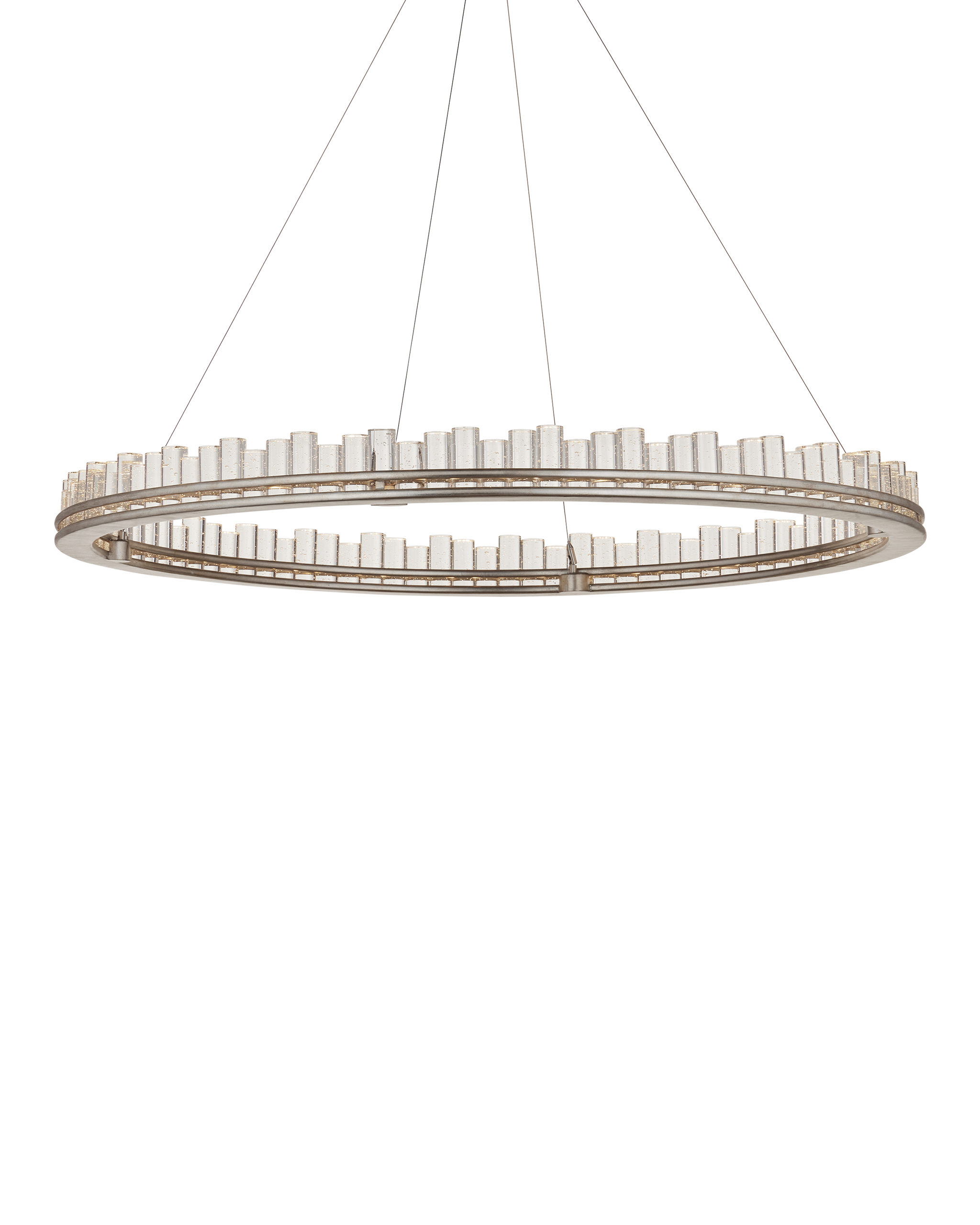 • When envisioning the Pleiades Large Chandelier, the goal was to create drama with cylindrical pieces of seeded crystal fitted into a generously scaled silver leaf wrought iron ring. The open design of the ring is essential to enhance the sensational illumination, as it is fitted with an integrated LED strip. The light effervesces when it strikes the bubbles in the crystal rods, adding to the chandelier's allure. The Pleiades is dimmable. Adjustable from 32" to 148" with use of included chain/rod kit/cable. If your space calls for a longer drop, additional chain/rods/cable is available for purchase.