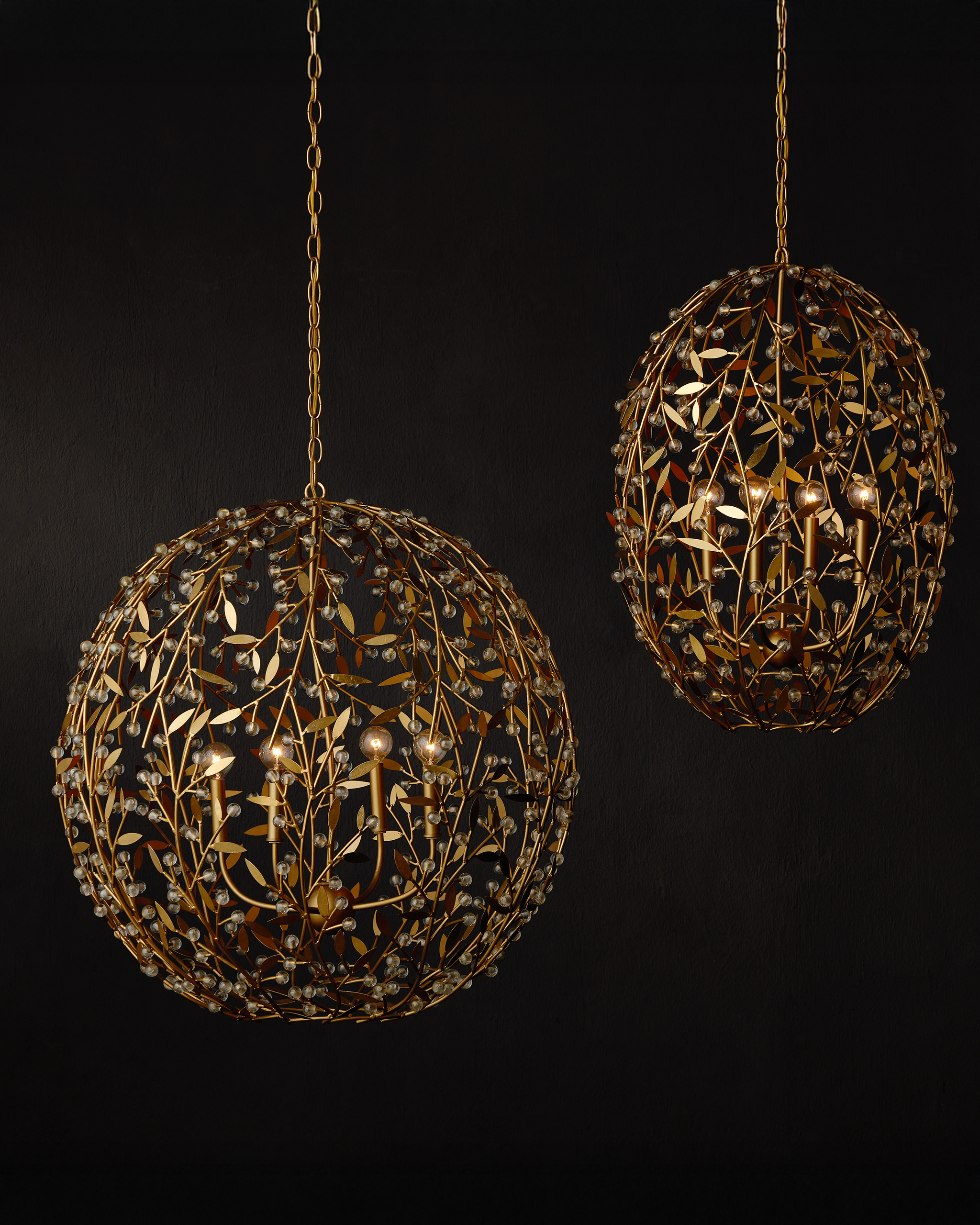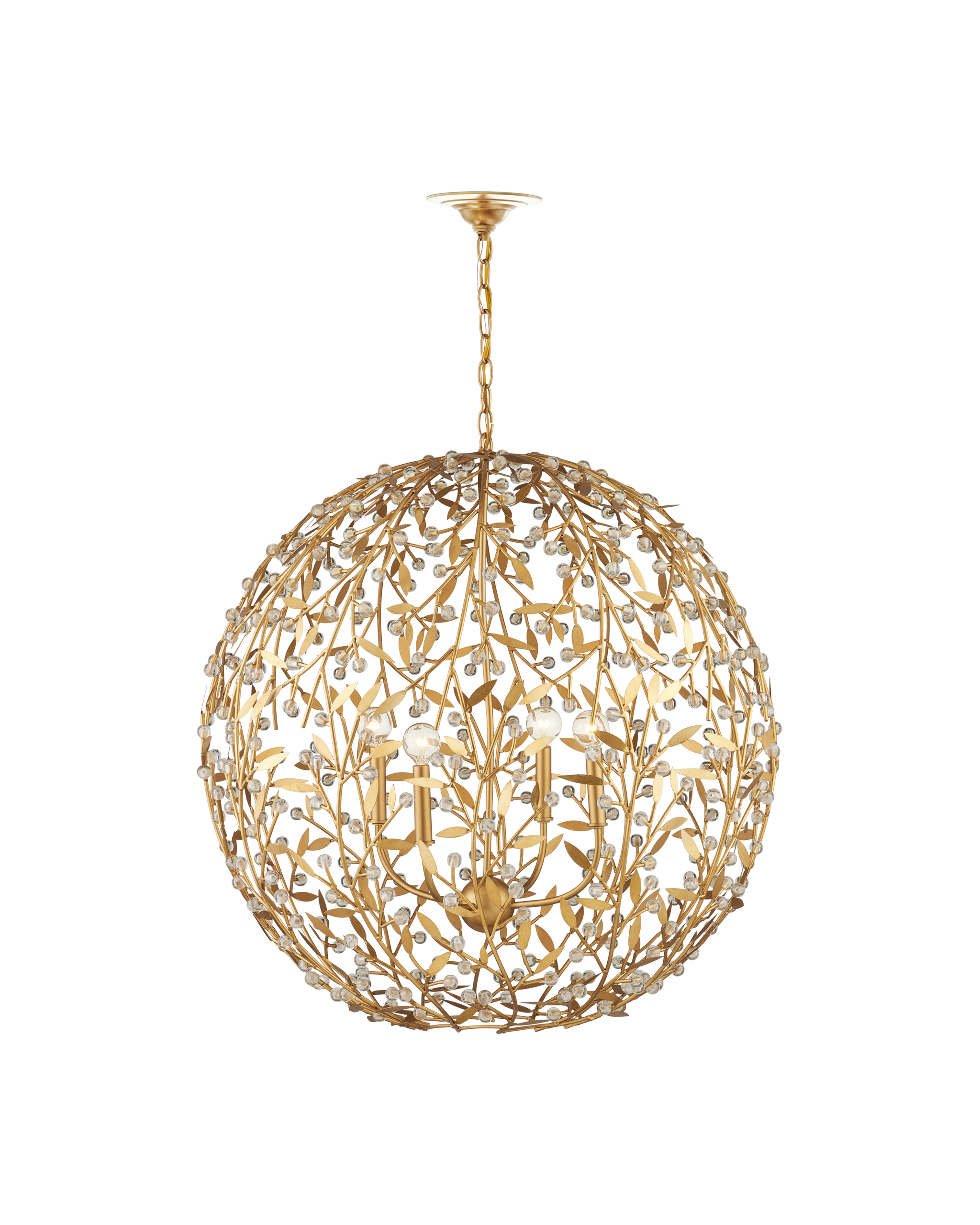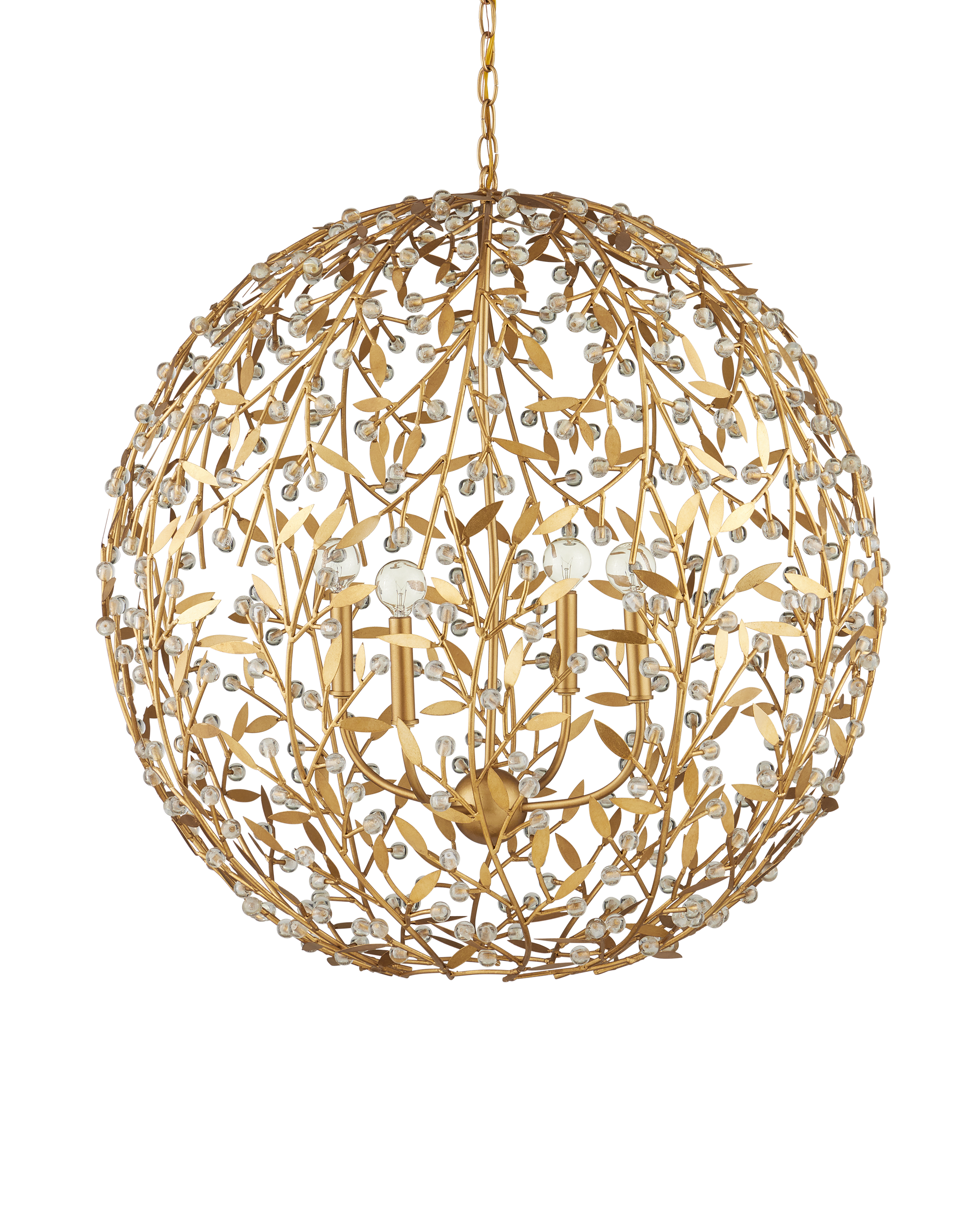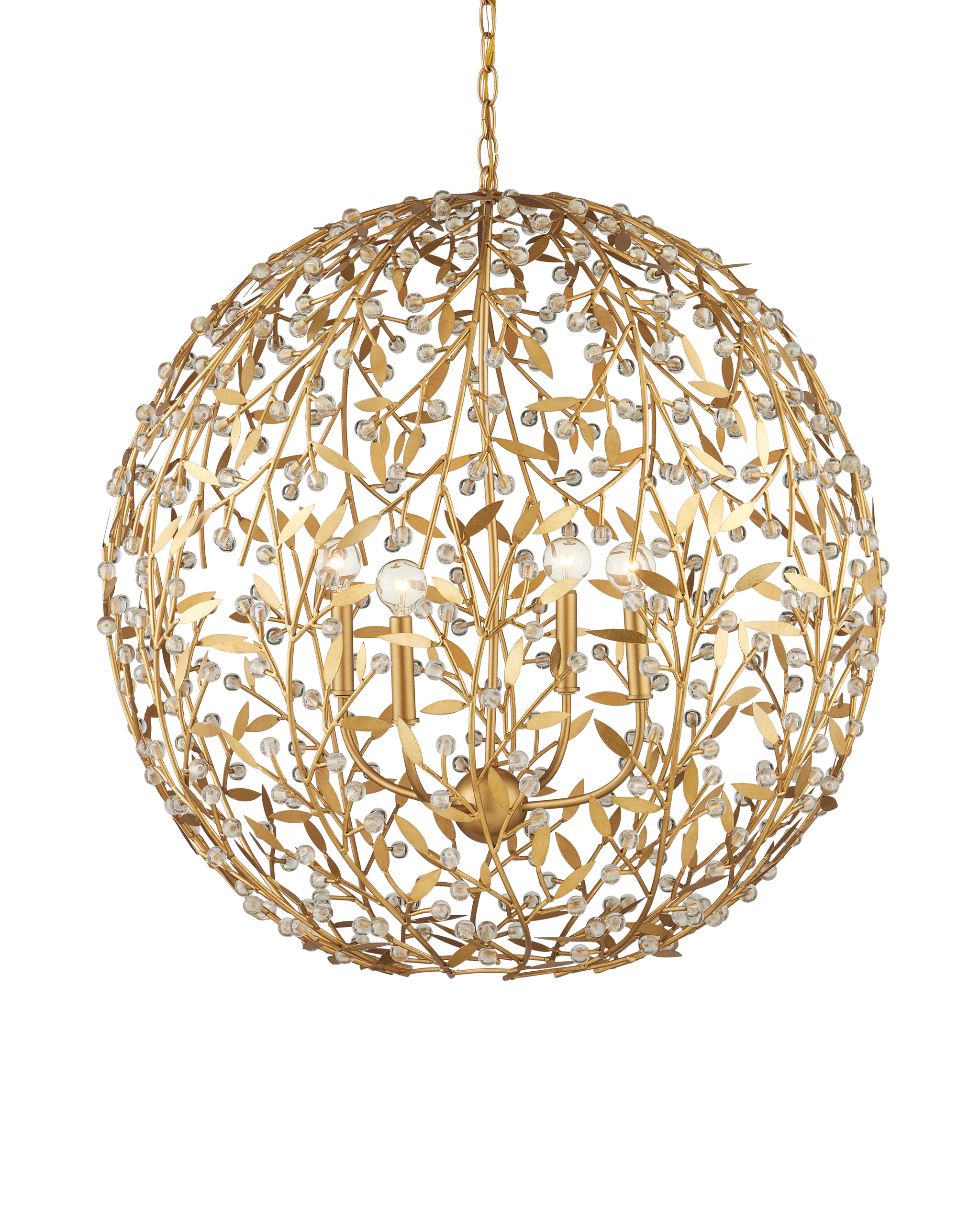 • The Secret Garden Gold Orb Chandelier is a biophilic design with a globe shape created by thin stems fitted with tiny leaves and crystal beads that catch the light. The four-light chandelier is made of wrought iron in a contemporary gold leaf finish, which is hand applied, as are the small glass balls. The 30-inch diameter chandelier is dimmable. Adjustable from 37.5" to 105.5" with use of included chain/rod kit/cable. If your space calls for a longer drop, additional chain/rods/cable is available for purchase.